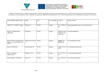 Euroregion Neisse-Nisa-Nysa Projekt jest współfinansowany ze środków Unii Europejskiej w ramach Europejskiego Funduszu Rozwoju Regionalnego oraz ze środków budżetu Państwa przy wsparciu Euroregionu Nysa. Das Projekt ist von der Europäischen Union im Rahmen des Europäischen Regionalen Entwicklungsfonds und von dem Staatshaushalt mit der Unterstützung der Euroregion Neisse finanziert. Art des Objekts (Sterne) Name Straße PLZ Ort / Gemeinde Tel./Fax HOTEL**** QUBUS Legnica Skarbowa 2 59-220 Legnica Tel.: 76-866-21- [email protected] www.qubushotel.com 00, Hotel*** und Restaurant ARKADIA Gliwicka 6 59-220 Legnica Telefon 76-850- www.hotel-arkadia.pl 78-00 Fax 076850-78-02, Hotel** Pałacyk und Restaurant (Residenz von Josef Sailer von 1906) Tadeusza Kościuszki 59-220 37 Legnica Telefon: 76862-04-44, Hotel Nowodworski Nowodworska 30 59-220 Legnica Telefon 76-722- www.hotelnowodworski.pl 09-91 Hotel - Restaurant “Kamieniczka” Młynarska 15-16 59-220 Legnica Tel. 76-723-7392, www.hotel-kamieniczka.pl Hotel Residenz "ANIMAK" Okrzei 14 59-220 Legnica Tel. 76-862-0519 www.hotel-rezydencja.pl 1/12 Internet /E-Mail www.hotelpalacyk.lca.pl/ Euroregion Neisse-Nisa-Nysa Projekt jest współfinansowany ze środków Unii Europejskiej w ramach Europejskiego Funduszu Rozwoju Regionalnego oraz ze środków budżetu Państwa przy wsparciu Euroregionu Nysa. Das Projekt ist von der Europäischen Union im Rahmen des Europäischen Regionalen Entwicklungsfonds und von dem Staatshaushalt mit der Unterstützung der Euroregion Neisse finanziert. Art des Objekts (Sterne) Name Straße PLZ Ort / Gemeinde Tel./Fax Internet /E-Mail Hotel Restaurant "KSIĄŻĘCY" Dworcowa 9 59-220 Legnica Tel. 76-723-9110 www.hotelksiazecy.pl Hotel Sękowski Gliwicka 15 59-220 Legnica Tel. 76-721-3160 www.hotelsekowski.pl Hotelik Parkowy Parkowa 1 59-220 Legnica Tel.76-722-9595, www.hotelikparkowy.pl Übernachtungszentrum "Majorka" Pszeniczna 5 59-220 Legnica Tel. 76-854-0271, Mobil 609 375 906, www.centrum-majorka.legnica.pl Pałac Alberta Pątnówek Pątnówek 38 59-220 Legnica Firma ERKADA Janowska 20 59-220 Legnica Tel. 76-866-3407 Tel. 76-850-20- www.erkada.pl 32, 600 498 641, 604 296 678, Hotelik Villa Ks. Bronisława Gładysza 12 59-220 Legnica 2/12 Tel./Fax 76850-22-23 www.hotelik-villa.pl/ Euroregion Neisse-Nisa-Nysa Projekt jest współfinansowany ze środków Unii Europejskiej w ramach Europejskiego Funduszu Rozwoju Regionalnego oraz ze środków budżetu Państwa przy wsparciu Euroregionu Nysa. Das Projekt ist von der Europäischen Union im Rahmen des Europäischen Regionalen Entwicklungsfonds und von dem Staatshaushalt mit der Unterstützung der Euroregion Neisse finanziert. Art des Objekts (Sterne) Name Straße PLZ Ort / Gemeinde Tel./Fax Internet /E-Mail Szkolne Schronisko Młodzieżowe / Jugendherberge Jordana 17 59-220 Legnica Tel. 76 862-5412, www.ssm.legnica.eu Akademik Miedzianka i Bursa Dla Młodzieży / Schüler- und Studentenwohnheim Żółkiewskiego 8 59-220 Legnica Tel. 76-723-8047, meteor.turystyka.pl/miedzianka,legnica.html Witold und Ewa Wójcik Odrzańska 18 59-220 Legnica Apartment Legnica zentrumsnah Kwatery Pracownicze / Arbeiterunterkünfte Apartments SWISS-POL Ściegiennego 59-220 Legnica Asnyka 59-220 Legnica Środkowa 24/5 59-220 Legnica Tel. 76-855-0593 Tel. 698 304 930 Tel. 698 304 930 Tel. 692-178267 Hotel Pałacyk Witosa 7 59-225 Chojnów Hotel MAX Restaurant Katedralna 2 59-225 Chojnów 3/12 www.swisspol.legnica.pl Telefon 76-818- www.palacyk.biz.pl 17-29, Fax 76818-17-29, Tel. 76-818-14- www.hotelmax.type.pl 59 Euroregion Neisse-Nisa-Nysa Projekt jest współfinansowany ze środków Unii Europejskiej w ramach Europejskiego Funduszu Rozwoju Regionalnego oraz ze środków budżetu Państwa przy wsparciu Euroregionu Nysa. Das Projekt ist von der Europäischen Union im Rahmen des Europäischen Regionalen Entwicklungsfonds und von dem Staatshaushalt mit der Unterstützung der Euroregion Neisse finanziert. Art des Objekts (Sterne) Name Straße PLZ HOTEL "DWOREK" Gniewomierska (Richtung Legnickie Pole) Hotel- Pałac Krotoszyce Tel./Fax Internet /E-Mail Autobahn A4 96 km, Legnickie Pole ul. Gniewomierska (Richtung Legnickie Pole) Tel. 76-858-2088 [email protected], www.hoteldworek.lca.pl Parkowa 3 59-223 Krotoszyce 59-223 Krotoszyce, ul. Parkowa 3 "Zajazd u Beaty i Violetty" / Motel Kawice - Parkplatz 59-230 Prochowice Tel. 76-858-4579, Mobil 512 084 410, Zajazd Kunice / Motel Czarna 59-216 Kunice Pension Pod Kasztanami Miła 29 59-222 4/12 Ort / Gemeinde Tel. 664 273 010 Kochlice/ Gem. Tel. 76-857-03Miłkowice 98, www.zajazd-kawice.pl [email protected] meteor.turystyka.pl/podkasztanami-kochlice,kochlice.html Euroregion Neisse-Nisa-Nysa Projekt jest współfinansowany ze środków Unii Europejskiej w ramach Europejskiego Funduszu Rozwoju Regionalnego oraz ze środków budżetu Państwa przy wsparciu Euroregionu Nysa. Das Projekt ist von der Europäischen Union im Rahmen des Europäischen Regionalen Entwicklungsfonds und von dem Staatshaushalt mit der Unterstützung der Euroregion Neisse finanziert. Art des Objekts (Sterne) Name Straße PLZ Ort / Gemeinde Tel./Fax Internet /E-Mail Zajazd Orlik 94 km. Autobahn A4, an der Abfahrt Legnickie Pole Księżnej Anny 9 59-241 Legnickie Pole Tel. 78-428-5099 www.zajazdorlik.com.pl Zajazd Nad Stawami / Motel Krzywa, 59-225 Chojnów Tel. 664 273 010 www.nadstawami-krzywa.e-meteor.pl/ Gminny Ośrodek Kultury i Rekreacji w Piotrowicach / Gemeindekulturzentrum Ośrodek Wypoczynkowy w Rokitkach / Erholungszentrum Piotrowice 16, 59-225 Chojnów Tel. 76-818-7045 www.osrodek-piotrowice.pl Rokitki 59-225 Chojnów Tel. 698 304 930 meteor.turystyka.pl/domki-rokitki,rokitki.html Ośrodek Wypoczynkowy Jezierzany / Erholungszentrum Jezierzany 59-222 Miłkowice Tel. 76-857-0364 ow-jezierzany.e-meteor.pl Motel Pati Baza PKS Autobahn A4 Legnica Henryka Brodatego 7 59-241 Legnica Słoneczna Kunice Tel. 664 273 010 Tel. 76-858-2827 Tel. 76-857-5476 Camping Nr. 234 Ośr