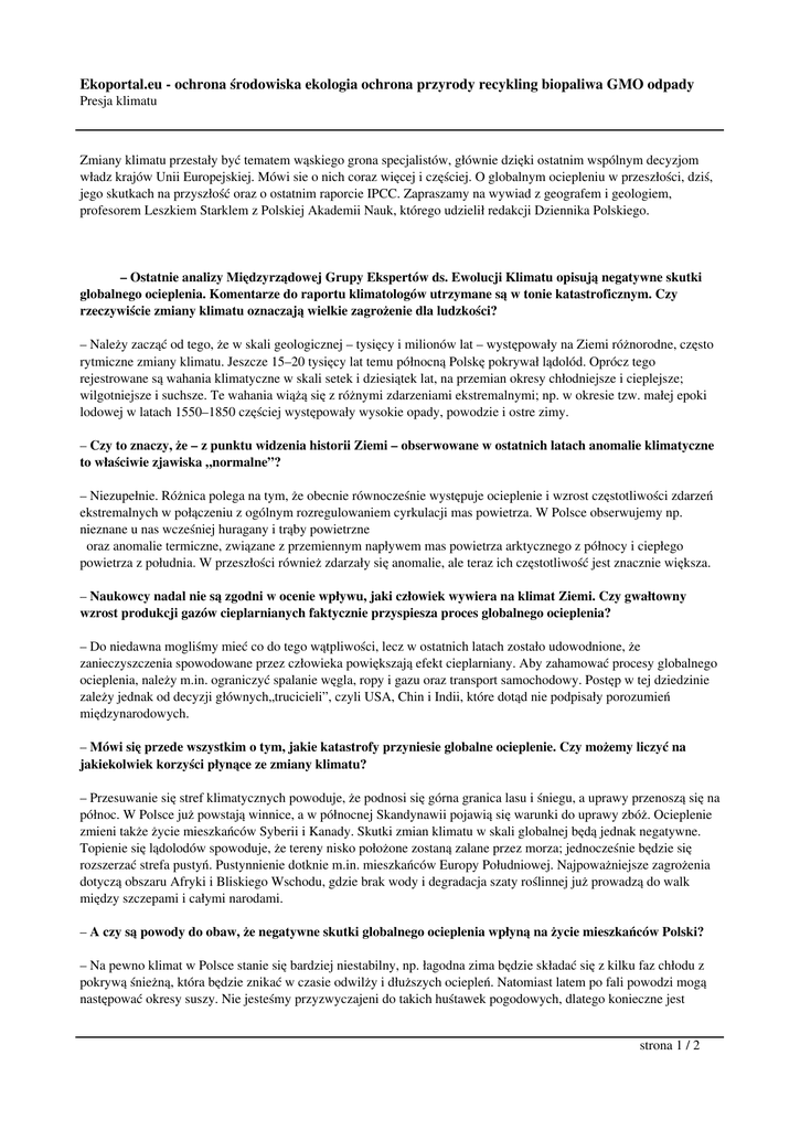 Ekoportal.eu - ochrona środowiska ekologia ochrona przyrody recykling biopaliwa GMO odpady Presja klimatu Zmiany klimatu przestały być tematem wąskiego grona specjalistów, głównie dzięki ostatnim wspólnym decyzjom władz krajów Unii Europejskiej. Mówi sie o nich coraz więcej i częściej. O globalnym ociepleniu w przeszłości, dziś, jego skutkach na przyszłość oraz o ostatnim raporcie IPCC. Zapraszamy na wywiad z geografem i geologiem, profesorem Leszkiem Starklem z Polskiej Akademii Nauk, którego udzielił redakcji Dziennika Polskiego. – Ostatnie analizy Międzyrządowej Grupy Ekspertów ds. Ewolucji Klimatu opisują negatywne skutki globalnego ocieplenia. Komentarze do raportu klimatologów utrzymane są w tonie katastroficznym. Czy rzeczywiście zmiany klimatu oznaczają wielkie zagrożenie dla ludzkości? – Należy zacząć od tego, że w skali geologicznej – tysięcy i milionów lat – występowały na Ziemi różnorodne, często rytmiczne zmiany klimatu. Jeszcze 15–20 tysięcy lat temu północną Polskę pokrywał lądolód. Oprócz tego rejestrowane są wahania klimatyczne w skali setek i dziesiątek lat, na przemian okresy chłodniejsze i cieplejsze; wilgotniejsze i suchsze. Te wahania wiążą się z różnymi zdarzeniami ekstremalnymi; np. w okresie tzw. małej epoki lodowej w latach 1550–1850 częściej występowały wysokie opady, powodzie i ostre zimy. – Czy to znaczy, że – z punktu widzenia historii Ziemi – obserwowane w ostatnich latach anomalie klimatyczne to właściwie zjawiska „normalne”? – Niezupełnie. Różnica polega na tym, że obecnie równocześnie występuje ocieplenie i wzrost częstotliwości zdarzeń ekstremalnych w połączeniu z ogólnym rozregulowaniem cyrkulacji mas powietrza. W Polsce obserwujemy np. nieznane u nas wcześniej huragany i trąby powietrzne oraz anomalie termiczne, związane z przemiennym napływem mas powietrza arktycznego z północy i ciepłego powietrza z południa. W przeszłości również zdarzały się anomalie, ale teraz ich częstotliwość jest znacznie większa. – Naukowcy nadal nie są zgodni w ocenie wpływu, jaki człowiek wywiera na klimat Ziemi. Czy gwałtowny wzrost produkcji gazów cieplarnianych faktycznie przyspiesza proces globalnego ocieplenia? – Do niedawna mogliśmy mieć co do tego wątpliwości, lecz w ostatnich latach zostało udowodnione, że zanieczyszczenia spowodowane przez człowieka powiększają efekt cieplarniany. Aby zahamować procesy globalnego ocieplenia, należy m.in. ograniczyć spalanie węgla, ropy i gazu oraz transport samochodowy. Postęp w tej dziedzinie zależy jednak od decyzji głównych„trucicieli”, czyli USA, Chin i Indii, które dotąd nie podpisały porozumień międzynarodowych. – Mówi się przede wszystkim o tym, jakie katastrofy przyniesie globalne ocieplenie. Czy możemy liczyć na jakiekolwiek korzyści płynące ze zmiany klimatu? – Przesuwanie się stref klimatycznych powoduje, że podnosi się górna granica lasu i śniegu, a uprawy przenoszą się na północ. W Polsce już powstają winnice, a w północnej Skandynawii pojawią się warunki do uprawy zbóż. Ocieplenie zmieni także życie mieszkańców Syberii i Kanady. Skutki zmian klimatu w skali globalnej będą jednak negatywne. Topienie się lądolodów spowoduje, że tereny nisko położone zostaną zalane przez morza; jednocześnie będzie się rozszerzać strefa pustyń. Pustynnienie dotknie m.in. mieszkańców Europy Południowej. Najpoważniejsze zagrożenia dotyczą obszaru Afryki i Bliskiego Wschodu, gdzie brak wody i degradacja szaty roślinnej już prowadzą do walk między szczepami i całymi narodami. – A czy są powody do obaw, że negatywne skutki globalnego ocieplenia wpłyną na życie mieszkańców Polski? – Na pewno klimat w Polsce stanie się bardziej niestabilny, np. łagodna zima będzie składać się z kilku faz chłodu z pokrywą śnieżną, która będzie znikać w czasie odwilży i dłuższych ociepleń. Natomiast latem po fali powodzi mogą następować okresy suszy. Nie jesteśmy przyzwyczajeni do takich huśtawek pogodowych, dlatego konieczne jest strona 1 / 2 Ekoportal.eu - ochrona środowiska ekologia ochrona przyrody recykling biopaliwa GMO odpady Presja klimatu przekształcenie struktur prognozowania i przeciwdziałania zdarzeniom ekstremalnym. Przeciętny obywatel musi nauczyć się żyć w warunkach zmian przyrodniczych, co dla wielu może oznaczać zmianę zatrudnienia i miejsca zamieszkania. Źródło: Dziennik Polski strona 2 / 2