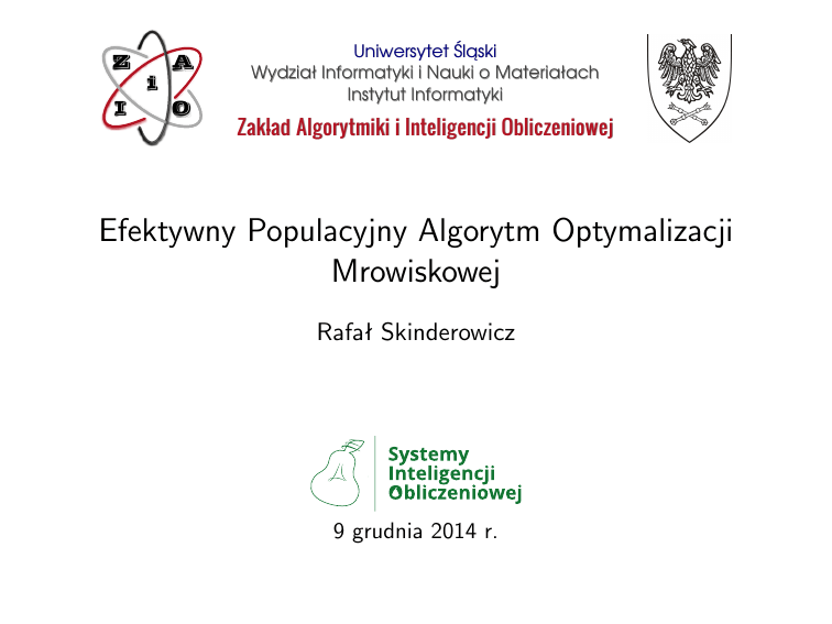 Z I i A O Uniwersytet Śląski Wydział Informatyki i Nauki o Materiałach Instytut Informatyki Zakład Algorytmiki i Inteligencji Obliczeniowej Efektywny Populacyjny Algorytm Optymalizacji Mrowiskowej Rafał Skinderowicz 9 grudnia 2014 r. Populacyjny ACO Modyfikacja reguły przejścia Eksperymenty obliczeniowe Podsumowanie Plan prezentacji 1 Populacyjny ACO 2 Modyfikacja reguły przejścia 3 Eksperymenty obliczeniowe 4 Podsumowanie 2 / 24 Populacyjny ACO Modyfikacja reguły przejścia Eksperymenty obliczeniowe Podsumowanie Motywacje • Obserwacja zachowania mrówek poszukujących pożywienia zainspirowała • • • • Marco Dorigo do opracowania systemu mrówkowego (ang. Ant System) w 1991 r. Od tego czasu zaproponowano wiele usprawnionych algorytmów inspirowanych zachowaniami mrówek, m.in.: system mrowiskowy (ang. Ant Colony System, Dorigo, 1996), MAX-MIN Ant System (Stützle, 1997), Approximate Nondeterministic Tree Search (Maniezzo, 1999), populacyjny algorytm optymalizacji mrowiskowej (ang. Population-based ACO ,Guntsch, 2002), Beam ACO (Blum, 2005), ACOR (Socha, 2006) Algorytmy z rodziny ACO stosowane były z powodzeniem do znajdowania przybliżonych rozwiązań wielu trudnych problemów optymalizacji kombinatorycznej oraz ciągłej (ACOR ) Populacyjny ACO (PACO) należy do najbardziej efektywnych algorytmów mrówkowych1 Unikalne cechy algorytmu PACO umożliwiają implementację efektywną zarówno pod względem kosztu obliczeniowego, jak i zajętości pamięci 1 Oliveira, Sabrina M., et al. ”A detailed analysis of the population-based ant colony optimization algorithm for the TSP and the QAP.” Proceedings of the 13th annual conference companion on Genetic and evolutionary computation. ACM, 2011. 3 / 24 Populacyjny ACO Modyfikacja reguły przejścia Eksperymenty obliczeniowe Podsumowanie Populacyjny ACO Algorytm PACO ma strukturę podobną do algorytmu ACS: • sztuczne mrówki konstruują w sposób iteracyjny rozwiązania rozpatrywanego problemu; • mrówki kooperują pośrednio (stygmergia) poprzez sztuczny ślad feromonowy; • mrówki rozszerzają swoje częściowe rozwiązania o kolejne komponenty wybierane na podstawie dostępnej wiedzy o problemie (informacji heurystycznej) oraz śladów feromonowych; • wszystkie ślady feromonowe tworzą pamięć feromonową. 4 / 24 Populacyjny ACO Modyfikacja reguły przejścia Eksperymenty obliczeniowe Podsumowanie Proces budowy rozwiązania • Mrówka znajdująca się w węźle i wybiera kolejny węzeł j na podstawie informacji heurystycznej o problemie oraz wartości feromonu na krawędziach łączących węzły, zgodnie z pseudo-losową regułą przejścia: j= arg maxl∈J i [τil ] · [ηil ]β , gdy q ¬ q0 J, if q > q0 , k • Gdy q ¬ q0 wybór jest zachłanny • Gdy q > q0 wybór jest losowy – kolejny komponent J wybierany jest z prawdopodobieństwem określonym przez: P(J|i) = [τiJ ] · [ηiJ ]β P l∈J i k [τil ] · [ηil ]β . i a c d b τij – wartość feromonu dla krawędzi (i, j) ηij – wart. wynikająca z informacji heurystycznej. Dla problmu TSP równa jest: d1 , gdzie dij oznacza odl. pomiędzy ij miastami i oraz j. 5 / 24 Populacyjny ACO Modyfikacja reguły przejścia Eksperymenty obliczeniowe Podsumowanie PACO – pamięć feromonowa • Pamięć feromonowa w Populacyjnym ACO definiowana jest za pomocą populacji rozwiązań przechowywanych w archiwum rozwiązań • Wartości śladów feromonowych zależą bezpośrednio od zawartości archiwum i mogą być na jej podstawie wyznaczone • Najlepsze rozwiązanie z każdej iteracji może zostać dodane do populacji jeżeli spełnia kryteria określone przez przyjętą strategię aktualizacji • Rozmiar populacji jest ograniczony – nowe rozwiązanie zastępuje jedno z poprzednich, gdy osiągnięto zadany limit rozmiaru • Zapisywanie wartości śladów feromonowych w macierzy feromonowej jest opcjonalne 6 / 24 Populacyjny ACO Modyfikacja reguły przejścia Eksperymenty obliczeniowe Podsumowanie Strategie aktualizacji populacji rozwiązań Trzy najbardziej znane i najczęściej rozpatrywane w literaturze strategie aktualizacji populacji rozwiązań to2 : • strategia czasowa – działa jak kolejka (FIFO). Po każdej iteracji najlepsze znalezione podczas niej rozwiązanie jest włączane do populacji, zastępując najstarsze rozwiązanie w przypadku osiągnięcia limitu rozmiaru; • strategia jakościowa – rozwiązanie jest włączane do populacji, jeżeli jest lepszej jakości niż najgorsze z rozwiązań w populacji; • strategia elitarna – działa podobnie do strategi czasowej, ale najlepsze rozwiązanie zawsze jest przechowywane w populacji, nawet jeżeli jest najstarsze. 2 Guntsch, Michael, and Martin Middendorf. ”A population based approach for ACO.” Applications of Evolutionary Computing. Springer Berlin Heidelberg, 2002. 72-81. 7 / 24 Populacyjny ACO Modyfikacja reguły przejścia Eksperymenty obliczeniowe Podsumowanie Pamięć feromonowa w algorytmie PACO • Wartość śladu feromonowego w algorytmie PACO definiowana jest jako: τij = τ0 + ∆ K X wk · Iijk , k=1 gdzie ∆= τmax − τ0 ; K • K – rozmiar populacji rozwiązań; • Iijk – wskaźnik przynależności krawędzi do rozwiązania, równy jeden, gdy krawędź (i, j) należy do k-tego rozwiązania populacji i zero w przeciwnym przypadku • wk – waga k-tego rozwiązania • τmax – parametr określający maksymalną wartość feromonu • Dodanie rozwiązania do populacji skutkuje zwiększeniem wartości feromonu na krawędziach rozwiązania o wartość ∆ • Usunięcie rozwiązania z populacji powoduje zmniejszenie wartości feromonu na krawędziach należących do rozwiązania o wartość ∆ 8 / 24 Populacyjny ACO Modyfikacja reguły przejścia Eksperymenty obliczeniowe Podsumowanie Optymalizacja reguły przejścia w PACO • Reguła przejścia (wyboru) kolejnego węzła ma kluczowe znaczenie w algorytmie PACO • Jest stosowana n − 1 razy dla k