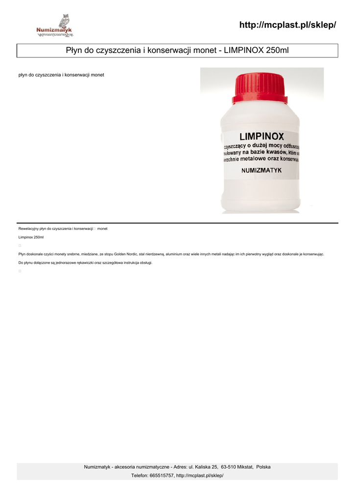 http://mcplast.pl/sklep/ Płyn do czyszczenia i konserwacji monet - LIMPINOX 250ml płyn do czyszczenia i konserwacji monet Rewelacyjny płyn do czyszczenia i konserwacji monet Limpinox 250ml Płyn doskonale czyści monety srebrne, miedziane, ze stopu Golden Nordic, stal nierdzewną, aluminium oraz wiele innych metali nadając im ich pierwotny wygląd oraz doskonale je konserwując. Do płynu dołączone są jednorazowe rękawiczki oraz szczegółowa instrukcja obsługi. Numizmatyk - akcesoria numizmatyczne - Adres: ul. Kaliska 25, 63-510 Mikstat, Polska Telefon: 665515757, http://mcplast.pl/sklep/