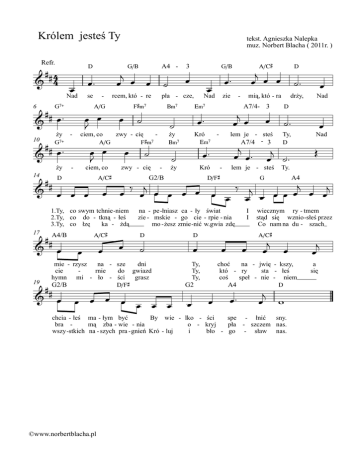 Królem jesteś Ty Refr. D Nad se G7& 6 14 ży - A/G ży G7& 10 G/B tekst. Agnieszka Nalepka muz. Norbert Blacha ( 2011r. ) rcem, któ - re - ciem, co A/C© A4/B A/C© zwy - cię - Nad - D mią, któ - ra drży, A7/4- 3 ży B‹7 Kró E‹7 Kró ży A/C© zie E‹7 - Nad lem je - steś A7/4 - 3 Ty, D lem je - steś Ty. G Nad A4 na - pe -łniasz ca - ły świat zie - mskie - go cie - rpie - nia mo - żesz zmie -nić w.gwia zdę D D Ty, Ty, Ty, G2 I I wiecznym ry - tmem stąd się wznio -słeś przez Co nam na du - szach A/C© choć na - jwię - kszy, któ - ry sta - łeś coś speł - nie - niem A4 D chcia - łeś ma - łym być By wie - lko - ści spe - łnić sny. bra mą zba - wie - nia o - kryj pła - szczem nas. wszy -stkich na - szych pra - gnień Kró - luj i bło - go - sław nas. ©www.norbertblacha.pl D D/F© G2/B mie - rzysz na - sze dni cie rnie do gwiazd hymn mi - ło - ści grasz G2/B D/F© B‹7 G/B 3 pła - cze, F©‹7 1.Ty, co swym tchnie -niem 2.Ty, co do - tkną - łeś 3.Ty, co łzę ka - żdą 19 ciem, co zwy - cię A/G F©‹7 D 17 A4 - a się