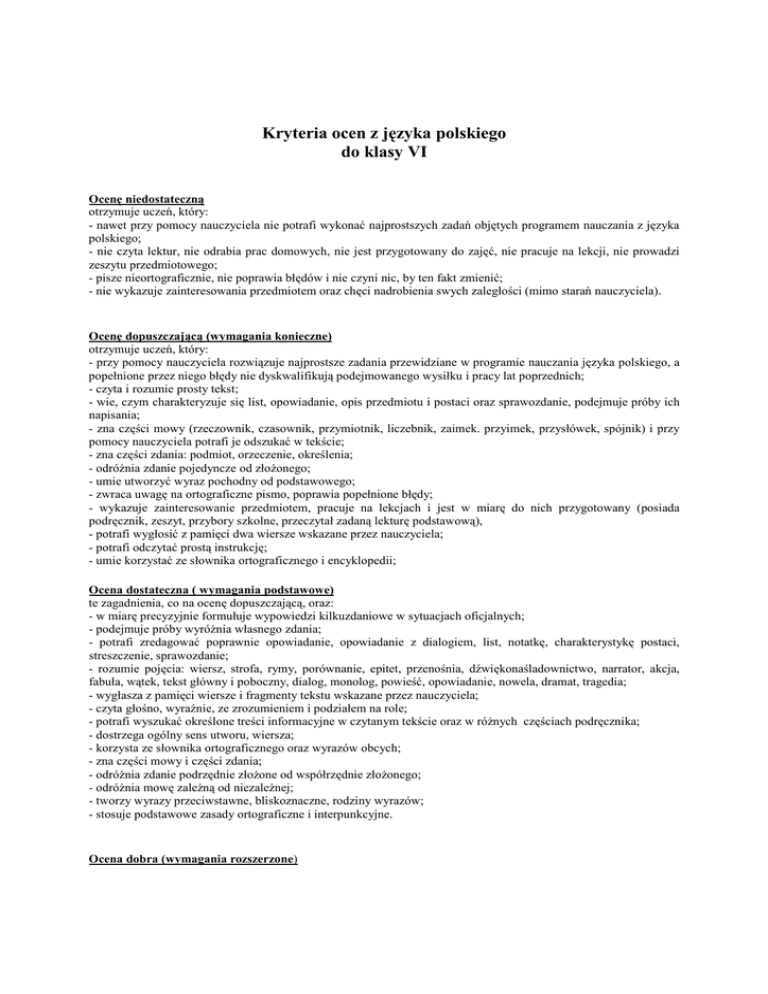 Kryteria ocen z języka polskiego do klasy VI Ocenę niedostateczną otrzymuje uczeń, który: - nawet przy pomocy nauczyciela nie potrafi wykonać najprostszych zadań objętych programem nauczania z języka polskiego; - nie czyta lektur, nie odrabia prac domowych, nie jest przygotowany do zajęć, nie pracuje na lekcji, nie prowadzi zeszytu przedmiotowego; - pisze nieortograficznie, nie poprawia błędów i nie czyni nic, by ten fakt zmienić; - nie wykazuje zainteresowania przedmiotem oraz chęci nadrobienia swych zaległości (mimo starań nauczyciela). Ocenę dopuszczającą (wymagania konieczne) otrzymuje uczeń, który: - przy pomocy nauczyciela rozwiązuje najprostsze zadania przewidziane w programie nauczania języka polskiego, a popełnione przez niego błędy nie dyskwalifikują podejmowanego wysiłku i pracy lat poprzednich; - czyta i rozumie prosty tekst; - wie, czym charakteryzuje się list, opowiadanie, opis przedmiotu i postaci oraz sprawozdanie, podejmuje próby ich napisania; - zna części mowy (rzeczownik, czasownik, przymiotnik, liczebnik, zaimek. przyimek, przysłówek, spójnik) i przy pomocy nauczyciela potrafi je odszukać w tekście; - zna części zdania: podmiot, orzeczenie, określenia; - odróżnia zdanie pojedyncze od złożonego; - umie utworzyć wyraz pochodny od podstawowego; - zwraca uwagę na ortograficzne pismo, poprawia popełnione błędy; - wykazuje zainteresowanie przedmiotem, pracuje na lekcjach i jest w miarę do nich przygotowany (posiada podręcznik, zeszyt, przybory szkolne, przeczytał zadaną lekturę podstawową), - potrafi wygłosić z pamięci dwa wiersze wskazane przez nauczyciela; - potrafi odczytać prostą instrukcję; - umie korzystać ze słownika ortograficznego i encyklopedii; Ocena dostateczna ( wymagania podstawowe) te zagadnienia, co na ocenę dopuszczającą, oraz: - w miarę precyzyjnie formułuje wypowiedzi kilkuzdaniowe w sytuacjach oficjalnych; - podejmuje próby wyróżnia własnego zdania; - potrafi zredagować poprawnie opowiadanie, opowiadanie z dialogiem, list, notatkę, charakterystykę postaci, streszczenie, sprawozdanie; - rozumie pojęcia: wiersz, strofa, rymy, porównanie, epitet, przenośnia, dźwiękonaśladownictwo, narrator, akcja, fabuła, wątek, tekst główny i poboczny, dialog, monolog, powieść, opowiadanie, nowela, dramat, tragedia; - wygłasza z pamięci wiersze i fragmenty tekstu wskazane przez nauczyciela; - czyta głośno, wyraźnie, ze zrozumieniem i podziałem na role; - potrafi wyszukać określone treści informacyjne w czytanym tekście oraz w różnych częściach podręcznika; - dostrzega ogólny sens utworu, wiersza; - korzysta ze słownika ortograficznego oraz wyrazów obcych; - zna części mowy i części zdania; - odróżnia zdanie podrzędnie złożone od współrzędnie złożonego; - odróżnia mowę zależną od niezależnej; - tworzy wyrazy przeciwstawne, bliskoznaczne, rodziny wyrazów; - stosuje podstawowe zasady ortograficzne i interpunkcyjne. Ocena dobra (wymagania rozszerzone) te same zagadnienia, co na ocenę dostateczną oraz: - uczeń buduje wyczerpujące odpowiedzi w sytuacjach oficjalnych; - bierze udział w dyskusji jako odbiorca i nadawca wypowiedzi; - wygłasza rolę w inscenizacjach; - czyta poprawnie; -korzysta ze słowników (oprócz wymienionych w wymaganiach podstawowych): słownika wyrazów bliskoznacznych, słownika poprawnej polszczyzny, słownika frazeologicznego); - potrafi samodzielnie gromadzić materiały na określony temat, selekcjonuje je, umie znaleźć błędy językowe we wskazanym tekście; - opanował podstawowe pojęcia z nauki o języku podane w programie nauczania przedmiotu i stosuje je w wypowiedziach ustnych i pisemnych; - dokonuje rozbioru gramatycznego i logicznego zdań pojedynczych i złożonych na prostych przykładach; - oddziela podstawę słowotwórczą od formantu, nazywa formanty, wskazuje rdzeń, robi proste wykresy rodziny wyrazów; - pisze poprawnie pod względem ortograficznym i interpunkcyjnym, doskonali pisownię. Ocena bardzo dobra (wymagania pełne) te same zagadnienia, co na ocenę dobrą oraz: - uczeń aktywie uczestniczy w dyskusji, prezentując własny punkt widzenia: wspiera swoja wypowiedź cytatami, opowiada w sposób uporządkowany; - perfekcyjnie opanował formy wypowiedzi wymienione w wymaganiach na ocenę dobrą; - czyta biegle, poprawnie, ze zrozumieniem; - zna język filmu i teatru, porównuje go z językiem literatury; - opanował pełny zakres wiadomości i umiejętności z nauki o języku, określony w programie nauczania; - opanował perfekcyjnie zasady ortografii i interpunkcji. Ocena celująca ( wymagania wykraczające) - uczeń nie tylko opanował pełny zakres umiejętności i wiadomości przewidziany przez program nauczania, ale wykazuje się zainteresowaniem przedmiotu poszerzając swoje wiadomości z zakresu literatury; - czyta dodatkowe lektury; - śledzi dane zagadnienia w czasopismach; - bierze udział w konkursach polonistycznych osiągając wysokie sukcesy; - podejmuje próby pisarskie, pracuje jako redaktor w gazetce klasowej, szkolnej; - przygotowuje uroczystości szkolne.