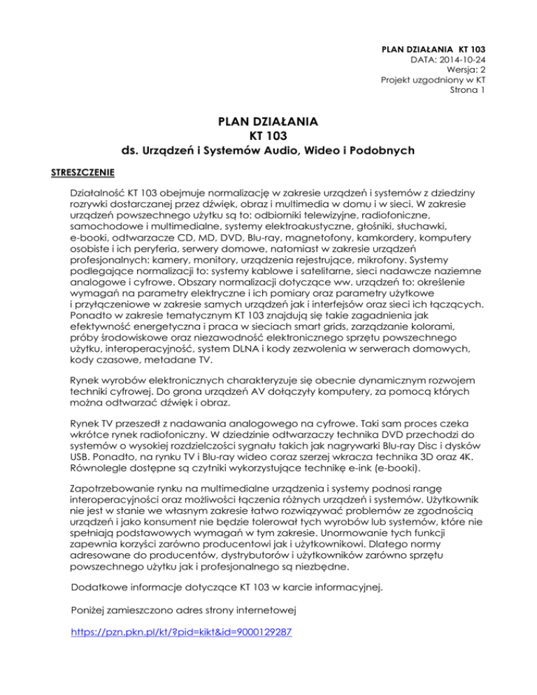 PLAN DZIAŁANIA KT 103 DATA: 2014-10-24 Wersja: 2 Projekt uzgodniony w KT Strona 1 PLAN DZIAŁANIA KT 103 ds. Urządzeń i Systemów Audio, Wideo i Podobnych STRESZCZENIE Działalność KT 103 obejmuje normalizację w zakresie urządzeń i systemów z dziedziny rozrywki dostarczanej przez dźwięk, obraz i multimedia w domu i w sieci. W zakresie urządzeń powszechnego użytku są to: odbiorniki telewizyjne, radiofoniczne, samochodowe i multimedialne, systemy elektroakustyczne, głośniki, słuchawki, e-booki, odtwarzacze CD, MD, DVD, Blu-ray, magnetofony, kamkordery, komputery osobiste i ich peryferia, serwery domowe, natomiast w zakresie urządzeń profesjonalnych: kamery, monitory, urządzenia rejestrujące, mikrofony. Systemy podlegające normalizacji to: systemy kablowe i satelitarne, sieci nadawcze naziemne analogowe i cyfrowe. Obszary normalizacji dotyczące ww. urządzeń to: określenie wymagań na parametry elektryczne i ich pomiary oraz parametry użytkowe i przyłączeniowe w zakresie samych urządzeń jak i interfejsów oraz sieci ich łączących. Ponadto w zakresie tematycznym KT 103 znajdują się takie zagadnienia jak efektywność energetyczna i praca w sieciach smart grids, zarządzanie kolorami, próby środowiskowe oraz niezawodność elektronicznego sprzętu powszechnego użytku, interoperacyjność, system DLNA i kody zezwolenia w serwerach domowych, kody czasowe, metadane TV. Rynek wyrobów elektronicznych charakteryzuje się obecnie dynamicznym rozwojem techniki cyfrowej. Do grona urządzeń AV dołączyły komputery, za pomocą których można odtwarzać dźwięk i obraz. Rynek TV przeszedł z nadawania analogowego na cyfrowe. Taki sam proces czeka wkrótce rynek radiofoniczny. W dziedzinie odtwarzaczy technika DVD przechodzi do systemów o wysokiej rozdzielczości sygnału takich jak nagrywarki Blu-ray Disc i dysków USB. Ponadto, na rynku TV i Blu-ray wideo coraz szerzej wkracza technika 3D oraz 4K. Równolegle dostępne są czytniki wykorzystujące technikę e-ink (e-booki). Zapotrzebowanie rynku na multimedialne urządzenia i systemy podnosi rangę interoperacyjności oraz możliwości łączenia różnych urządzeń i systemów. Użytkownik nie jest w stanie we własnym zakresie łatwo rozwiązywać problemów ze zgodnością urządzeń i jako konsument nie będzie tolerował tych wyrobów lub systemów, które nie spełniają podstawowych wymagań w tym zakresie. Unormowanie tych funkcji zapewnia korzyści zarówno producentowi jak i użytkownikowi. Dlatego normy adresowane do producentów, dystrybutorów i użytkowników zarówno sprzętu powszechnego użytku jak i profesjonalnego są niezbędne. Dodatkowe informacje dotyczące KT 103 w karcie informacyjnej. Poniżej zamieszczono adres strony internetowej https://pzn.pkn.pl/kt/?pid=kikt&id=9000129287 PLAN DZIAŁANIA KT 103 DATA: 2014-10-24 Wersja: 2 Projekt uzgodniony w KT Strona 2 1 ŚRODOWISKO BIZNESOWE KT 1.1 Opis środowiska biznesowego Na działalność gospodarczą objętą zakresem KT znaczący wpływ mają następujące uwarunkowania: polityczne, gospodarcze, techniczne, prawne, społeczne lub aspekty regionalne i międzynarodowe: W zakresie radiodyfuzji, czyli radiofonii i telewizji, uregulowania krajowe i międzynarodowe mają zasadnicze znaczenie dla funkcjonowania nadawców publicznych i prywatnych. Regulacje międzynarodowe dotyczą planów częstotliwościowych i standardów emisyjnych a krajowe koncesji dla nadawców. Środowisko biznesowe radiodyfuzji składa się z rynku nadawców RTV i rynku sprzętu odbiorczego. W zakresie nadawania jest to działalność koncesjonowana i ściśle regulowana przez Państwo. Radiodyfuzja jako dziedzina telekomunikacji opiera się na standardach ustalanych a priori. Sprzęt odbiorczy podlega ogólnym regulacjom dot. znaku CE i wymaganiom technicznym opartym na normach IEC zapewniających minimum interoperacyjności w zakresie odbioru i połączeń, ekoprojektowania i efektywności energetycznej. Obecnie jesteśmy już po zakończeniu procesu cyfryzacji naziemnych emisji telewizyjnych wymaganej przez Konferencję RRC-06. Wymagania technicznoeksploatacyjne na sprzęt do odbioru naziemnej telewizji cyfrowej opierają się na PN-EN 62216 i są w Polsce obligatoryjne ze względu na określenie ich w rozporządzeniu MI z dnia 18 grudnia 2009 r. w sprawie wymagań technicznych i eksploatacyjnych dla urządzeń konsumenckich służących do odbioru cyfrowych naziemnych transmisji telewizyjnych (Dz. U. Nr 221, poz. 1742). Natomiast ustawa z dnia 30 czerwca 2011 r. o wdrożeniu naziemnej telewizji cyfrowej (Dz. U. Nr 153, poz. 903) wprowadzała do 31 lipca 2014 roku sankcje za wprowadzanie na rynek sprzętu niespełniającego wymagań ww. rozporządzenia MI. W zakresie rozwoju techniki telewizyjnej na najbliższe lata należy się spodziewać standaryzacji tzw. Smart TV oraz HAN (Home Area Network) ze względu na rozwój Smart Grids i innych technik poprawiających jakość życia jak np. AAL czy Internet Rzeczy oraz ułatwień dostępu dla osób z deficytem wzroku i słuchu. Pierwszą normą z tego zakresu jaka się ukazała jest PN-EN 62731:2013-10E Synteza mowy w telewizji -Wymagania ogólne. W zakresie radiofonii rozpoczęło się wdrażanie naziemnej radiofonii cyfrowej w standardzie DAB+ zgodnie z normami ETSI. Na obecnym etapie standaryzacja sprzętu odbiorczego w Europie polega na dobrowolnych porozumieniach nadawców i producentów sprzętu pod egidą WorldDAB, EBU i DIGITALEUROPE. W Polsce szeroka możliwość uruchamiania radiofonii cyfrowej pojawiła się po 31 lipca 2013 roku, po wyłączeniu ostatnich nadajników TV analogowej. KRRiT 10 czerwca 2014 roku przyjęła rekomendacje dla nadawców i producentów odbiorników radiofonii cyfrowej. Dokument „Minimalne Wymagania Techniczne i Eksploatacyjne dla Odbiornika Radiofonii Cyfrowej DAB+” opisuje podstawowe parametry i wymagania dla PLAN DZIAŁANIA KT 103 DATA: 2014-10-24 Wersja: 2 Projekt uzgodnion