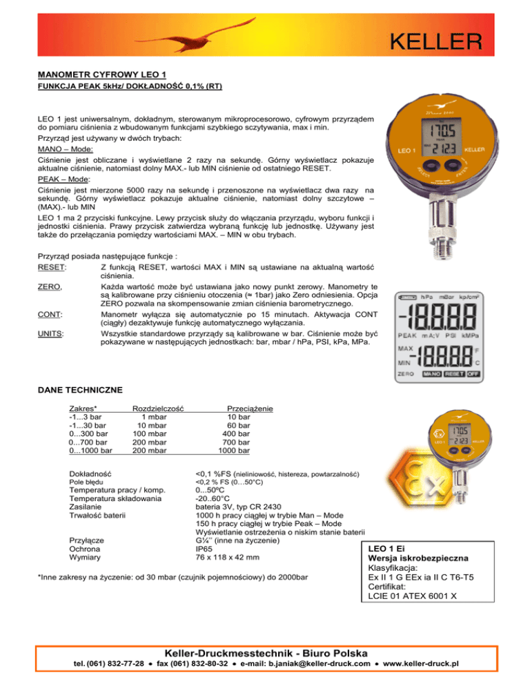 MANOMETR CYFROWY LEO 1 FUNKCJA PEAK 5kHz/ DOKŁADNOŚĆ 0,1% (RT) LEO 1 jest uniwersalnym, dokładnym, sterowanym mikroprocesorowo, cyfrowym przyrządem do pomiaru ciśnienia z wbudowanym funkcjami szybkiego sczytywania, max i min. Przyrząd jest używany w dwóch trybach: MANO – Mode: Ciśnienie jest obliczane i wyświetlane 2 razy na sekundę. Górny wyświetlacz pokazuje aktualne ciśnienie, natomiast dolny MAX.- lub MIN ciśnienie od ostatniego RESET. PEAK – Mode: Ciśnienie jest mierzone 5000 razy na sekundę i przenoszone na wyświetlacz dwa razy na sekundę. Górny wyświetlacz pokazuje aktualne ciśnienie, natomiast dolny szczytowe – (MAX).- lub MIN LEO 1 ma 2 przyciski funkcyjne. Lewy przycisk służy do włączania przyrządu, wyboru funkcji i jednostki ciśnienia. Prawy przycisk zatwierdza wybraną funkcję lub jednostkę. Używany jest także do przełączania pomiędzy wartościami MAX. – MIN w obu trybach. Przyrząd posiada następujące funkcje : RESET: Z funkcją RESET, wartości MAX i MIN są ustawiane na aktualną wartość ciśnienia. Każda wartość może być ustawiana jako nowy punkt zerowy. Manometry te ZERO, są kalibrowane przy ciśnieniu otoczenia (≈ 1bar) jako Zero odniesienia. Opcja ZERO pozwala na skompensowanie zmian ciśnienia barometrycznego. CONT: Manometr wyłącza się automatycznie po 15 minutach. Aktywacja CONT (ciągły) dezaktywuje funkcję automatycznego wyłączania. UNITS: Wszystkie standardowe przyrządy są kalibrowane w bar. Ciśnienie może być pokazywane w następujących jednostkach: bar, mbar / hPa, PSI, kPa, MPa. DANE TECHNICZNE Zakres* -1...3 bar -1...30 bar 0...300 bar 0...700 bar 0...1000 bar Rozdzielczość 1 mbar 10 mbar 100 mbar 200 mbar 200 mbar Przeciążenie 10 bar 60 bar 400 bar 700 bar 1000 bar Dokładność <0,1 %FS (nieliniowość, histereza, powtarzalność) Pole błędu <0,2 % FS (0…50°C) Temperatura pracy / komp. Temperatura składowania Zasilanie Trwałość baterii 0...50ºC -20..60°C bateria 3V, typ CR 2430 1000 h pracy ciągłej w trybie Man – Mode 150 h pracy ciągłej w trybie Peak – Mode Wyświetlanie ostrzeżenia o niskim stanie baterii G¼’’ (inne na życzenie) IP65 LEO 1 Ei 76 x 118 x 42 mm Wersja iskrobezpieczna Przyłącze Ochrona Wymiary *Inne zakresy na życzenie: od 30 mbar (czujnik pojemnościowy) do 2000bar Klasyfikacja: Ex II 1 G EEx ia II C T6-T5 Certifikat: LCIE 01 ATEX 6001 X Keller-Druckmesstechnik - Biuro Polska tel. (061) 832-77-28 • fax (061) 832-80-32 • e-mail: [email protected] • www.keller-druck.pl