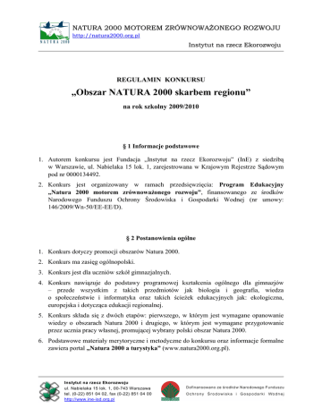 NATURA 2000 MOTOREM ZRÓWNOWAśONEGO ROZWOJU http://natura2000.org.pl Instytut na rzecz Ekorozwoju REGULAMIN KONKURSU „Obszar NATURA 2000 skarbem regionu” na rok szkolny 2009/2010 § 1 Informacje podstawowe 1. Autorem konkursu jest Fundacja „Instytut na rzecz Ekorozwoju” (InE) z siedzibą w Warszawie, ul. Nabielaka 15 lok. 1, zarejestrowana w Krajowym Rejestrze Sądowym pod nr 0000134492. 2. Konkurs jest organizowany w ramach przedsięwzięcia: Program Edukacyjny „Natura 2000 motorem zrównowaŜonego rozwoju”, finansowanego ze środków Narodowego Funduszu Ochrony Środowiska i Gospodarki Wodnej (nr umowy: 146/2009/Wn-50/EE-EE/D). § 2 Postanowienia ogólne 1. Konkurs dotyczy promocji obszarów Natura 2000. 2. Konkurs ma zasięg ogólnopolski. 3. Konkurs jest dla uczniów szkół gimnazjalnych. 4. Konkurs nawiązuje do podstawy programowej kształcenia ogólnego dla gimnazjów – przede wszystkim z takich przedmiotów jak biologia i geografia, wiedza o społeczeństwie i informatyka oraz takich ścieŜek edukacyjnych jak: ekologiczna, europejska i dotycząca edukacji regionalnej. 5. Konkurs składa się z dwóch etapów: pierwszego, w którym jest wymagane opanowanie wiedzy o obszarach Natura 2000 i drugiego, w którym jest wymagane przygotowanie przez ucznia pracy własnej, promującej wybrany polski obszar Natura 2000. 6. Podstawowe materiały merytoryczne i metodyczne do konkursu oraz informacje formalne zawiera portal „Natura 2000 a turystyka” (www.natura2000.org.pl). Instytut na rzecz Ekorozwoju ul. Nabielaka 15 lok. 1, 00-743 Warszawa tel. (0-22) 851 04 02, fax (0-22) 851 04 00 http://www.ine-isd.org.pl § 3 Cele konkursu 1. Rozbudzanie zainteresowania uczniów walorami chronionych w ramach europejskiej sieci Natura 2000. przyrody polskich obszarów 2. Doskonalenie umiejętności poszukiwania informacji o przyrodzie i zrównowaŜonym rozwoju na poziomie lokalnym. 3. Zainteresowanie uczniów moŜliwościami rozwoju zrównowaŜonego w ich najbliŜszym otoczeniu, szczególnie popularyzacją przyjaznych środowisku form gospodarowania w turystyce oraz kreowanie aktywnej postawy uczniów w dąŜeniu do trwałego i zrównowaŜonego rozwoju w regionie. 4. Promocja walorów obszarów Natura 2000. § 4 Warunki formalne udziału w konkursie 1. W konkursie uczniowie biorą udział indywidualnie, pod kierunkiem nauczyciela. 2. W drugim etapie konkursu bierze udział uczeń zakwalifikowany przez nauczyciela po pomyślnym ukończeniu pierwszego etapu konkursu. 3. Uczestników drugiego etapu do Instytutu na rzecz Ekorozwoju zgłasza szkoła. 4. KaŜdy uczestnik konkursu moŜe przygotować tylko jedną pracę konkursową. § 5 Przebieg i zadania konkursu 1. I ETAP konkursu polega na przeprowadzeniu zajęć szkolnych związanych z tematyką konkursu, z wykorzystaniem materiałów dostępnych na portalu „Natura 2000 a turystyka” (www.natura2000.org.pl): E-szkolenia: • e-szkolenie nr 1: Ochrona przyrody w Polsce • e-szkolenie nr 2: Sieć obszarów Natura 2000 w Polsce • e-szkolenie nr 3: Podstawy prawne tworzenia i funkcjonowania sieci Natura 2000 • e-szkolenie nr 4: ZagroŜenia dla przyrody obszarów Natura 2000 • e-szkolenie nr 5: ZrównowaŜony rozwój obszarów Natura 2000 • e-szkolenie nr 6: Proekologiczny produkt turystyczny • e-szkolenie nr 7: Społeczeństwo obywatelskie Katalog: „Polskie obszary Natura 2000” • zawierający stan tworzenia sieci obszarów Natura 2000 na koniec sierpnia 2009. Moduły informacyjne: • „Jak skorzystać na Naturze 2000”. • „Podręcznik obywatela”. -2- Za pomyślne zakończenie I etapu konkursu uznaje się poprawne rozwiązanie, pod kierunkiem nauczyciela, co najmniej 33% dostępnych na portalu pytań testowych do trzech e-szkoleń, które naleŜy wybrać spośród następujących: • e-szkolenie nr 1: Ochrona przyrody w Polsce • • • e-szkolenie nr 2: Sieć obszarów Natura 2000 w Polsce e-szkolenie nr 4: ZagroŜenia dla przyrody obszarów Natura 2000 e-szkolenie nr 5: ZrównowaŜony rozwój obszarów Natura 2000 Uczniów, którzy pomyślnie zakończyli I etap konkursu w szkole i są zainteresowani udziałem w II etapie konkursu, szkoły zgłaszają do Instytutu na rzecz Ekorozwoju. KaŜda szkoła moŜe zgłosić do II etapu dowolną liczbę uczniów. 2. W II ETAPIE konkursu wymagane jest przygotowanie przez ucznia pracy własnej. Praca powinna być przygotowana zgodnie z warunkami niniejszego regulaminu, na podstawie materiałów merytorycznych dostępnych na portalu „Natura 2000 a turystyka” oraz na podstawie materiałów zebranych samodzielnie. Zgłaszana na konkurs praca nie moŜe zawierać materiałów cudzych. Przypadki prezentacji materiałów skopiowanych bez uwzględnienia praw autorskich ich twórców będą bezwzględnie piętnowane publicznie. 2.1. Istotą pracy konkursowej jest przygotowanie materiału promocyjnego wybranego obszaru sieci Natura 2000 w Polsce. Treścią pracy jest prezentacja elementów przyrody stanowiących podstawę ochrony danego obszaru, walorów turystycznych obszaru oraz promocja gospodarowania na jego terenie zgodnie z ideą zrównowaŜonego rozwoju. 2.2. Prace mogą być wykonane w jednej z trzech kategorii: • ULOTKA INFORMACYJNA w wersji papierowej (nie więcej niŜ 2 strony formatu A4) [kod: U] lub elektronicznej (pliki Word lub Pdf) [kod: U-el]; • PREZENTACJA w programie PowerPoint (nie więcej niŜ 7 slajdów) [kod: PP]; • STRONA INTERNETOWA w html (nie więcej niŜ 3 podstrony) [kod: WWW]. 2.3. Prace w wersji elektronicznej nie mogą być większe niŜ 10 Mb, w tym objętość plików ze zdjęciami lub filmami nie mogą przekroczyć 300 Kb. 2.4. Prace powinny zawierać co najmniej następujące elementy: • • • • informacje o sieci Natura 2000, nazwa wybranego obszaru i informacja o jego połoŜeniu (w tym mapki, szkice), charakterystyka walorów przyrodniczych wybranego obszaru Natura 2000, charakterystyka głównych walorów turystycznych wybran