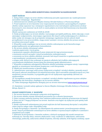 REGULAMIN KORZYSTANIA Z BASENÓW NA RADWANOWIE CZĘŚĆ OGÓLNA 1. Zakup biletu wstępu na teren obiektu traktowany jest jako zapoznanie się i zaakceptowanie warunków niniejszego Regulaminu 2. Administratorem obiektu jest Miejsko-Gminny Ośrodek Kultury w Piwnicznej-Zdroju 3. Przed wejściem na tere basenów oraz rozpoczęciem korzystania z poszczególnych urządzeń obiektu należy zapoznać się z niniejszym regulaminem oraz instrukcjami użytkowania atrakcji basenowych, oraz stosować się do nich w czasie pobytu na terenie hali basenowej oraz basenów zewnętrznych. Obiekt czynny jest codziennie od 10.00 do 20.00. 4. Osoby przebywające na terenie obiektu i naruszające porządek publiczny, dobre obyczaje, w tym używające wulgaryzmów, stwarzające zagrożenie dla innych osób przebywających w obiekcie, a także osoby nie stosujące się do przepisów niniejszego regulaminu lub do zaleceń służb porządkowych oraz pracowników, mogą zostać usunięte z terenu obiektu bez prawa zwrotu wcześniej uiszczonych opłat. 5. Wszystkie osoby znajdujące się na terenie obiektu zobowiązane są do bezzwłocznego podporządkowania się ogłaszanym komunikatom. 6. Na terenie obiektu obowiązuje zakaz: • palenia papierosów i żucia gumy, • spożywania napojów alkoholowych poza miejscami do tego przeznaczonymi, • wnoszenia ostrych narzędzi i innych przedmiotów niebezpiecznych, • wnoszenia na teren obiektu alkoholu, żywności lub innych towarów w opakowaniach szklanych, • wprowadzania i przebywania zwierząt, • wstępu osób, których stan wskazuje na spożycie alkoholu lub środków odurzających, • prowadzenia działalności komercyjnej bez pisemnej zgody Administratora 7. Wszystkie urządzenia udostępnione klientom obiektu posiadają wymagane atesty i zapewniają zgodnie ze stosownymi instrukcjami bezpieczne z nich korzystanie. 8. Obiekt jest monitorowany w sposób ciągły. 9.. Administrator zastrzega sobie prawo wyłączenia urządzeń i atrakcji obiektu z powodu awarii lub innych zdarzeń niezależnych od administratora(np. złych warunków atmosferycznych ect.) bez możliwości zwrotu kosztów, w przypadku gdy ich nie wyłączenie zagrażałoby zdrowiu ich użytkowników. 10. Szczegółowe zasady korzystania z urządzeń i atrakcji obiektu regulowane są przez odrębne Regulaminy lub Instrukcje, znajdujące się na terenie obiektu. 12. Tekst niniejszego Regulaminu dostępny jest na stronie internetowej www.mgok.piwniczna.pl 13. Zażalenia i wnioski należy zgłaszać w biurze Miejsko-Gminnego Ośrodka Kultury w PiwnicznejZdroju, Rynek 11. ZASADY KORZYSTANIA Z BASENÓW 1. Na terenie basenów obowiązuje wyłącznie strój kąpielowy 2. Na terenie obiektu istnieje obowiązek poruszania się w obuwiu basenowym. 3. Dzieci noszące pieluchy powinny mieć założone jednorazowe pieluchy przeznaczone do kąpieli. 4. Dzieci do lat 7 mogą przebywać na terenie basenów oraz kąpać się wyłącznie pod opieką osób pełnoletnich. 5. Każdy użytkownik zobowiązany jest przed wejściem do hali basenowej skorzystać z natrysków celem umycia całego ciała i dezynfekcji stóp. 6. Osoby korzystające z basenów są zobowiązane do umieszczania i przechowywania odzieży, toreb i innych przedmiotów wniesionych na teren obiektu w wyznaczonych szafkach w szatniach i zamykania tych szafek. 7. Zabrania się korzystania z basenów osobom, u których występują lub oznaki zewnętrzne wskazują na: choroby skóry, otwarte skaleczenia i rany, trudności w oddychaniu, zaburzenia równowagi, padaczkę, zaburzenia układu krążenia, choroby zakaźne, brak higieny osobistej, częste iniekcje dożylne, agresywne zachowania. 8. Osoby znajdujące się w pogorszonym stanie zdrowia, sprawności bądź samopoczucia, a także kobiety w ciąży, winny korzystać z urządzeń hali basenowej stosownie do ich aktualnego stanu zdrowia i ze szczególną ostrożnością, a za ewentualne negatywne skutki uchybienia tej powinności administrator nie ponosi odpowiedzialności. 9. Przy korzystaniu z atrakcji basenowej, należy bezwzględnie przestrzegać instrukcji i oznakowań oraz stosować się do poleceń obsługi. 10. Przy korzystaniu ze zjeżdżalni wodnych należy bezwzględnie przestrzegać instrukcji znajdujących się przy stanowiskach startowych . 11. Na terenie basenów zabrania się: • biegania i wpychania do wody innych użytkowników, a także wszelkich innych zachowań zagrażających bezpieczeństwu, • przebywania osób, których stan wskazuje na spożycie alkoholu lub podobnie działających środków, • sprzedaży, podawania, wnoszenia oraz spożywania napojów alkoholowych lub podobnie działających środków, • wszczynania fałszywych alarmów, • wchodzenia na balustrady, stanowiska ratowników, murki okalające baseny, kwietniki,oraz inne urządzenia nie służące do tego celu, • skakania do wody z murków, balustrad, schodów, wanny jacuzzi, kwietników i innych fragmentów konstrukcji obiektu, a także z brzegu basenu w szczególności z rozbiegu lub „na główkę”, • używania sprzętu ratowniczego do innych celów niż jest przeznaczony, • korzystania ze zjeżdżalni lub atrakcji w sposób niezgodny z instrukcjami, • spożywania artykułów żywnościowych na terenie szatni, przebieralni, hali basenowej z wyłączeniem baru . • wrzucania do wody naczyń, resztek jedzenia i wszelkich przedmiotów nie służących zwyczajowo do zabawy w wodzie, • niszczenia wyposażenia, • zanieczyszczania wody basenowej, 12. Wszystkie osoby korzystają z urządzeń i atrakcji obiektu na własną odpowiedzialność. 13. Wszelkie skaleczenia, urazy oraz nieprawidłowości należy zgłaszać niezwłocznie najbliższemu ratownikowi. 14. Zajęcia mogą się odbywać tylko w obecności instruktorów pływania i ratowników. 15. Zajęcia grupowe odbywają się według ściśle określonego harmonogramu dostępnego w informacji. 16. Dzieci do lat 7 mogą przebywać w base