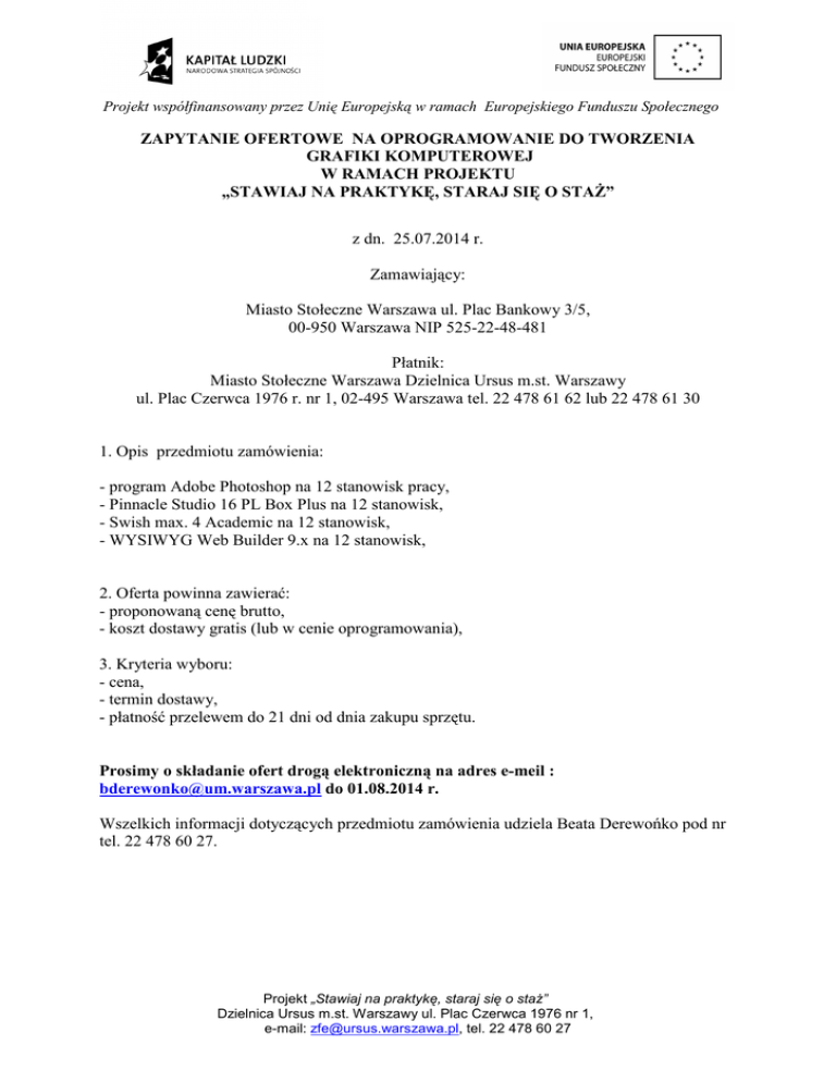 Projekt współfinansowany przez Unię Europejską w ramach Europejskiego Funduszu Społecznego ZAPYTANIE OFERTOWE NA OPROGRAMOWANIE DO TWORZENIA GRAFIKI KOMPUTEROWEJ W RAMACH PROJEKTU „STAWIAJ NA PRAKTYKĘ, STARAJ SIĘ O STAŻ” z dn. 25.07.2014 r. Zamawiający: Miasto Stołeczne Warszawa ul. Plac Bankowy 3/5, 00-950 Warszawa NIP 525-22-48-481 Płatnik: Miasto Stołeczne Warszawa Dzielnica Ursus m.st. Warszawy ul. Plac Czerwca 1976 r. nr 1, 02-495 Warszawa tel. 22 478 61 62 lub 22 478 61 30 1. Opis przedmiotu zamówienia: - program Adobe Photoshop na 12 stanowisk pracy, - Pinnacle Studio 16 PL Box Plus na 12 stanowisk, - Swish max. 4 Academic na 12 stanowisk, - WYSIWYG Web Builder 9.x na 12 stanowisk, 2. Oferta powinna zawierać: - proponowaną cenę brutto, - koszt dostawy gratis (lub w cenie oprogramowania), 3. Kryteria wyboru: - cena, - termin dostawy, - płatność przelewem do 21 dni od dnia zakupu sprzętu. Prosimy o składanie ofert drogą elektroniczną na adres e-meil : [email protected] do 01.08.2014 r. Wszelkich informacji dotyczących przedmiotu zamówienia udziela Beata Derewońko pod nr tel. 22 478 60 27. Projekt „Stawiaj na praktykę, staraj się o staż” Dzielnica Ursus m.st. Warszawy ul. Plac Czerwca 1976 nr 1, e-mail: [email protected], tel. 22 478 60 27
