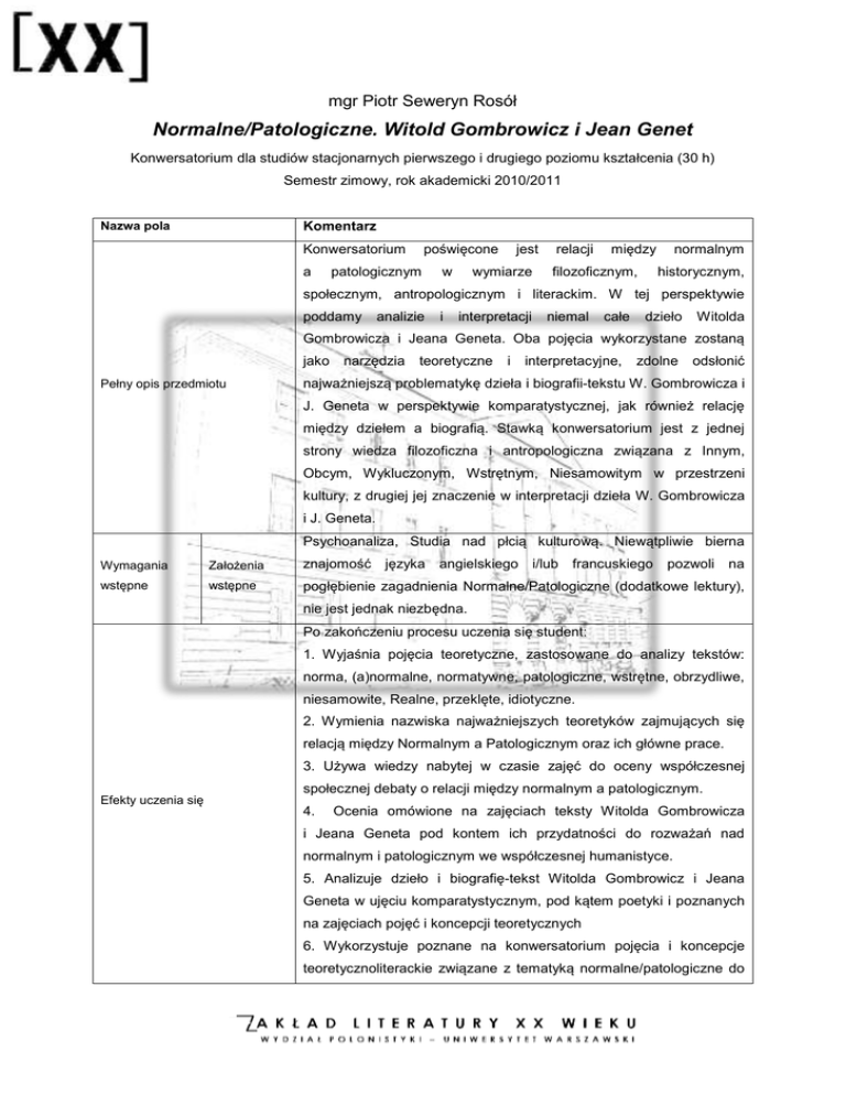 mgr Piotr Seweryn Rosół Normalne/Patologiczne. Witold Gombrowicz i Jean Genet Konwersatorium dla studiów stacjonarnych pierwszego i drugiego poziomu kształcenia (30 h) Semestr zimowy, rok akademicki 2010/2011 Komentarz Nazwa pola Konwersatorium a poświęcone patologicznym w jest wymiarze relacji między filozoficznym, normalnym historycznym, społecznym, antropologicznym i literackim. W tej perspektywie poddamy analizie i interpretacji niemal całe dzieło Witolda Gombrowicza i Jeana Geneta. Oba pojęcia wykorzystane zostaną jako Pełny opis przedmiotu narzędzia teoretyczne i interpretacyjne, zdolne odsłonić najważniejszą problematykę dzieła i biografii-tekstu W. Gombrowicza i J. Geneta w perspektywie komparatystycznej, jak również relację między dziełem a biografią. Stawką konwersatorium jest z jednej strony wiedza filozoficzna i antropologiczna związana z Innym, Obcym, Wykluczonym, Wstrętnym, Niesamowitym w przestrzeni kultury, z drugiej jej znaczenie w interpretacji dzieła W. Gombrowicza i J. Geneta. Psychoanaliza, Studia nad płcią kulturową. Niewątpliwie bierna Wymagania Założenia znajomość języka angielskiego i/lub francuskiego pozwoli na wstępne wstępne pogłębienie zagadnienia Normalne/Patologiczne (dodatkowe lektury), nie jest jednak niezbędna. Po zakończeniu procesu uczenia się student: 1. Wyjaśnia pojęcia teoretyczne, zastosowane do analizy tekstów: norma, (a)normalne, normatywne, patologiczne, wstrętne, obrzydliwe, niesamowite, Realne, przeklęte, idiotyczne. 2. Wymienia nazwiska najważniejszych teoretyków zajmujących się relacją między Normalnym a Patologicznym oraz ich główne prace. 3. Używa wiedzy nabytej w czasie zajęć do oceny współczesnej Efekty uczenia się społecznej debaty o relacji między normalnym a patologicznym. 4. Ocenia omówione na zajęciach teksty Witolda Gombrowicza i Jeana Geneta pod kontem ich przydatności do rozważań nad normalnym i patologicznym we współczesnej humanistyce. 5. Analizuje dzieło i biografię-tekst Witolda Gombrowicz i Jeana Geneta w ujęciu komparatystycznym, pod kątem poetyki i poznanych na zajęciach pojęć i koncepcji teoretycznych 6. Wykorzystuje poznane na konwersatorium pojęcia i koncepcje teoretycznoliterackie związane z tematyką normalne/patologiczne do interpretacji innych tekstów literackich i zjawisk kulturowych. Obecność na zajęciach obowiązkowa. Aktywność na zajęciach, Metody i kryteria oceniania Sposób zaliczenia samodzielne przygotowanie lektur dodatkowych. zaliczenie na ocenę Przedmiot konwersatoryjny, realizowany na studiach stacjonarnych Rodzaj przedmiotu Sposób realizacji przedmiotu I lub II stopnia, na dowolnym roku studiów. Przedmiot jest realizowany w sali dydaktycznej w formie dyskusji, krótkich wykładów oraz szczegółowej analizy fragmentów tekstu. 1. Wprowadzenie do Normalne/Patologiczne. Zarys historyczny, filozoficzny i antropologiczny. (2 zajęcia) 2. „Władza jest wszędzie, nie dlatego, że wszystko obejmuje, ale dlatego, że zewsząd się wyłania”. Dyskurs władzy, kontr-dyskurs, przeciw-historie. (2 zajęcia) Zakres tematów 3. Anormalni (2 zajęcia) 4. Wstrętne, Obrzydliwe (2 zajęcia) 5. Niesamowite. Sobowtór 6. Święte, Przeklęte, Potworne (2 zajęcia) 7. Fantazmaty i Fetysze. 8. Uwodzenie, dyskurs miłosny, autofikcja (2 zajęcia) 9. Idiotyczne: Norma i Patologia w polu interpretacji. 1. - M. Foucault, Historia szaleństwa w dobie klasycyzmu, przeł. H. Kęszycka, PIW, Warszawa 1987. - S. Freud, Psychopatologia życia codziennego; Marzenia senne, Wydawictwo Naukowe PWN, Warszawa 2003. - G. Canguilhem, Normalne i patologiczne, przekł. i posł. P. Pieniążek, Słowo/obraz terytoria, Gdańsk 2000 (fragmenty). 2. - W. Gombrowicz, Dziennik t. III (1961-1969), w: idem, Dzieła, t. IX, pod red. J. Błońskiego i J. Jarzębskiego, Wydawnictwo Literackie, Literatura Kraków 1986-1996, s. 133-140. - J. Genet, Ścisły nadzór w: idem, Teatr, przeł. J. Błoński i inni, PIW, Warszawa, 1970. - M. Foucault, Historia seksualności, przeł. Bogdan Banasiak, T. Komendant i K. Matuszewski, Czytelnik, Warszawa 1995. M. Foucault, Nadzorować i karać : narodziny więzienia, przeł. i posł. opatrzył Tadeusz Komendant, Aletheia : Spacja, Warszawa, 1993. M. Foucault, Narodziny kliniki, przeł. Paweł Pieniążek, „KR”, Warszawa 1999. 3. - W. Gombrowicz, Bakakaj, Wydaw. Literackie, Kraków-Wrocław 1986. - J. Genet, Cud Róży, przekł. B. Szwarcman-Czarnota, Tenten, Warszawa 1994. - M. Foucault, Les anormaux. Cours au Collège de France 19741975, Gallimard, Paris 1999. (skrót: M. Foucault, Les Anormaux w: idem, Dits et ecrit, Gallimard, Paris 2001, (t.1, p. 1690-1696). - E. Roudinesco, Nasza mroczna strona : z dziejów perwersji, przeł. Bogdan Baran, "Czytelnik", Warszawa 2009. 4. - J. Genet, Pokojówki w: idem, Teatr, przeł. J. Błoński i inni, PIW, Warszawa, 1970 W. Gombrowicz, Iwona, Księżniczka Burgunda, w: idem, Dzieła, t. VI, pod red. J. Błońskiego i J. Jarzębskiego, Wydawnictwo Literackie, Kraków 1986-1996. - J. Kristeva, Potęga obrzydzenia. Esej o wstręcie, przekł. M. Falski, eidos, Kraków2007. - W. Menninghaus, Wstręt. Teoria i historia, Universitas, Kraków 2009. 5. - W. Gombrowicz, Ferdydurke, Wydawnictwo Literackie, Kraków 1994. - W. Gombrowicz, Opętani, Wydawnictwo Literackie, Kraków 1999. - S. Freud, Niesamowite w: idem, Pisma Psychologiczne, Wydawnictwo KR, Warszawa 1997. - M. Janion, Forma gotycka Gombrowicza [w:] Pisma wybrane, t.4: Romantyzm i jego media, oprac. M. Czermińska, Kraków 2001. - M. P. Markowski, Czarny nurt. Gombrowicz, świat, literatura, Kraków 2004 6. - W. Gombrowicz, Pornografia, Wydawnictwo Literackie, Kraków 1994. - J. Genet, Ceremonie żałobne, Wydawnictwo Marabut, Gdańsk 1995. - G. Bataille, Erotyzm, przeł. M. Ochab, Słowo/obraz terytoria, Gdańsk 2007. - G. Bataille, Historia erotyzmu, przeł. I. Kania, Oficyna Literacka, Kraków 1992 - Jean-Paul Sartre, Sain