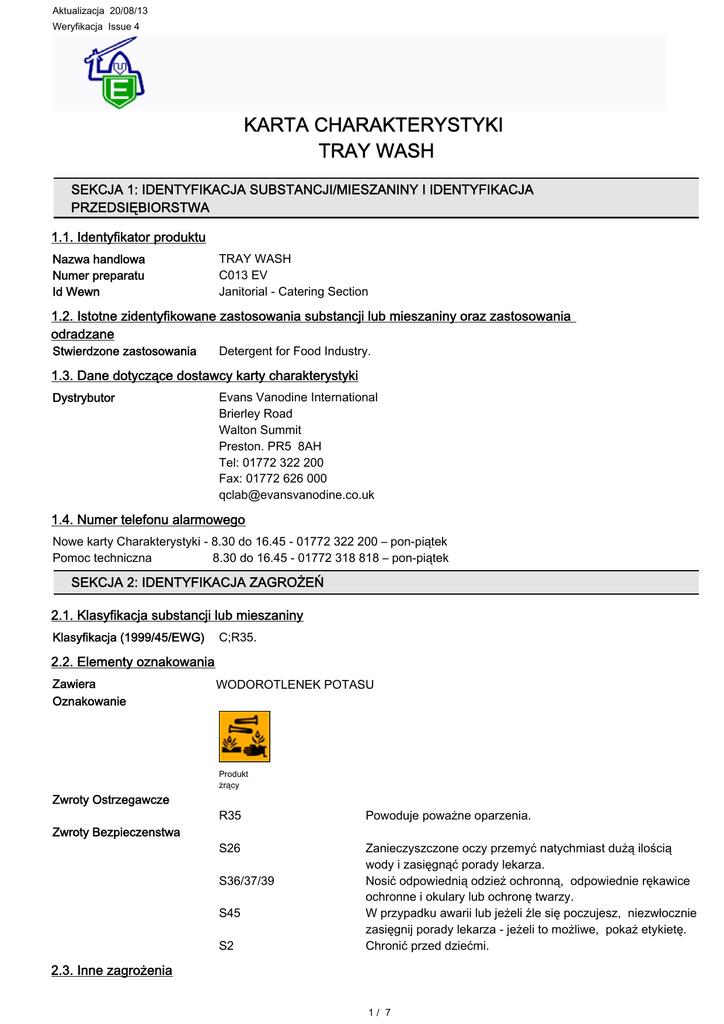 Aktualizacja 20/08/13 Weryfikacja Issue 4 KARTA CHARAKTERYSTYKI TRAY WASH SEKCJA 1: IDENTYFIKACJA SUBSTANCJI/MIESZANINY I IDENTYFIKACJA PRZEDSIĘBIORSTWA 1.1. Identyfikator produktu Nazwa handlowa Numer preparatu Id Wewn TRAY WASH C013 EV Janitorial - Catering Section 1.2. Istotne zidentyfikowane zastosowania substancji lub mieszaniny oraz zastosowania odradzane Stwierdzone zastosowania Detergent for Food Industry. 1.3. Dane dotyczące dostawcy karty charakterystyki Dystrybutor Evans Vanodine International Brierley Road Walton Summit Preston. PR5 8AH Tel: 01772 322 200 Fax: 01772 626 000 [email protected] 1.4. Numer telefonu alarmowego Nowe karty Charakterystyki - 8.30 do 16.45 - 01772 322 200 – pon-piątek Pomoc techniczna 8.30 do 16.45 - 01772 318 818 – pon-piątek SEKCJA 2: IDENTYFIKACJA ZAGROŻEŃ 2.1. Klasyfikacja substancji lub mieszaniny Klasyfikacja (1999/45/EWG) C;R35. 2.2. Elementy oznakowania Zawiera Oznakowanie WODOROTLENEK POTASU Produkt żrący Zwroty Ostrzegawcze Zwroty Bezpieczenstwa R35 Powoduje poważne oparzenia. S26 Zanieczyszczone oczy przemyć natychmiast dużą ilością wody i zasięgnąć porady lekarza. Nosić odpowiednią odzież ochronną, odpowiednie rękawice ochronne i okulary lub ochronę twarzy. W przypadku awarii lub jeżeli źle się poczujesz, niezwłocznie zasięgnij porady lekarza - jeżeli to możliwe, pokaż etykietę. Chronić przed dziećmi. S36/37/39 S45 S2 2.3. Inne zagrożenia 1/ 7 TRAY WASH SEKCJA 3: SKŁAD/INFORMACJA O SKŁADNIKACH 3.2. Mieszaniny POTASSIUM SILICATE Numer CAS: 1312-76-1 25-30% Numer WE: 215-199-1 Klasyfikacja (WE 1272/2008) Skin Irrit. 2 - H315 Eye dam. 1 - H318 Klasyfikacja (67/548/EWG) Xi;R38,R41. WODOROTLENEK POTASU Numer CAS: 1310-58-3 5-10% Numer WE: 215-181-3 Klasyfikacja (WE 1272/2008) Acute Tox. 4 - H302 Skin Corr. 1A - H314 Klasyfikacja (67/548/EWG) C;R35 Xn;R22 POTASSIUM PYROPHOSPHATE Numer CAS: 7320-34-5 1-5% Numer WE: Klasyfikacja (WE 1272/2008) Skin Irrit. 2 - H315 Eye Irrit. 2 - H319 STOT Single 3 - H335 Klasyfikacja (67/548/EWG) Xi;R36/37/38. Pełny tekst zwrotów wskazujących rodzaj zagrożenia (zwrotów R) i określeń zagrożeń jest przedstawiony w sekcji 16. SEKCJA 4: ŚRODKI PIERWSZEJ POMOCY 4.1. Opis środków pierwszej pomocy Wdychanie Nie dotyczy Znikome prawdopodobieństwo narażenia tą drogą, ponieważ preparat nie zawiera substancji lotnych. W przypadku wdychania mgły z rozprysków: Przenieść poszkodowanego na świeże powietrze, aby odpoczął w spokoju. Spożycie NIE WYWOŁYWAĆ WYMIOTÓW! Dokładnie wypłukać usta. Wypić kilka szklanek wody albo mleka. Natychmiast zapewnić opiekę lekarską! Kontakt ze skórą Natychmiast umyć skórę wodą z mydłem. Jeśli po myciu pojawią się objawy, niezwłocznie skontaktować się z lekarzem. Kontakt z oczami Niezwłocznie przemyć oczy dużą ilością wody, podnosząc powieki. Natychmiast skontaktować się z lekarzem. Kontynuować płukanie. 4.2. Najważniejsze ostre i opóźnione objawy oraz skutki narażenia Informacja ogólna Nasilenie opisanych objawów będzie różne, w zależności od stężenia substancji i długości okresu narażenia. Wdychanie Podrażnienie nosa, krtani i dróg oddechowych. Spozycie Może wywołać chemiczne poparzenia jamy ustnej i krtani. 2/ 7 TRAY WASH Kontakt ze skórą Palący ból i poważne uszkodzenie skóry wskutek żarcia. Może spowodować poważne oparzenia chemiczne skóry. Kontakt z oczami Ostre podrażnienie oczu i śluzówek, uczucie palenia i łzawienie. Uszkodzenie rogówki. 4.3. Wskazania dotyczące wszelkiej natychmiastowej pomocy lekarskiej i szczególnego postępowania z poszkodowanym Leczyć objawowo. SEKCJA 5: POSTĘPOWANIE W PRZYPADKU POŻARU 5.1. Środki gaśnicze Środki gaśnicze Produkt nie jest łatwo palny. Przy doborze środków gaszenia pożaru uwzględnić ewentualną obecność innych środków chemicznych. 5.2. Szczególne zagrożenia związane z substancją lub mieszaniną Zagrożenia specyficzne Wskutek nagrzewania lub pożaru mogą wydzielać się szkodliwe pary/gazy. 5.3. Informacje dla straży pożarnej Środki ochrony personelu straży pożarnej W warunkach pożarowych stosować urządzenia oddechowe z własnym obiegiem powietrza i odzież ochronną na całe ciało. SEKCJA 6: POSTĘPOWANIE W PRZYPADKU NIEZAMIERZONEGO UWOLNIENIA DO ŚRODOWISKA 6.1. Indywidualne środki ostrożności, wyposażenie ochronne i procedury w sytuacjach awaryjnych W sprawie indywidualnych środków ochrony - patrz pkt 8. 6.2. Środki ostrożności w zakresie ochrony środowiska O wycieku i niekontrolowanym zrzucie do cieków wodnych należy NATYCHMIAST poinformować odpowiedni organ nadzoru rzecznego albo inne właściwe władze. 6.3. Metody i materiały zapobiegające rozprzestrzenianiu się skażenia i służące do usuwania skażenia Niewielkie ilości można spłukać do kanalizacji dużą ilością wody. Duże zanieczyszczenia: Zebrać za pomocą urządzenia próżniowego albo chłonną substancją stałą, przechowywać w zamkniętym pojemniku do usunięcia. 6.4. Odniesienia do innych sekcji W sprawie indywidualnych środków ochrony - patrz pkt 8. SEKCJA 7: POSTĘPOWANIE Z SUBSTANCJAMI I MIESZANINAMI ORAZ ICH MAGAZYNOWANIE 7.1. Środki ostrożności dotyczące bezpiecznego postępowania Chronić oczy przed kontaktem. Chronić skórę przed kontaktem. 7.2. Warunki bezpiecznego magazynowania, łącznie z informacjami dotyczącymi wszelkich wzajemnych niezgodności Przechowywać w umiarkowanej temperaturze, w suchym i dobrze wentylowanym miejscu. Przechowywać w oryginalnym opakowaniu. Przechowywać z dala od: Materiał utleniający. 7.3. Szczególne zastosowanie(-a) końcowe Stwierdzone zastosowania tego produktu są wyszczególnione w Sekcji 1.2. Opis Uzytkowania See Product Information Sheet & Label for detailed use of this product. Patrz informacje o produkcie karty charakterystyki i etykiety do szczegółowego stosowania tego produktu. ??? 3/ 7 TRAY WASH SEKCJA 8: KONTROLA NARAŻENIA/