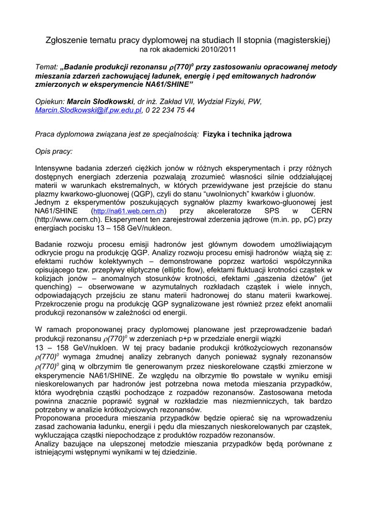 Zgłoszenie tematu pracy dyplomowej na studiach II stopnia (magisterskiej) na rok akademicki 2010/2011 Temat: „Badanie produkcji rezonansu ρ (770)0 przy zastosowaniu opracowanej metody mieszania zdarzeń zachowującej ładunek, energię i pęd emitowanych hadronów zmierzonych w eksperymencie NA61/SHINE” Opiekun: Marcin Słodkowski, dr inż. Zakład VII, Wydział Fizyki, PW, [email protected], 0 22 234 75 44 Praca dyplomowa związana jest ze specjalnością: Fizyka i technika jądrowa Opis pracy: Intensywne badania zderzeń ciężkich jonów w różnych eksperymentach i przy różnych dostępnych energiach zderzenia pozwalają zrozumieć własności silnie oddziałującej materii w warunkach ekstremalnych, w których przewidywane jest przejście do stanu plazmy kwarkowo-gluonowej (QGP), czyli do stanu “uwolnionych” kwarków i gluonów. Jednym z eksperymentów poszukujących sygnałów plazmy kwarkowo-gluonowej jest NA61/SHINE (http://na61.web.cern.ch) przy akceleratorze SPS w CERN (http://www.cern.ch). Eksperyment ten zarejestrował zderzenia jądrowe (m.in. pp, pC) przy energiach pocisku 13 – 158 GeV/nukleon. Badanie rozwoju procesu emisji hadronów jest głównym dowodem umożliwiającym odkrycie progu na produkcję QGP. Analizy rozwoju procesu emisji hadronów wiążą się z: efektami ruchów kolektywnych – demonstrowane poprzez wartości współczynnika opisującego tzw. przepływy eliptyczne (elliptic flow), efektami fluktuacji krotności cząstek w kolizjach jonów – anomalnych stosunków krotności, efektami „gaszenia dżetów” (jet quenching) – obserwowane w azymutalnych rozkładach cząstek i wiele innych, odpowiadających przejściu ze stanu materii hadronowej do stanu materii kwarkowej. Przekroczenie progu na produkcję QGP sygnalizowane jest również przez efekt anomalii produkcji rezonansów w zależności od energii. W ramach proponowanej pracy dyplomowej planowane jest przeprowadzenie badań produkcji rezonansu ρ(770)0 w zderzeniach p+p w przedziale energii wiązki 13 – 158 GeV/nukloen. W tej pracy badanie produkcji krótkożyciowych rezonansów ρ(770)0 wymaga żmudnej analizy zebranych danych ponieważ sygnały rezonansów ρ(770)0 giną w olbrzymim tle generowanym przez nieskorelowane cząstki zmierzone w eksperymencie NA61/SHINE. Ze względu na olbrzymie tło powstałe w wyniku emisji nieskorelowanych par hadronów jest potrzebna nowa metoda mieszania przypadków, która wyodrębnia cząstki pochodzące z rozpadów rezonansów. Zastosowana metoda powinna znacznie poprawić sygnał w rozkładzie mas niezmienniczych, tak bardzo potrzebny w analizie krótkożyciowych rezonansów. Proponowana procedura mieszania przypadków będzie opierać się na wprowadzeniu zasad zachowania ładunku, energii i pędu dla mieszanych nieskorelowanych par cząstek, wykluczająca cząstki niepochodzące z produktów rozpadów rezonansów. Analizy bazujące na ulepszonej metodzie mieszania przypadków będą porównane z istniejącymi wstępnymi wynikami w tej dziedzinie. Wymierną korzyścią dla zespołu badawczego eksperymentu NA61/SHINE będzie unowocześnienie oprogramowania eksperymentu (biblioteki T61), które może być użyte w konfiguracji eksperymentu NA61/SHINE. Przeprowadzenie tych analiz jest niezbędnym elementem programu badawczego potrzebnego w międzynarodowej współpracy grupy badawczej eksperymentu NA61/SHINE. Wszystkie użyte w pracy dane pochodzić będą z detektora NA61/SHINE. Osoba realizująca temat będzie miała możliwość (w zależności od postępów pracy) wyjazdów na spotkania międzynarodowej grupy NA61/SHINE (Genewa, Frankfurt) w celu konsultacji naukowych oraz weryfikacji używanych metod analizy i otrzymanych wyników. Możliwa będzie również kontynuacja pracy w ramach studiów doktoranckich. Do wykonania pracy potrzebna jest znajomość podstaw fizyki jądrowej i cząstek elementarnych. Wymagana jest bardzo dobra umiejętność programowania w językach C, C++ oraz znajomość języków skryptowych bash, csh, perl i python na systemach typu UNIX (Linux). W analizach będzie wykorzystywane środowisko do analizy danych i wizualizacji wyników ROOT oraz środowisko dedykowane dla eksperymentu NA61 – ROOT61. Zakres zadań do wykonania dla dyplomanta: praca doświadczalna, oprogramowanie eksperymentu (praca doświadczalna, teoretyczna, modelowanie komputerowe, oprogramowanie eksperymentu, etc.): Czy przewidywana jest publikacja związana z pracą dyplomową? Tak.