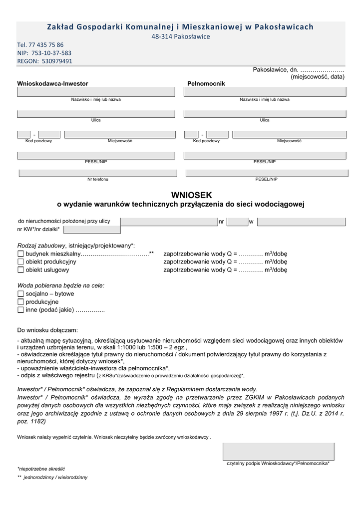 Zakład Gospodarki Komunalnej i Mieszkaniowej w Pakosławicach 48-314 Pakosławice Tel. 77 435 75 86 NIP: 753-10-37-583 REGON: 530979491 Pakosławice, dn. …………………. (miejscowość, data) Pełnomocnik Wnioskodawca-Inwestor Nazwisko i imię lub nazwa Nazwisko i imię lub nazwa Ulica Ulica - Miejscowość Kod pocztowy Miejscowość Kod pocztowy PESEL/NIP PESEL/NIP Nr telefonu PESEL/NIP WNIOSEK o wydanie warunków technicznych przyłączenia do sieci wodociągowej do nieruchomości położonej przy ulicy nr w nr KW*/nr działki* Rodzaj zabudowy, istniejący/projektowany*: budynek mieszkalny…………………………….** obiekt produkcyjny obiekt usługowy zapotrzebowanie wody Q = ………… m 3/dobę zapotrzebowanie wody Q = ………… m3/dobę zapotrzebowanie wody Q = ………… m 3/dobę Woda pobierana będzie na cele: socjalno – bytowe produkcyjne inne (podać jakie) …………... Do wniosku dołączam: - aktualną mapę sytuacyjną, określającą usytuowanie nieruchomości względem sieci wodociągowej oraz innych obiektów i urządzeń uzbrojenia terenu, w skali 1:1000 lub 1:500 – 2 egz., - oświadczenie określające tytuł prawny do nieruchomości / dokument potwierdzający tytuł prawny do korzystania z nieruchomości, której dotyczy wniosek*, - upoważnienie właściciela-inwestora dla pełnomocnika*, - odpis z właściwego rejestru (z KRSu*/zaświadczenie o prowadzeniu działalności gospodarczej)*, Inwestor* / Pełnomocnik* oświadcza, że zapoznał się z Regulaminem dostarczania wody. Inwestor* / Pełnomocnik* oświadcza, że wyraża zgodę na przetwarzanie przez ZGKiM w Pakosławicach podanych powyżej danych osobowych dla wszystkich niezbędnych czynności, które maja związek z realizacją niniejszego wniosku oraz jego archiwizację zgodnie z ustawą o ochronie danych osobowych z dnia 29 sierpnia 1997 r. (t.j. Dz.U. z 2014 r. poz. 1182) Wniosek należy wypełnić czytelnie. Wniosek nieczytelny będzie zwrócony wnioskodawcy . czytelny podpis Wnioskodawcy*/Pełnomocnika* *niepotrzebne skreślić ** jednorodzinny / wielorodzinny