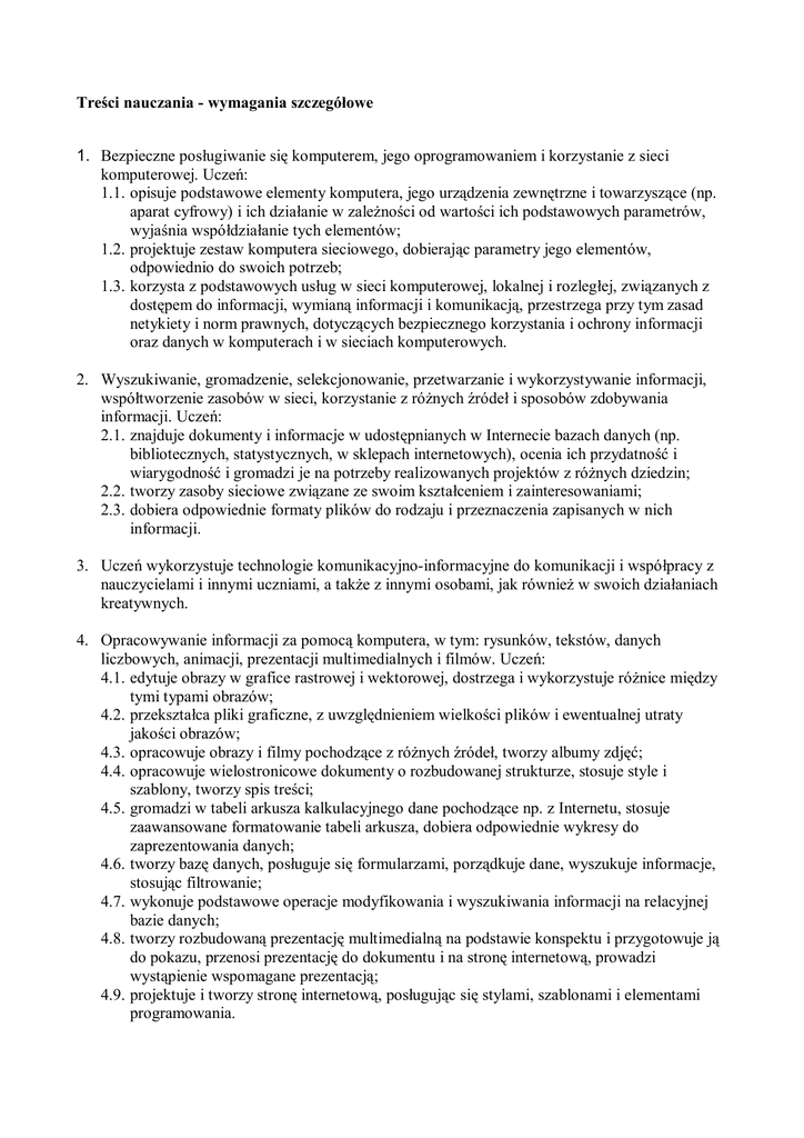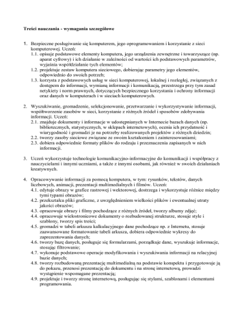 Treści nauczania - wymagania szczegółowe 1. Bezpieczne posługiwanie się komputerem, jego oprogramowaniem i korzystanie z sieci komputerowej. Uczeń: 1.1. opisuje podstawowe elementy komputera, jego urządzenia zewnętrzne i towarzyszące (np. aparat cyfrowy) i ich działanie w zależności od wartości ich podstawowych parametrów, wyjaśnia współdziałanie tych elementów; 1.2. projektuje zestaw komputera sieciowego, dobierając parametry jego elementów, odpowiednio do swoich potrzeb; 1.3. korzysta z podstawowych usług w sieci komputerowej, lokalnej i rozległej, związanych z dostępem do informacji, wymianą informacji i komunikacją, przestrzega przy tym zasad netykiety i norm prawnych, dotyczących bezpiecznego korzystania i ochrony informacji oraz danych w komputerach i w sieciach komputerowych. 2. Wyszukiwanie, gromadzenie, selekcjonowanie, przetwarzanie i wykorzystywanie informacji, współtworzenie zasobów w sieci, korzystanie z różnych źródeł i sposobów zdobywania informacji. Uczeń: 2.1. znajduje dokumenty i informacje w udostępnianych w Internecie bazach danych (np. bibliotecznych, statystycznych, w sklepach internetowych), ocenia ich przydatność i wiarygodność i gromadzi je na potrzeby realizowanych projektów z różnych dziedzin; 2.2. tworzy zasoby sieciowe związane ze swoim kształceniem i zainteresowaniami; 2.3. dobiera odpowiednie formaty plików do rodzaju i przeznaczenia zapisanych w nich informacji. 3. Uczeń wykorzystuje technologie komunikacyjno-informacyjne do komunikacji i współpracy z nauczycielami i innymi uczniami, a także z innymi osobami, jak również w swoich działaniach kreatywnych. 4. Opracowywanie informacji za pomocą komputera, w tym: rysunków, tekstów, danych liczbowych, animacji, prezentacji multimedialnych i filmów. Uczeń: 4.1. edytuje obrazy w grafice rastrowej i wektorowej, dostrzega i wykorzystuje różnice między tymi typami obrazów; 4.2. przekształca pliki graficzne, z uwzględnieniem wielkości plików i ewentualnej utraty jakości obrazów; 4.3. opracowuje obrazy i filmy pochodzące z różnych źródeł, tworzy albumy zdjęć; 4.4. opracowuje wielostronicowe dokumenty o rozbudowanej strukturze, stosuje style i szablony, tworzy spis treści; 4.5. gromadzi w tabeli arkusza kalkulacyjnego dane pochodzące np. z Internetu, stosuje zaawansowane formatowanie tabeli arkusza, dobiera odpowiednie wykresy do zaprezentowania danych; 4.6. tworzy bazę danych, posługuje się formularzami, porządkuje dane, wyszukuje informacje, stosując filtrowanie; 4.7. wykonuje podstawowe operacje modyfikowania i wyszukiwania informacji na relacyjnej bazie danych; 4.8. tworzy rozbudowaną prezentację multimedialną na podstawie konspektu i przygotowuje ją do pokazu, przenosi prezentację do dokumentu i na stronę internetową, prowadzi wystąpienie wspomagane prezentacją; 4.9. projektuje i tworzy stronę internetową, posługując się stylami, szablonami i elementami programowania. 5. Rozwiązywanie problemów i podejmowanie decyzji z wykorzystaniem komputera, stosowanie podejścia algorytmicznego. Uczeń: 5.1. prowadzi dyskusje nad sytuacjami problemowymi; 5.2. formułuje specyfikacje dla wybranych sytuacji problemowych; 5.3. projektuje rozwiązanie: wybiera metodę rozwiązania, odpowiednio dobiera narzędzia komputerowe, tworzy projekt rozwiązania; 5.4. realizuje rozwiązanie na komputerze za pomocą oprogramowania aplikacyjnego lub języka programowania; 5.5. testuje otrzymane rozwiązanie, ocenia jego własności, w tym efektywność działania oraz zgodność ze specyfikacją; 5.6. przeprowadza prezentację i omawia zastosowania rozwiązania. 6. Wykorzystywanie komputera oraz programów edukacyjnych do poszerzania wiedzy i umiejętności z różnych dziedzin. Uczeń: 6.1. wykorzystuje oprogramowanie dydaktyczne i technologie informacyjno-komunikacyjne w pracy twórczej i przy rozwiązywaniu zadań i problemów szkolnych; 6.2. korzysta, odpowiednio do swoich zainteresowań i potrzeb, z zasobów edukacyjnych udostępnianych na portalach przeznaczonych do kształcenia na odległość. 7. Wykorzystywanie komputera i technologii informacyjno-komunikacyjnych do rozwijania zainteresowań, opisywanie zastosowań informatyki, ocena zagrożeń i ograniczeń, aspekty społeczne rozwoju i zastosowań informatyki. Uczeń: 7.1. opisuje szanse i zagrożenia dla rozwoju społeczeństwa, wynikające z rozwoju technologii informacyjno-komunikacyjnych; 7.2. omawia normy prawne odnoszące się do stosowania technologii informacyjnokomunikacyjnych, dotyczące m.in.: rozpowszechniania programów komputerowych, przestępczości komputerowej, poufności, bezpieczeństwa i ochrony danych oraz informacji w komputerze i w sieciach komputerowych; 7.3. zapoznaje się z możliwościami nowych urządzeń i programów związanych z technologiami informacyjno-komunikacyjnymi, zgodnie ze swoimi zainteresowaniami i potrzebami edukacyjnymi.