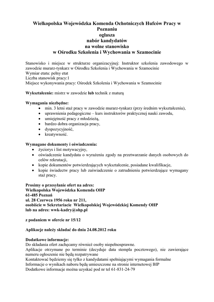 Wielkopolska Wojewódzka Komenda Ochotniczych Hufców Pracy w Poznaniu ogłasza nabór kandydatów na wolne stanowisko w Ośrodku Szkolenia i Wychowania w Szamocinie Stanowisko i miejsce w strukturze organizacyjnej: Instruktor szkolenia zawodowego w zawodzie murarz-tynkarz w Ośrodku Szkolenia i Wychowania w Szamocinie Wymiar etatu: pełny etat Liczba stanowisk pracy:1 Miejsce wykonywania pracy: Ośrodek Szkolenia i Wychowania w Szamocinie Wykształcenie: mistrz w zawodzie lub technik z maturą Wymagania niezbędne: min. 3 letni staż pracy w zawodzie murarz-tynkarz (przy średnim wykształceniu), uprawnienia pedagogiczne – kurs instruktorów praktycznej nauki zawodu, umiejętność pracy z młodzieżą, bardzo dobra organizacja pracy, dyspozycyjność, kreatywność. Wymagane dokumenty i oświadczenia: życiorys i list motywacyjny, oświadczenie kandydata o wyrażeniu zgody na przetwarzanie danych osobowych do celów rekrutacji, kopie dokumentów potwierdzających wykształcenie, posiadane kwalifikacje, kopie świadectw pracy lub zaświadczenie o zatrudnieniu potwierdzające wymagany staż pracy. Prosimy o przesyłanie ofert na adres: Wielkopolska Wojewódzka Komenda OHP 61-485 Poznań ul. 28 Czerwca 1956 roku nr 211, osobiście w Sekretariacie Wielkopolskiej Wojewódzkiej Komendy OHP lub na adres: [email protected] z podaniem w ofercie nr 15/12 Aplikacje należy składać do dnia 24.08.2012 roku Dodatkowe informacje: Do składania ofert zachęcamy również osoby niepełnosprawne. Aplikacje otrzymane po terminie (decyduje data stempla pocztowego), nie zawierające numeru ogłoszenie nie będą rozpatrywane Kontaktować będziemy się tylko z kandydatami spełniającymi wymagania formalne Informacje o wynikach naboru będą umieszczone na stronie internetowej BIP Dodatkowe informacje można uzyskać pod nr tel 61-831-24-79