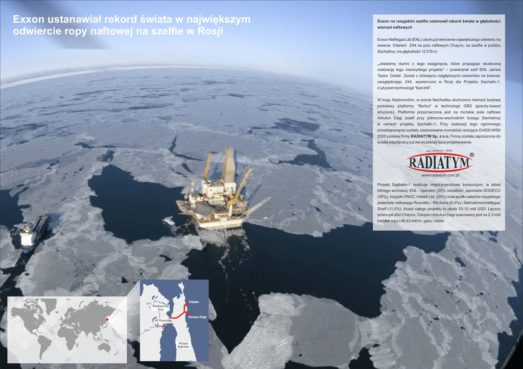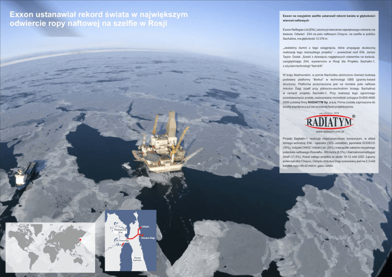 Exxon ustanawiał rekord świata w największym odwiercie ropy naftowej na szelfie w Rosji Exxon na rosyjskim szelfie ustanowił rekord świata w głębokości wierceń naftowych Exxon Neftegas Ltd (ENL) ukończył wiercenie największego odwiertu na świecie. Odwiert Z44 na polu naftowym Chayvo, na szelfie w pobliżu Sachalina, ma głębokość 12 376 m. „ Jesteśmy dumni z tego osiągnięcia, które propaguje skuteczną realizację tego niezwykłego projektu” – powiedział szef ENL James Taylor. Dodał: „Sześć z dziesięciu najgłębszych odwiertów na świecie, uwzględniając Z44, wywiercono w Rosji dla Projektu Sachalin-1, z użyciem technologii “fast drill”. W kraju Nadmorskim, w porcie Nachodka ukończono również budowę podstawy platformy “Berkut” w technologii GBS (gravity-based structure). Platforma przeznaczona jest na morskie pole naftowe Arkutun Dagi (szelf przy północno-wschodnim brzegu Sachalina) w ramach projektu Sachalin-1. Przy realizacji tego ogromnego przedsięwzięcia zostały zastosowane monobloki izolujące Dn500 ANSI 2500 polskiej firmy RADIATYM Sp. z o.o. Firma została zaproszona do ścisłej współpracy już we wczesnej fazie projektowania. www.radiatym.com.pl Projekt Sachalin-1 realizuje międzynarodowe konsorcjum, w skład którego wchodzą: ENL - operator (30% udziałów), japońskie SODECO (30%), indyjski ONGC Videsh Ltd. (20%) oraz spółki zależne rosyjskiego potentata naftowego Rosneftu - RN Astra (8,5%) i Sakhalinmorneftegaz Shelf (11,5%). Koszt całego projektu to około 10-12 mld USD. Łączny potencjał złóż Chayvo, Odoptu i Arkutun Dagi szacowany jest na 2,3 mld baryłek ropy i 48,42 mld m..gazu. sześc. Odoptu Khabarovsk Krai Arkutun-Dagi Ropociąg Wyspa Sakhalin