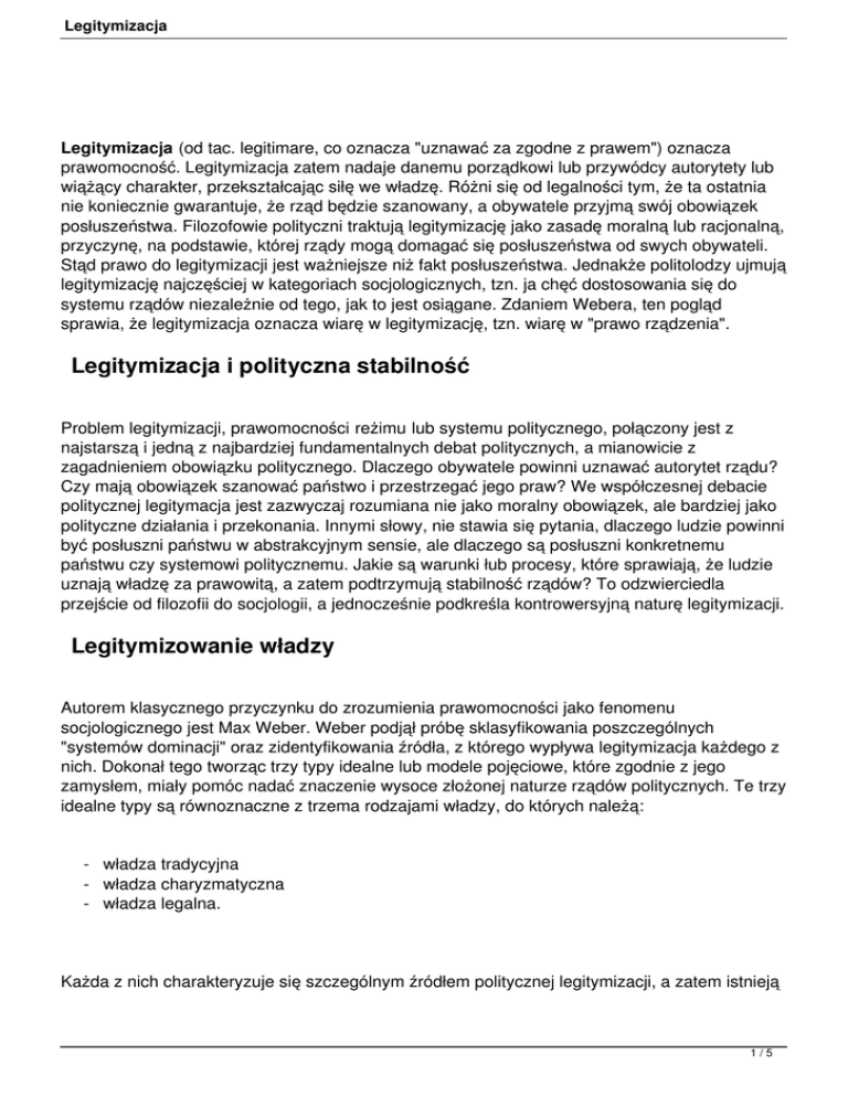 Legitymizacja Legitymizacja (od tac. legitimare, co oznacza "uznawać za zgodne z prawem") oznacza prawomocność. Legitymizacja zatem nadaje danemu porządkowi lub przywódcy autorytety lub wiążący charakter, przekształcając siłę we władzę. Różni się od legalności tym, że ta ostatnia nie koniecznie gwarantuje, że rząd będzie szanowany, a obywatele przyjmą swój obowiązek posłuszeństwa. Filozofowie polityczni traktują legitymizację jako zasadę moralną lub racjonalną, przyczynę, na podstawie, której rządy mogą domagać się posłuszeństwa od swych obywateli. Stąd prawo do legitymizacji jest ważniejsze niż fakt posłuszeństwa. Jednakże politolodzy ujmują legitymizację najczęściej w kategoriach socjologicznych, tzn. ja chęć dostosowania się do systemu rządów niezależnie od tego, jak to jest osiągane. Zdaniem Webera, ten pogląd sprawia, że legitymizacja oznacza wiarę w legitymizację, tzn. wiarę w "prawo rządzenia". Legitymizacja i polityczna stabilność Problem legitymizacji, prawomocności reżimu lub systemu politycznego, połączony jest z najstarszą i jedną z najbardziej fundamentalnych debat politycznych, a mianowicie z zagadnieniem obowiązku politycznego. Dlaczego obywatele powinni uznawać autorytet rządu? Czy mają obowiązek szanować państwo i przestrzegać jego praw? We współczesnej debacie politycznej legitymacja jest zazwyczaj rozumiana nie jako moralny obowiązek, ale bardziej jako polityczne działania i przekonania. Innymi słowy, nie stawia się pytania, dlaczego ludzie powinni być posłuszni państwu w abstrakcyjnym sensie, ale dlaczego są posłuszni konkretnemu państwu czy systemowi politycznemu. Jakie są warunki łub procesy, które sprawiają, że ludzie uznają władzę za prawowitą, a zatem podtrzymują stabilność rządów? To odzwierciedla przejście od filozofii do socjologii, a jednocześnie podkreśla kontrowersyjną naturę legitymizacji. Legitymizowanie władzy Autorem klasycznego przyczynku do zrozumienia prawomocności jako fenomenu socjologicznego jest Max Weber. Weber podjął próbę sklasyfikowania poszczególnych "systemów dominacji" oraz zidentyfikowania źródła, z którego wypływa legitymizacja każdego z nich. Dokonał tego tworząc trzy typy idealne lub modele pojęciowe, które zgodnie z jego zamysłem, miały pomóc nadać znaczenie wysoce złożonej naturze rządów politycznych. Te trzy idealne typy są równoznaczne z trzema rodzajami władzy, do których należą: - władza tradycyjna - władza charyzmatyczna - władza legalna. Każda z nich charakteryzuje się szczególnym źródłem politycznej legitymizacji, a zatem istnieją 1/5 Legitymizacja różne powody, dla których ludzie podporządkowują się władzy. Weber starał się zrozumieć przemianę samego społeczeństwa, porównując systemy dominacji obecne we względnie prostych, tradycyjnych społecznościach z tymi występującymi w społeczeństwach uprzemysłowionych i wysoce zbiurokratyzowanych. Pierwszy typ legitymizacji oparty jest według Webera na przyjętych zwyczajach i tradycjach. W praktyce władza tradycyjna uważana jest za prawomocną, ponieważ "istniała od zawsze": została uświęcona przez historię, ponieważ wcześniejsze pokolenia ją zaakceptowały. Działa najczęściej wedle zestawu konkretnych reguł: tj. ustalonych i niekwestionowanych zwyczajów, które nie muszą być uzasadniane, ponieważ odzwierciedlają odwieczny porządek rzeczy. Najbardziej oczywiste przykłady władzy tradycyjnej znaleźć można u małych plemion i grup w postaci patriarchalizmu (dominacja ojca w rodzinie lub pana nad sługami) i gerontokracji (rządy starszyzny). Tradycyjna władza jest ściśle związana z systemami dziedziczenia władzy i przywilejów, co zobrazować może przykład przetrwania rządów dynastycznych w Arabii Saudyjskiej, Kuwejcie i Maroku. Utrzymanie monarchii ma marginalne znaczenie w krajach wysoce uprzemysłowionych i nie jest tam tak ważne, choć w formie konstytucyjnej (w Zjednoczonym Królestwie, Belgii, Holandii i Hiszpanii) pomaga kształtować kulturę polityczną podtrzymując takie wartości, jak szacunek dla tradycji czy poczucie obowiązku. Drugą formą prawomocnego panowania jest władza charyzmatyczna, oparta na sile osobowości jednostki, tzn. na jej charyzmie. Nic nie zawdzięczając statusowi osoby, pozycji społecznej czy służbowej, władza charyzmatyczna działa, opierając się całkowicie na zdolności lidera do roztoczenia osobistego uroku na swoich zwolennikach, tak by postrzegali go jako bohatera czy pomazańca. Chociaż współcześni liderzy polityczni, tacy jak de Gaulle, Kennedy czy Thatcher, niewątpliwie przedłużyli swoją władzę dzięki cechom osobistym oraz zdolnościom wzbudzania lojalności, to nie stanowiło to legitymacji charyzmatycznej, ponieważ ich autorytet opierał się głównie na formalnej władzy urzędów, które piastowali. Napoleon, Mussolini, Hitler, ajatollah Chomeini, Fidel Castro i pułkownik Kaddafi są bardziej odpowiednimi przykładami. Jednak władza charyzmatyczna nie jest wyłącznie darem naturalnym; system rządów autorytarnych jest niezmiennie podtrzymywany przez "kult jednostki", którego niewątpliwym celem jest "tworzenie" charyzmy. Niemniej jednak z faktu, że legitymizacja oparta jest w większości lub w całości na sile osobowości lidera, wynikają przeważnie dwie konsekwencje. Po pierwsze, władza charyzmatyczna nie jest oparta na formalnych zasadach i procedurach, często nie ma wyznaczonych granic. Lider jest nieomylny i niepodważalny; masy stają się zwolennikami lub wyznawcami, od których wymaga się tylko poddaństwa i posłuszeństwa. Po drugie, władza jest tak blisko związana z określoną jednostką, że systemowi trudno jest przetrwać dłużej od osoby, która go stworzyła. To z pewnością miało miejsce w przypadku reżimów Napoleona, Mussoliniego czy Hitlera. 2/5 Legitymizacja Trzeci typ pan