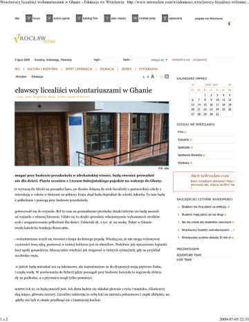 Wrocławscy licealiści wolontariuszami w Ghanie - Edukacja we Wrocławiu http://www.tuwroclaw.com/wiadomosci,wroclawscy-licealisci-wolontar... video forum niedziela, 5 lipca 2009 WIADOMOŚCI | Jestes tu : Wrocław wasze opinie katalog firm Karoliny, Antoniego, Filomeny KULTURA I ROZRYWKA | plan miasta login : hasło SPORT I REKREACJA | EDUKACJA rozkład jazdy ogłoszenia hasło : | BIZNES zarejestruj się | 20°c pogoda we Wrocławiu przypomnij FOTOGALERIA Edukacja KALENDARZ IMPREZ LIPIEC 2009 Wrocławscy licealiści wolontariuszami w Ghanie Pn Wt Śr Cz 6 7 1 2 3 4 5 8 9 10 11 12 13 20 14 15 16 17 18 19 21 22 23 24 25 27 26 28 29 30 31 23 czerwca 2009, autor: Magdalena Bober, Źródło: Gazeta Wyborcza Pt So Nd DZISIAJ WE WROCŁAWIU Kino Koncerty Spektakle Spotkania literackie Wystawy Fot. abe Jadą pomagać przy budowie przedszkola w afrykańskiej wiosce, będą również prowadzić Alert tuWroclaw.com półkolonie dla dzieci. Pięciu uczniów z Liceum Salezjańskiego pojedzie na wakacje do Ghany. Byłeś świadkiem zdarzenia? Masz informację z pierwszej ręki, zdjęcia lub film? Napisz do nas ! Uczniowie wyruszą do Afryki na początku lipca, po drodze dołączą do nich licealistki z partnerskiej szkoły z Bonn. Zamieszkają w szkole w Sunyani na północy kraju skąd będą dojeżdżać do wioski Adentia. To tam będą prowadzić półkolonie i pomogą przy budowie przedszkola. NAJCZĘŚCIEJ CZYTANE WIADOMOŚCI 1. Studenci nie chcą płacić za ambicję. Rok przygotowywali się do wyjazdu. Był to czas na gromadzenie pieniędzy dzięki którym nie będą musieli finansować wyjazdu z własnej kieszeni. Udało się to dzięki sprzedaży własnoręcznie wykonanych stroików świątecznych i zorganizowaniu półkolonii dla dzieci. Uzbierali ok. 2 tys. zł. na osobę. Pobyt w Ghanie dofinansowała katolicka fundacja Renovabis. Przez rok wolontariusze uczyli się również o kraju do którego pojadą. Wiedzą już, że nie mogą wykonywać 2. Studenci mają płacić po raz drugi 3. Nie ma zniŜek dla studentów zaocznych 4. Wrocławscy licealiści wolontariuszami ... 5. Wrocławskie uczelnie dostały 30 mln zł ważnych czynności lewą ręką, ponieważ w tamtej kulturze jest to obraźliwe. Podobnie jak opuszczenie lepianki bez wyraźnej zgody gospodarza. Muszą także wiedzieć jak reagować w różnych sytuacjach, gdy na przykład PREZENTUJEMY spotkają na drodze węża. ADVENTURE TEAM DIVE TEAM Warunki w jakich będą mieszkać nie są luksusowe, ale najważniejsze że do dyspozycji mają piętrowe łóżka, prysznic i ciepłą wodę. W porównaniu do Syberii gdzie pomagali przy budowie kościoła to naprawdę dobrze. Spali wtedy na podłodze, a o prysznicu mogli tylko pomarzyć. Bardziej martwi ich to, co będą musieli jeść. Ich dieta będzie się składać głownie z ryżu i manioku. Ghańczycy rzadko jedzą mięso, głównie szczury. Licealiści zabierają ze sobą leki na zatrucia pokarmowe i zupki chińskie, na wypadek gdyby nie byli w stanie przełknąć nic z tamtejszej kuchni. 1z2 2009-07-05 22:33 Wrocławscy licealiści wolontariuszami w Ghanie - Edukacja we Wrocławiu http://www.tuwroclaw.com/wiadomosci,wroclawscy-licealisci-wolontar... poleć znajomemu | zgłoś błąd Całkowicie darmowy newsletter z przeglądem wydarzeń tygodnia we Wrocławiu komentarzy: 0 | Dodaj komentarz W mieście Ocena : 0.00 | Dodaj ocenę : Informacje praktyczne O mieście jedzenie puby/dyskoteki przetargi plan Wrocławia taxi rys historyczny spacer po mieście hotele/noclegi kina parkingi bankomaty urzędy pocztowe lokalne media dzielnice i osiedla waŜne instytucje edukacja ceny paliw radio we Wrocławiu telefony alarmowe pomoc drogowa komunikacja fotoradary - Wrocław © 2009 copyright - tuPolska sp. z o.o. ul. Rynek 11 44-200 Rybnik , email: [email protected] | redakcja | realizacja | napisz do nas | reklama w serwisie | patronaty Współpraca : 2z2 2009-07-05 22:33
