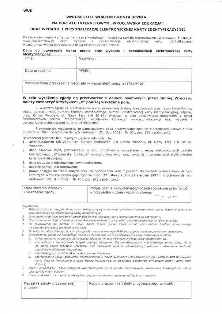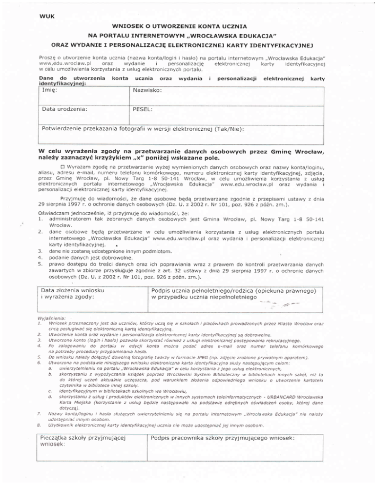 WUK WNIOSEK O UTWORZENIE KONTA UCZNIA NA PORTALU INTERNETOWYM,,WROCLAWSKA EDUKACJA" ORAZ WYDANIE I PERSONALIZACJE ELEKTRONICZNEJ KARTY IDENTYFIKACYJNEJ Proszq o utworzenie konta ucznia (nazwa konta/login i haslo) na portalu internetowym,,Wroctawska Edukacja" www.edu.wroclaw.pl oraz wydanie i personalizacjq elektronicznej karty identyfikacylne.l w celu um02liwienia korzystania z uslug elektronicznych portalu. Dane do utworzenia konta ucznia oraz wydania id Imiq: Nazwisko: Data urodzenia: PESEL: i personalizacji elektronicznej karty Potwierdzenie przekazania fotografii w wersji elektronicznej (TaklNie) W celu wyra2enia zgody na przetwarzanie danych osobowych przez Gminq Wroclaw, nale2y zaznaczy6, krzy2ykiem ,,x" poni2ej wskazane pole. I Wyra2am zgodq na przetwarzanie wy2ej wymienionych danych osobowych oraz nazwy konta/loginu, aliasu, adresu e-mail, numeru telefonu kom6rkowego, numeru elektronicznej karty identyfikacyjnej, zdjqcia, przez Gminq Wroclaw, pl. Nowy Targ 1-B 50-141 Wroclaw, w celu umozliwienia korzystania z uslug elektronicznych portalu internetowego ,,Wroclawska Edukac.la" www.edu.wroclaw.pl oraz wydania i persona izacj i elektron icznej karty identyfikacyj nej. I Przyjmujq do wiadomo6ci,2e dane osobowe bqd4 przetwarzane zgodnie z przepisami ustawy z dnia 29 sierpnia 7997 r. o ochronie danych osobowych (Dz. U. z2OO2 r. Nr 101, poz.926 z po2n, zm.), O6wiadczam jednoczeSnie, iz przyjmujq do wiadomo6ci, ze: 1. administratorem tak zebranych danych osobowych jest Gmina Wroclaw, pl. Nowy Targ 1-8 50-I41 Wroclaw. 2, dane osobowe bqdq przetwarzane w celu umo2liwienia korzystania z uslug elektronicznych portalu internetowego,,Wroctawska Edukacja" www.edu.wroclaw,pl oraz wydania ipersonalizacji elektronicznej kartyidentyfikacyjnej. . 3. 4. 5. dane nie zostanq udostepnione innym podmiotom. podanie danych jest dobrowolne. prawo dostqpu do tre5ci danych oraz ich poprawrania wraz z prawem do kontroli przetwarzania danych zawartych w zbiorze przysluguje zgodnie z art. 32 ustawy z dnia 29 sierpnia 1997 r. o ochronie danych osobowych (Dz, U. z 2OO2 r. Nr 101, poz.926 z po2n. zm.). Data ziozenia wniosku i wyra2enia zgody: I Podpis ucznia pelnoletniego/rodzica (oplekuna prawnego) I w przypadku ucznia niepelnoletniego Wyjainienia: 1. Wniosek przeznaczony jest dla uczni6w, kt6rzy uczq siq w szkolach i plac6wkach prowadzonych przez Miasto Wroclaw oraz chcE poslugiwac siq elektronicznE karta identyfikacyjne 2. Utworzenie konta oraz wydanie i personalizacja elektronicznej karty identyfikacyjnej s4 dobrowolne, 3. Utworzone konto (login i haslo) pozwala skorzystac r6wnie2 z uslugi elektronicznej postqpowania rekrutacyjnego. 4, Po zalogowaniu do portalu w edycji konta mo2na podai adres e-mail oraz numer telefonu kom6rkowego na poLrzeby procedury przypominania hasla. 5 6. Do wniosku nale2y dolqczyi dowoln4 fotografiq twarzy w formacie IPEG (np. zdjqcre zrobione prywatnym aparatem). Atworzona na podstawie niniejszego wniosku elektroniczna karta identyfikacyjna slu2y nastepujEcym celom: a uwierzytelnieniu na portalu ,,Wroclawska Edukacja" w celu korzystania z jego uslug elektronicznych, b. skorzystaniu z wypo2yczania ksiA2ek poprzez Wroclawski System Biblioteczny w bibliotekach innych szk6l, ni2 ta c, d. do kt6rej uczei aktualnie uczeszcza, pod warunkiem zlo2enta odpowiedniego wniosku o utworzenie kartoteki czytelnika w bibliotece innej szkoly. identyfikacyjnym w bibliotekach szkolnych we Wroclawtu, skorzystantu z uslug i produkt6w elektronicznych w innych systemach teleinformatycznych - URBANCARD Wroclawska Karta Miejska (korzystanie z uslug bQdzie nastQpowalo na podstawie odrqbnych oiwiadczei osoby, kt6rej dane dotyczil. 7, Nazwy konta/loginu ihasla slu2acych uwierzytelnieniu siq na portalu tnternetowym,,Wroclawska Edukacja" nie nalezy u dostQpniac n ny m oso bom. U2ytkownik elektronrcznej karty identyfikacyjnej ucznia nie mo2e udostQpniat jej innym osobom. t B, Pieczqtka szkoly wn rosek: przyjmujEcej I Podpis pracownika szkoly przyjmujEcego wniosek: