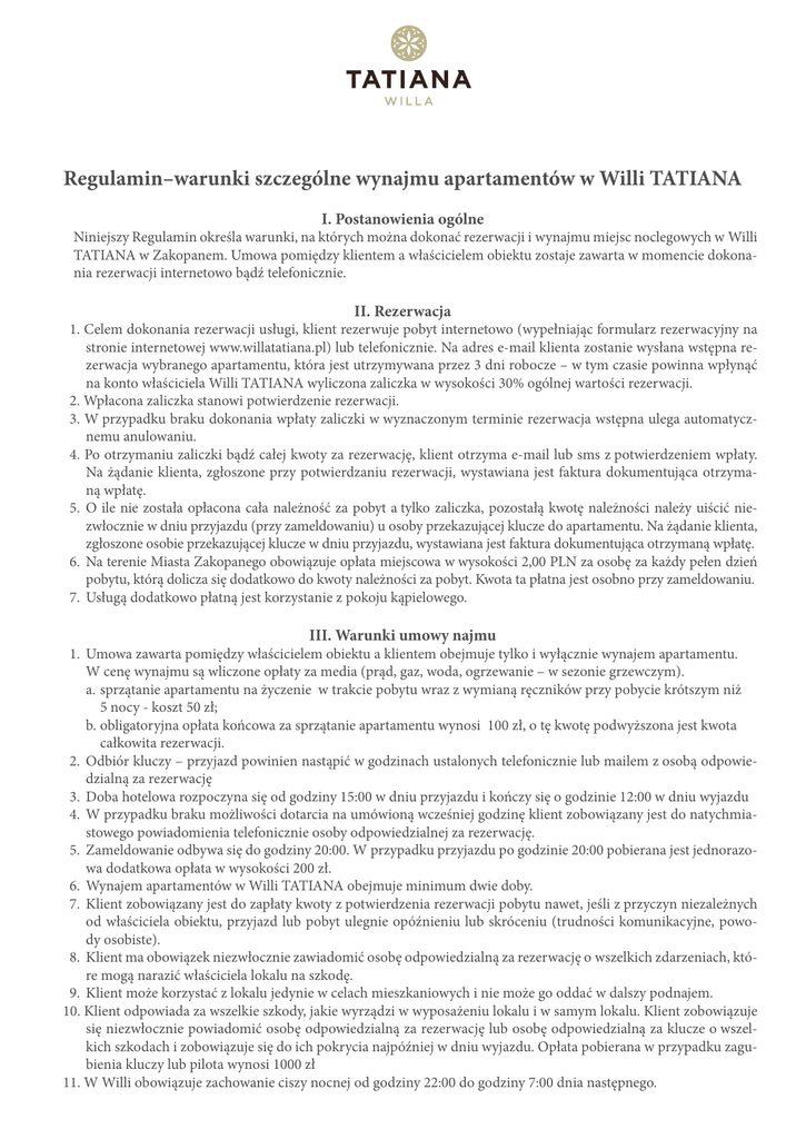 Regulamin–warunki szczególne wynajmu apartamentów w Willi TATIANA I. Postanowienia ogólne Niniejszy Regulamin określa warunki, na których można dokonać rezerwacji i wynajmu miejsc noclegowych w Willi TATIANA w Zakopanem. Umowa pomiędzy klientem a właścicielem obiektu zostaje zawarta w momencie dokonania rezerwacji internetowo bądź telefonicznie. II. Rezerwacja 1. Celem dokonania rezerwacji usługi, klient rezerwuje pobyt internetowo (wypełniając formularz rezerwacyjny na stronie internetowej www.willatatiana.pl) lub telefonicznie. Na adres e-mail klienta zostanie wysłana wstępna rezerwacja wybranego apartamentu, która jest utrzymywana przez 3 dni robocze – w tym czasie powinna wpłynąć na konto właściciela Willi TATIANA wyliczona zaliczka w wysokości 30% ogólnej wartości rezerwacji. 2. Wpłacona zaliczka stanowi potwierdzenie rezerwacji. 3. W przypadku braku dokonania wpłaty zaliczki w wyznaczonym terminie rezerwacja wstępna ulega automatycznemu anulowaniu. 4. Po otrzymaniu zaliczki bądź całej kwoty za rezerwację, klient otrzyma e-mail lub sms z potwierdzeniem wpłaty. Na żądanie klienta, zgłoszone przy potwierdzaniu rezerwacji, wystawiana jest faktura dokumentująca otrzymaną wpłatę. 5.O ile nie została opłacona cała należność za pobyt a tylko zaliczka, pozostałą kwotę należności należy uiścić niezwłocznie w dniu przyjazdu (przy zameldowaniu) u osoby przekazującej klucze do apartamentu. Na żądanie klienta, zgłoszone osobie przekazującej klucze w dniu przyjazdu, wystawiana jest faktura dokumentująca otrzymaną wpłatę. 6. Na terenie Miasta Zakopanego obowiązuje opłata miejscowa w wysokości 2,00 PLN za osobę za każdy pełen dzień pobytu, którą dolicza się dodatkowo do kwoty należności za pobyt. Kwota ta płatna jest osobno przy zameldowaniu. 7. Usługą dodatkowo płatną jest korzystanie z pokoju kąpielowego. III. Warunki umowy najmu 1. Umowa zawarta pomiędzy właścicielem obiektu a klientem obejmuje tylko i wyłącznie wynajem apartamentu. W cenę wynajmu są wliczone opłaty za media (prąd, gaz, woda, ogrzewanie – w sezonie grzewczym). a. sprzątanie apartamentu na życzenie w trakcie pobytu wraz z wymianą ręczników przy pobycie krótszym niż 5 nocy - koszt 50 zł; b.obligatoryjna opłata końcowa za sprzątanie apartamentu wynosi 100 zł, o tę kwotę podwyższona jest kwota całkowita rezerwacji. 2. Odbiór kluczy – przyjazd powinien nastąpić w godzinach ustalonych telefonicznie lub mailem z osobą odpowiedzialną za rezerwację 3. Doba hotelowa rozpoczyna się od godziny 15:00 w dniu przyjazdu i kończy się o godzinie 12:00 w dniu wyjazdu 4. W przypadku braku możliwości dotarcia na umówioną wcześniej godzinę klient zobowiązany jest do natychmiastowego powiadomienia telefonicznie osoby odpowiedzialnej za rezerwację. 5. Zameldowanie odbywa się do godziny 20:00. W przypadku przyjazdu po godzinie 20:00 pobierana jest jednorazowa dodatkowa opłata w wysokości 200 zł. 6. Wynajem apartamentów w Willi TATIANA obejmuje minimum dwie doby. 7. Klient zobowiązany jest do zapłaty kwoty z potwierdzenia rezerwacji pobytu nawet, jeśli z przyczyn niezależnych od właściciela obiektu, przyjazd lub pobyt ulegnie opóźnieniu lub skróceniu (trudności komunikacyjne, powody osobiste). 8. Klient ma obowiązek niezwłocznie zawiadomić osobę odpowiedzialną za rezerwację o wszelkich zdarzeniach, które mogą narazić właściciela lokalu na szkodę. 9. Klient może korzystać z lokalu jedynie w celach mieszkaniowych i nie może go oddać w dalszy podnajem. 10. Klient odpowiada za wszelkie szkody, jakie wyrządzi w wyposażeniu lokalu i w samym lokalu. Klient zobowiązuje się niezwłocznie powiadomić osobę odpowiedzialną za rezerwację lub osobę odpowiedzialną za klucze o wszelkich szkodach i zobowiązuje się do ich pokrycia najpóźniej w dniu wyjazdu. Opłata pobierana w przypadku zagubienia kluczy lub pilota wynosi 1000 zł 11. W Willi obowiązuje zachowanie ciszy nocnej od godziny 22:00 do godziny 7:00 dnia następnego. IV. Obowiązki klienta 1. Liczba osób mających zamieszkać w apartamencie jest ograniczona do podanej w potwierdzeniu rezerwacji. Klient zobowiązany jest do poinformowania telefonicznie lub e-mailem o jakiejkolwiek zmianie tej liczby. Jeśli liczba ta przekroczy liczbę podaną na potwierdzeniu rezerwacji klient ma obowiązek (jeśli istnieje możliwość w apartamencie) dopłacić za osoby niezgłoszone. W innym przypadku osoba odpowiedzialna za rezerwację może odmówić wydania kluczy do apartamentu. 2. Klient zobowiązany jest do zachowania zasad dobrego sąsiedztwa i utrzymywanie apartamentu w stanie zastanym. 3. Osoby odwiedzające, niezameldowane mogą przebywać w apartamencie od godziny 7:00 do godziny 22:00. 4. Willa TATIANA może odmówić przyjęcia klienta, który podczas poprzedniego pobytu rażąco naruszył Regulamin Willi, wyrządzając szkodę w mieniu Willi lub gości albo szkodę na osobie gości, pracowników lub innych osób przebywających w Willi, albo też w inny sposób zakłócił spokojny pobyt gości lub funkcjonowanie Willi. 5. Na terenie całej Willi TATIANA obowiązuje bezwzględny zakaz palenia papierosów, ze względu na warunku przeciwpożarowe. W przypadku złamania zakazu palenia, do kwoty rezerwacji zostanie doliczona opłata w wysokości 1000 zł za sprzątanie aparatamentu. 6. Ze względu na bezpieczeństwo przeciwpożarowe zabronione jest używanie w apartamentach urządzeń elektrycznych niestanowiących wyposażenia jak również używanie ognia otwartego w postaci np. grilla V. Zmiany w rezerwacji 1. Jeśli termin nowy przypada w droższym sezonie wymagana jest dopłata różnicy w cenie. 2. Przedłużanie pobytu – termin pobytu w danym apartamencie można przedłużyć o ile jest wolny, należy powiadomić o tym fakcie e-mailem bądź telefonicznie. 3. W przypadku odwołania rezerwacji: a. na co najmniej 21 dni przed termine