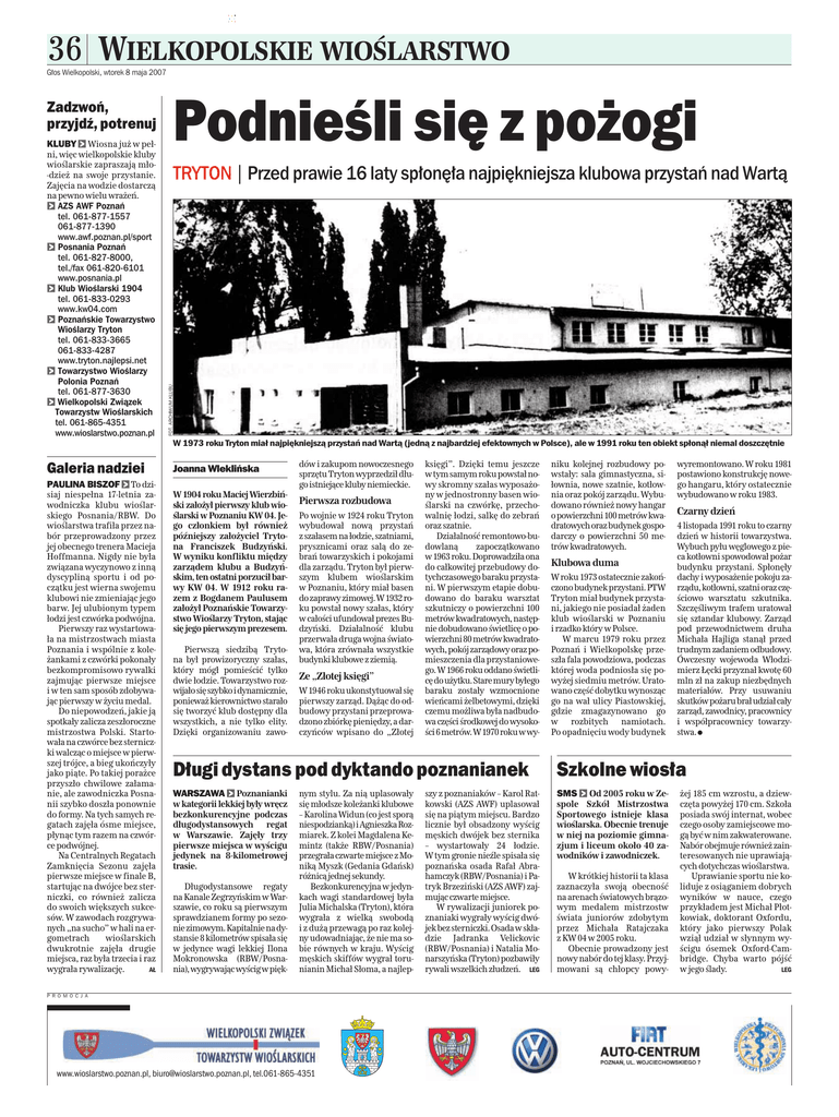 36 Wielkopolskie wioślarstwo Głos Wielkopolski, wtorek 8 maja 2007 KLUBY > Wiosna już w pełni, więc wielkopolskie kluby wioślarskie zapraszają mło-dzież na swoje przystanie. Zajęcia na wodzie dostarczą na pewno wielu wrażeń. > AZS AWF Poznań tel. 061-877-1557 061-877-1390 www.awf.poznan.pl/sport > Posnania Poznań tel. 061-827-8000, tel./fax 061-820-6101 www.posnania.pl > Klub Wioślarski 1904 tel. 061-833-0293 www.kw04.com > Poznańskie Towarzystwo Wioślarzy Tryton tel. 061-833-3665 061-833-4287 www.tryton.najlepsi.net > Towarzystwo Wioślarzy Polonia Poznań tel. 061-877-3630 > Wielkopolski Związek Towarzystw Wioślarskich tel. 061-865-4351 www.wioslarstwo.poznan.pl Podnieśli się z pożogi TRYTON | Przed prawie 16 laty spłonęła najpiękniejsza klubowa przystań nad Wartą FOT. ARCHIWUM KLUBU Zadzwoń, przyjdź, potrenuj W 1973 roku Tryton miał najpiękniejszą przystań nad Wartą (jedną z najbardziej efektownych w Polsce), ale w 1991 roku ten obiekt spłonął niemal doszczętnie Galeria nadziei PAULINA BISZOF > To dzisiaj niespełna 17-letnia zawodniczka klubu wioślarskiego Posnania/RBW. Do wioślarstwa trafiła przez nabór przeprowadzony przez jej obecnego trenera Macieja Hoffmanna. Nigdy nie była związana wyczynowo z inną dyscypliną sportu i od początku jest wierna swojemu klubowi nie zmieniając jego barw. Jej ulubionym typem łodzi jest czwórka podwójna. Pierwszy raz wystartowała na mistrzostwach miasta Poznania i wspólnie z koleżankami z czwórki pokonały bezkompromisowo rywalki zajmując pierwsze miejsce i w ten sam sposób zdobywając pierwszy w życiu medal. Do niepowodzeń, jakie ją spotkały zalicza zeszłoroczne mistrzostwa Polski. Startowała na czwórce bez sterniczki walcząc o miejsce w pierwszej trójce, a bieg ukończyły jako piąte. Po takiej porażce przyszło chwilowe załamanie, ale zawodniczka Posnanii szybko doszła ponownie do formy. Na tych samych regatach zajęła ósme miejsce, płynąc tym razem na czwórce podwójnej. Na Centralnych Regatach Zamknięcia Sezonu zajęła pierwsze miejsce w finale B, startując na dwójce bez sterniczki, co również zalicza do swoich większych sukcesów. W zawodach rozgrywanych „na sucho” w hali na ergometrach wioślarskich dwukrotnie zajęła drugie miejsca, raz była trzecia i raz wygrała rywalizację. AŁ Joanna Wleklińska W 1904 roku Maciej Wierzbiński założył pierwszy klub wioślarski w Poznaniu KW 04. Jego członkiem był również późniejszy założyciel Trytona Franciszek Budzyński. W wyniku konfliktu między zarządem klubu a Budzyńskim, ten ostatni porzucił barwy KW 04. W 1912 roku razem z Bogdanem Paulusem założył Poznańskie Towarzystwo Wioślarzy Tryton, stając się jego pierwszym prezesem. Pierwszą siedzibą Trytona był prowizoryczny szałas, który mógł pomieścić tylko dwie łodzie. Towarzystwo rozwijało się szybko idynamicznie, ponieważ kierownictwo starało się tworzyć klub dostępny dla wszystkich, a nie tylko elity. Dzięki organizowaniu zawo- dów i zakupom nowoczesnego sprzętu Tryton wyprzedził długo istniejące kluby niemieckie. Pierwsza rozbudowa Po wojnie w 1924 roku Tryton wybudował nową przystań z szałasem na łodzie, szatniami, prysznicami oraz salą do zebrań towarzyskich i pokojami dla zarządu. Tryton był pierwszym klubem wioślarskim w Poznaniu, który miał basen dozaprawy zimowej. W1932 roku powstał nowy szałas, który w całości ufundował prezes Budzyński. Działalność klubu przerwała druga wojna światowa, która zrównała wszystkie budynki klubowe z ziemią. Ze „Złotej księgi” W 1946 roku ukonstytuował się pierwszy zarząd. Dążąc do odbudowy przystani przeprowadzono zbiórkę pieniędzy, a darczyńców wpisano do „Złotej księgi”. Dzięki temu jeszcze w tym samym roku powstał nowy skromny szałas wyposażony w jednostronny basen wioślarski na czwórkę, przechowalnię łodzi, salkę do zebrań oraz szatnie. Działalność remontowo-budowlaną zapoczątkowano w 1963 roku. Doprowadziła ona do całkowitej przebudowy dotychczasowego baraku przystani. W pierwszym etapie dobudowano do baraku warsztat szkutniczy o powierzchni 100 metrów kwadratowych, następnie dobudowano świetlicę o powierzchni80 metrów kwadratowych, pokój zarządowy oraz pomieszczenia dla przystaniowego. W 1966 roku oddano świetlicę doużytku. Stare mury byłego baraku zostały wzmocnione wieńcami żelbetowymi, dzięki czemu możliwa była nadbudowa części środkowej do wysokości6 metrów. W1970 roku wwy- niku kolejnej rozbudowy powstały: sala gimnastyczna, siłownia, nowe szatnie, kotłownia oraz pokój zarządu. Wybudowano również nowy hangar opowierzchni100 metrów kwadratowych oraz budynek gospodarczy o powierzchni 50 metrów kwadratowych. Klubowa duma W roku 1973 ostatecznie zakończono budynek przystani. PTW Tryton miał budynek przystani, jakiego nie posiadał żaden klub wioślarski w Poznaniu i rzadko który w Polsce. W marcu 1979 roku przez Poznań i Wielkopolskę przeszła fala powodziowa, podczas której woda podniosła się powyżej siedmiu metrów. Uratowano część dobytku wynosząc go na wał ulicy Piastowskiej, gdzie zmagazynowano go w rozbitych namiotach. Po opadnięciu wody budynek wyremontowano. W roku 1981 postawiono konstrukcję nowego hangaru, który ostatecznie wybudowano w roku 1983. Czarny dzień 4 listopada 1991 roku to czarny dzień w historii towarzystwa. Wybuch pyłu węglowego z pieca kotłowni spowodował pożar budynku przystani. Spłonęły dachy i wyposażenie pokoju zarządu, kotłowni, szatni oraz częściowo warsztatu szkutnika. Szczęśliwym trafem uratował się sztandar klubowy. Zarząd pod przewodnictwem druha Michała Hajliga stanął przed trudnym zadaniem odbudowy. Ówczesny wojewoda Włodzimierz Łęcki przyznał kwotę 60 mln zł na zakup niezbędnych materiałów. Przy usuwaniu skutków pożaru brał udział cały zarząd, zawodnicy, pracownicy i współpracown