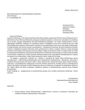 Olsztyn, 2016-01-05 Warmińsko-Mazurski Urząd Wojewódzki w Olsztynie 10-575 Olsztyn Al. J. Piłsudskiego 7/9 Szanowne Panie, Szanowni Panowie Wójtowie, Burmistrzowie, Prezydenci Miast Szanowni Państwo, uprzejmie informuję, że do Wojewody Warmińsko-Mazurskiego wpłynął apel Ministra Spraw Wewnętrznych i Administracji Pana Mariusza Błaszczaka, dotyczący udzielenia pomocy w stworzeniu warunków do osiedlenia się na terenie naszego województwa dla osób pochodzenia polskiego i ich rodzin, ewakuowanych z terenu ogarniętego konfliktem zbrojnym na wschodzie Ukrainy. Szczególnie cenną formę wsparcia dla tych osób stanowiłaby pomoc poprzez zaoferowanie mieszkań oraz przedstawienie ofert pracy, aby mogły funkcjonować w społeczeństwie, jak również uzyskać samodzielność i niezależność finansową. Na dzień dzisiejszy w Ośrodku "Caritas" w Rybakach przebywa 180 osób, wiele spośród nich to rodziny z dziećmi. Obecnie w toku pozostają procedury zmierzające do przyznania im prawa pobytu stałego na terytorium Polski. Z uwagi na fakt, że osoby te mają polskie pochodzenie i jednocześnie pozbawione są możliwości zamieszkiwania w swoim kraju bez obaw o życie własne i najbliższych, należy rozważyć możliwość wsparcia ich w początkach funkcjonowania w nowych warunkach oraz środowiskach, zdając sobie sprawę jak trudna i ciężka jest to droga. W związku z powyższym zwracam się z prośbą o przesłanie do Banku Ofert Ministerstwa Spraw Wewnętrznych i Administracji,prowadzonego przez Departament Obywatelstwa i Repatriacji, informacji o wszelkich formach pomocy dla tychże osób, a także zachęcam do rozpowszechnienia apelu wśród instytucji, organizacji i przedsiębiorców działających na terenie Państwa gmin/miast. Ponadto proszę o potraktowanie sprawy jako pilnej i przesłanie do Biura Wojewody informacji zwrotnej o możliwości (o przekazaniu oferty do ww. Banku Ofert) lub braku możliwości udzielenia wsparcia w przedmiotowym zakresie przez Państwa gminę/miasto. Z góry dziękuję za zaangażowanie w przedmiotową sprawę oraz wszelkie ewentualne deklaracje i oferty wsparcia. Z poważaniem Wojewoda Warmińsko-Mazurski Artur Chojecki Załączniki: 1. Prośba Ministra Spraw Wewnętrznych i Administracji o pomoc w stworzeniu warunków dla osiedlenia Polaków ewakuowanych z Mariupola.