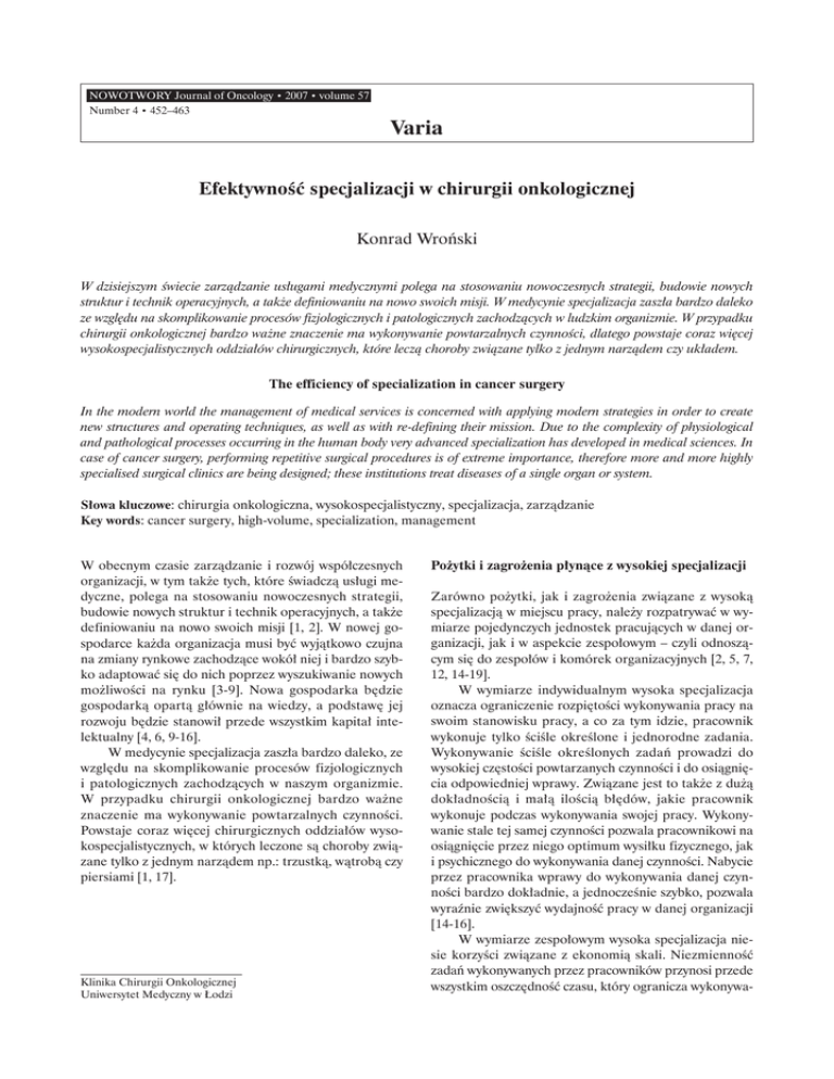 NOWOTWORY Journal of Oncology • 2007 • volume 57 Number 4 • 452–463 Varia Efektywność specjalizacji w chirurgii onkologicznej Konrad Wroński W dzisiejszym świecie zarządzanie usługami medycznymi polega na stosowaniu nowoczesnych strategii, budowie nowych struktur i technik operacyjnych, a także definiowaniu na nowo swoich misji. W medycynie specjalizacja zaszła bardzo daleko ze względu na skomplikowanie procesów fizjologicznych i patologicznych zachodzących w ludzkim organizmie. W przypadku chirurgii onkologicznej bardzo ważne znaczenie ma wykonywanie powtarzalnych czynności, dlatego powstaje coraz więcej wysokospecjalistycznych oddziałów chirurgicznych, które leczą choroby związane tylko z jednym narządem czy układem. The efficiency of specialization in cancer surgery In the modern world the management of medical services is concerned with applying modern strategies in order to create new structures and operating techniques, as well as with re-defining their mission. Due to the complexity of physiological and pathological processes occurring in the human body very advanced specialization has developed in medical sciences. In case of cancer surgery, performing repetitive surgical procedures is of extreme importance, therefore more and more highly specialised surgical clinics are being designed; these institutions treat diseases of a single organ or system. Słowa kluczowe: chirurgia onkologiczna, wysokospecjalistyczny, specjalizacja, zarządzanie Key words: cancer surgery, high-volume, specialization, management W obecnym czasie zarządzanie i rozwój współczesnych organizacji, w tym także tych, które świadczą usługi medyczne, polega na stosowaniu nowoczesnych strategii, budowie nowych struktur i technik operacyjnych, a także definiowaniu na nowo swoich misji [1, 2]. W nowej gospodarce każda organizacja musi być wyjątkowo czujna na zmiany rynkowe zachodzące wokół niej i bardzo szybko adaptować się do nich poprzez wyszukiwanie nowych możliwości na rynku [3-9]. Nowa gospodarka będzie gospodarką opartą głównie na wiedzy, a podstawę jej rozwoju będzie stanowił przede wszystkim kapitał intelektualny [4, 6, 9-16]. W medycynie specjalizacja zaszła bardzo daleko, ze względu na skomplikowanie procesów fizjologicznych i patologicznych zachodzących w naszym organizmie. W przypadku chirurgii onkologicznej bardzo ważne znaczenie ma wykonywanie powtarzalnych czynności. Powstaje coraz więcej chirurgicznych oddziałów wysokospecjalistycznych, w których leczone są choroby związane tylko z jednym narządem np.: trzustką, wątrobą czy piersiami [1, 17]. Klinika Chirurgii Onkologicznej Uniwersytet Medyczny w Łodzi Pożytki i zagrożenia płynące z wysokiej specjalizacji Zarówno pożytki, jak i zagrożenia związane z wysoką specjalizacją w miejscu pracy, należy rozpatrywać w wymiarze pojedynczych jednostek pracujących w danej organizacji, jak i w aspekcie zespołowym – czyli odnoszącym się do zespołów i komórek organizacyjnych [2, 5, 7, 12, 14-19]. W wymiarze indywidualnym wysoka specjalizacja oznacza ograniczenie rozpiętości wykonywania pracy na swoim stanowisku pracy, a co za tym idzie, pracownik wykonuje tylko ściśle określone i jednorodne zadania. Wykonywanie ściśle określonych zadań prowadzi do wysokiej częstości powtarzanych czynności i do osiągnięcia odpowiedniej wprawy. Związane jest to także z dużą dokładnością i małą ilością błędów, jakie pracownik wykonuje podczas wykonywania swojej pracy. Wykonywanie stale tej samej czynności pozwala pracownikowi na osiągnięcie przez niego optimum wysiłku fizycznego, jak i psychicznego do wykonywania danej czynności. Nabycie przez pracownika wprawy do wykonywania danej czynności bardzo dokładnie, a jednocześnie szybko, pozwala wyraźnie zwiększyć wydajność pracy w danej organizacji [14-16]. W wymiarze zespołowym wysoka specjalizacja niesie korzyści związane z ekonomią skali. Niezmienność zadań wykonywanych przez pracowników przynosi przede wszystkim oszczędność czasu, który ogranicza wykonywa- 453 ne w danej organizacji czynności przygotowawczo-zakończeniowe [16-20]. Głównym zagrożeniem wysokiej specjalizacji w miejscu pracy jest znużenie psychiczne i fizyczne pracownika. Osoby, które mają niski poziom kwalifikacji zawodowych, chętnie godzą się na wykonywanie czynności prostych, a co za tym idzie także monotonnych. Osobom dobrze wykształconym i z wysokimi kwalifikacjami pracodawca musi zaoferować pracę ciekawą, bogatszą w ilość wykonywanych czynności, a także wymagającą włożenia wysiłku intelektualnego [2, 4, 8, 11-16, 21-23]. Druga połowa dwudziestego wieku to okres, w którym nastąpił powrót do wysokiej specjalizacji. Uznano, że wysoka specjalizacja pogłębia wydajność pracy i efekt synergiczny. Każda organizacja powinna zachować optimum specjalizacji, gdyż zbyt wysoka specjalizacja powoduje u pracowników negatywne skutki, przyczyniając się do obniżenia efektywności pracy (Ryc. 1). Dlatego każda organizacja powinna dążyć do znalezienia uniwersalnego optimum specjalizacji na podstawie prób i błędów. Obecnie w wielu miejscach pracy dąży się do osiągnięcia wysokiej specjalizacji, ale z jednoczesnym dążeniem do stworzenia bardziej elastycznych struktur dla pracowników [14-16, 20, 21, 24, 25]. Efektywność Specjalizacja Ryc. 1. Zależność między specjalizacją a wydajnością pracy Źródło: M. Bielski. Podstawy teorii organizacji i zarządzania. Warszawa: Wydawnictwo C.H.Beck, 2002, s. 111 Pod pojęciem „humanizacji pracy” w organizacji rozumiemy poszukiwanie takich rozwiązań, które zachowają wszystkie korzyści płynące z wysokiej specjalizacji w miejscu pracy, a jednocześnie ograniczą jej negatywne dla pracownika skutki [15,16]. Poszukiwanie metod mających ograniczyć negatywne skutki głębokiej specjalizacji doprowadziło do odkrycia czterech form orga