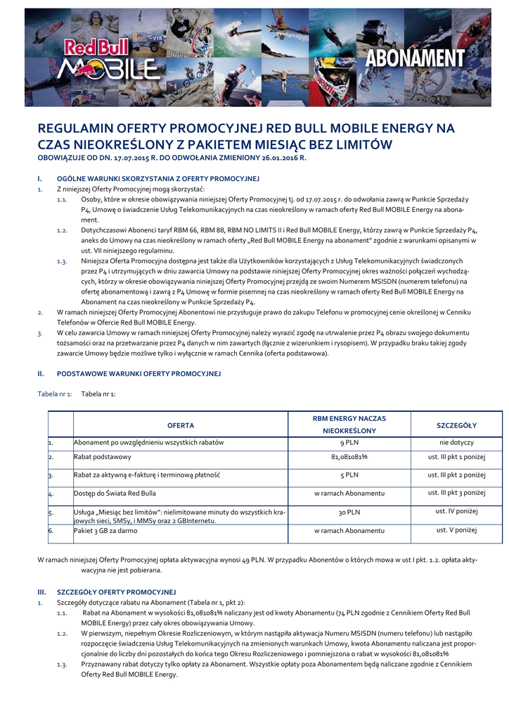 REGULAMIN OFERTY PROMOCYJNEJ RED BULL MOBILE ENERGY NA CZAS NIEOKREŚLONY Z PAKIETEM MIESIĄC BEZ LIMITÓW OBOWIĄZUJE OD DN. 17.07.2015 R. DO ODWOŁANIA ZMIENIONY 26.01.2016 R. I. OGÓLNE WARUNKI SKORZYSTANIA Z OFERTY PROMOCYJNEJ Z niniejszej Oferty Promocyjnej mogą skorzystać: 1.1. Osoby, które w okresie obowiązywania niniejszej Oferty Promocyjnej tj. od 17.07.2015 r. do odwołania zawrą w Punkcie Sprzedaży P4, Umowę o świadczenie Usług Telekomunikacyjnych na czas nieokreślony w ramach oferty Red Bull MOBILE Energy na abonament. 1.2. Dotychczasowi Abonenci taryf RBM 66, RBM 88, RBM NO LIMITS II i Red Bull MOBILE Energy, którzy zawrą w Punkcie Sprzedaży P4, aneks do Umowy na czas nieokreślony w ramach oferty „Red Bull MOBILE Energy na abonament” zgodnie z warunkami opisanymi w ust. VII niniejszego regulaminu. 1.3. Niniejsza Oferta Promocyjna dostępna jest także dla Użytkowników korzystających z Usług Telekomunikacyjnych świadczonych przez P4 i utrzymujących w dniu zawarcia Umowy na podstawie niniejszej Oferty Promocyjnej okres ważności połączeń wychodzących, którzy w okresie obowiązywania niniejszej Oferty Promocyjnej przejdą ze swoim Numerem MSISDN (numerem telefonu) na ofertę abonamentową i zawrą z P4 Umowę w formie pisemnej na czas nieokreślony w ramach oferty Red Bull MOBILE Energy na Abonament na czas nieokreślony w Punkcie Sprzedaży P4. W ramach niniejszej Oferty Promocyjnej Abonentowi nie przysługuje prawo do zakupu Telefonu w promocyjnej cenie określonej w Cenniku Telefonów w Ofercie Red Bull MOBILE Energy. W celu zawarcia Umowy w ramach niniejszej Oferty Promocyjnej należy wyrazić zgodę na utrwalenie przez P4 obrazu swojego dokumentu tożsamości oraz na przetwarzanie przez P4 danych w nim zawartych (łącznie z wizerunkiem i rysopisem). W przypadku braku takiej zgody zawarcie Umowy będzie możliwe tylko i wyłącznie w ramach Cennika (oferta podstawowa). 1. 2. 3. II. PODSTAWOWE WARUNKI OFERTY PROMOCYJNEJ Tabela nr 1: Tabela nr 1: OFERTA 1. Abonament po uwzględnieniu wszystkich rabatów 2. Rabat podstawowy 3. Rabat za aktywną e-fakturę i terminową płatność 4. Dostęp do Świata Red Bulla 5. Usługa „Miesiąc bez limitów”: nielimitowane minuty do wszystkich krajowych sieci, SMSy, i MMSy oraz 2 GBInternetu. Pakiet 3 GB za darmo 6. RBM ENERGY NACZAS NIEOKREŚLONY SZCZEGÓŁY 9 PLN nie dotyczy 81,081081% ust. III pkt 1 poniżej 5 PLN ust. III pkt 2 poniżej w ramach Abonamentu ust. III pkt 3 poniżej 30 PLN ust. IV poniżej w ramach Abonamentu ust. V poniżej W ramach niniejszej Oferty Promocyjnej opłata aktywacyjna wynosi 49 PLN. W przypadku Abonentów o których mowa w ust I pkt. 1.2. opłata aktywacyjna nie jest pobierana. III. 1. SZCZEGÓŁY OFERTY PROMOCYJNEJ Szczegóły dotyczące rabatu na Abonament (Tabela nr 1, pkt 2): 1.1. Rabat na Abonament w wysokości 81,081081% naliczany jest od kwoty Abonamentu (74 PLN zgodnie z Cennikiem Oferty Red Bull MOBILE Energy) przez cały okres obowiązywania Umowy. 1.2. W pierwszym, niepełnym Okresie Rozliczeniowym, w którym nastąpiła aktywacja Numeru MSISDN (numeru telefonu) lub nastąpiło rozpoczęcie świadczenia Usług Telekomunikacyjnych na zmienionych warunkach Umowy, kwota Abonamentu naliczana jest proporcjonalnie do liczby dni pozostałych do końca tego Okresu Rozliczeniowego i pomniejszona o rabat w wysokości 81,081081% 1.3. Przyznawany rabat dotyczy tylko opłaty za Abonament. Wszystkie opłaty poza Abonamentem będą naliczane zgodnie z Cennikiem Oferty Red Bull MOBILE Energy. 2. 3. IV. 4. 2. 3. 4. 5. 6. 7. 8. Szczegóły dotyczące rabatu za aktywną e-fakturę i terminową płatność (Tabela nr 1, pkt 3): 2.1. Z zastrzeżeniem pkt 2.2 poniżej, dodatkowy rabat na Abonament jest przyznawany w odniesieniu do każdego następnego Okresu Rozliczeniowego przez cały Okres Umowy zawartej na czas nieokreślony. Dla naliczenia rabatu konieczne jest łączne spełnienie następujących warunków: a. posiadanie aktywnej e-faktury b. dokonanie terminowej płatności należności wynikających z Rachunku Telekomunikacyjnego za poprzedni Okres Rozliczeniowy. Przez terminowa płatność należy rozumieć uznanie rachunku bankowego Operatora kwotą należności najpóźniej w ostatnim dniu płatności określonym w Rachunku Telekomunikacyjnym. 2.2. Pierwszy dodatkowy rabat w wysokości 5 PLN przyznawany jest w odniesieniu do sumy kwot Abonamentów za dwa pierwsze Okresy Rozliczeniowe, uwidocznionej na pierwszym Rachunku Telekomunikacyjnym. Przyznanie rabatu za ten okres nie jest uzależnione od spełnienia warunku polegającego na terminowej płatności. 2.3. Dodatkowy rabat dotyczy tylko opłaty za Abonament. Wszystkie opłaty poza Abonamentem będą naliczane zgodnie z Cennikiem Oferty Red Bull MOBILE Energy. 2.4. Dodatkowy rabat z tytułu wyboru e-faktury jest zawsze naliczany po rabacie na Abonament opisanym w ust. III pkt 2 niniejszej Oferty Promocyjnej. 2.5. W przypadku aktywacji elektronicznej faktury (e-faktura) podczas trwania Umowy dodatkowy rabat nie zostanie naliczony przy kolejnym Okresie Rozliczeniowym, jeżeli Abonent nie dokona aktywacji e-faktury maksimum pięć dni przed końcem Okresu Rozliczeniowego. 2.6. Jeżeli aktywacja elektronicznej faktury nastąpi później niż piątego dnia przed końcem Okresu Rozliczeniowego, usługa e- faktura zostanie włączona, natomiast rabat 5 PLN z VAT zostanie przyznany w drugim, kolejnym Okresie Rozliczeniowym. 2.7. W przypadku rezygnacji z elektronicznej faktury, klient traci prawo do korzystania z dodatkowego rabatu w Okresie Rozliczeniowym następującym po Okresie Rozliczeniowym, w którym nastąpiła dezaktywacja elektronicznej faktury. 2.8. W przypadku nieuiszczenia należności wynikającej z Rachunku Telekomunikacyjnego w terminie określonym w Rachunku Telekomunikacyjnym, Abonent może utracić dodatkowy rabat w kolejnym Okresie Rozliczeniowym, przypadającym po terminie płatności. Dodatkowy rabat może zos
