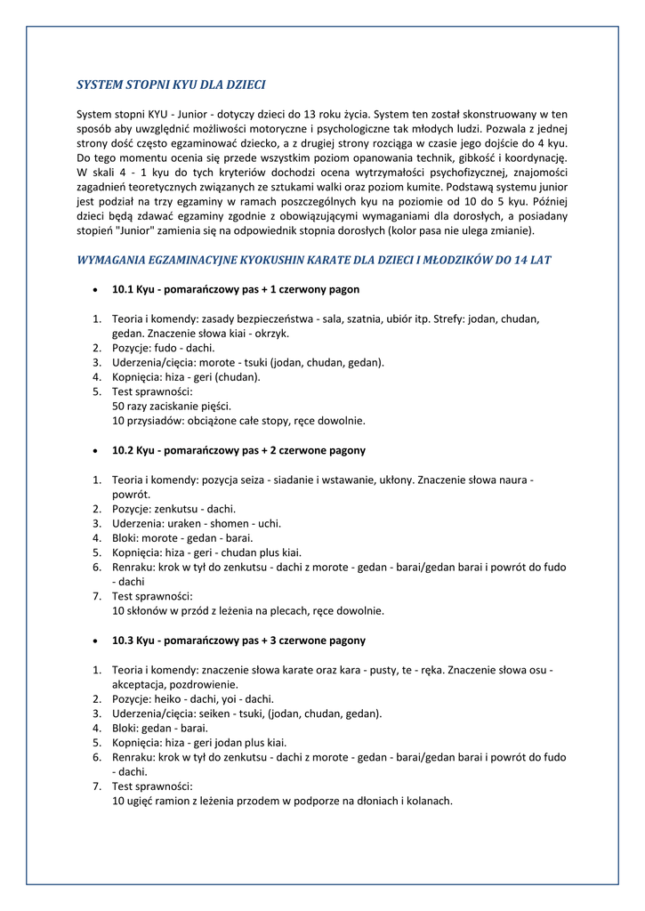 SYSTEM STOPNI KYU DLA DZIECI System stopni KYU - Junior - dotyczy dzieci do 13 roku życia. System ten został skonstruowany w ten sposób aby uwzględnić możliwości motoryczne i psychologiczne tak młodych ludzi. Pozwala z jednej strony dość często egzaminować dziecko, a z drugiej strony rozciąga w czasie jego dojście do 4 kyu. Do tego momentu ocenia się przede wszystkim poziom opanowania technik, gibkość i koordynację. W skali 4 - 1 kyu do tych kryteriów dochodzi ocena wytrzymałości psychofizycznej, znajomości zagadnień teoretycznych związanych ze sztukami walki oraz poziom kumite. Podstawą systemu junior jest podział na trzy egzaminy w ramach poszczególnych kyu na poziomie od 10 do 5 kyu. Później dzieci będą zdawać egzaminy zgodnie z obowiązującymi wymaganiami dla dorosłych, a posiadany stopień "Junior" zamienia się na odpowiednik stopnia dorosłych (kolor pasa nie ulega zmianie). WYMAGANIA EGZAMINACYJNE KYOKUSHIN KARATE DLA DZIECI I MŁODZIKÓW DO 14 LAT 10.1 Kyu - pomarańczowy pas + 1 czerwony pagon 1. Teoria i komendy: zasady bezpieczeństwa - sala, szatnia, ubiór itp. Strefy: jodan, chudan, gedan. Znaczenie słowa kiai - okrzyk. 2. Pozycje: fudo - dachi. 3. Uderzenia/cięcia: morote - tsuki (jodan, chudan, gedan). 4. Kopnięcia: hiza - geri (chudan). 5. Test sprawności: 50 razy zaciskanie pięści. 10 przysiadów: obciążone całe stopy, ręce dowolnie. 10.2 Kyu - pomarańczowy pas + 2 czerwone pagony 1. Teoria i komendy: pozycja seiza - siadanie i wstawanie, ukłony. Znaczenie słowa naura powrót. 2. Pozycje: zenkutsu - dachi. 3. Uderzenia: uraken - shomen - uchi. 4. Bloki: morote - gedan - barai. 5. Kopnięcia: hiza - geri - chudan plus kiai. 6. Renraku: krok w tył do zenkutsu - dachi z morote - gedan - barai/gedan barai i powrót do fudo - dachi 7. Test sprawności: 10 skłonów w przód z leżenia na plecach, ręce dowolnie. 10.3 Kyu - pomarańczowy pas + 3 czerwone pagony 1. Teoria i komendy: znaczenie słowa karate oraz kara - pusty, te - ręka. Znaczenie słowa osu akceptacja, pozdrowienie. 2. Pozycje: heiko - dachi, yoi - dachi. 3. Uderzenia/cięcia: seiken - tsuki, (jodan, chudan, gedan). 4. Bloki: gedan - barai. 5. Kopnięcia: hiza - geri jodan plus kiai. 6. Renraku: krok w tył do zenkutsu - dachi z morote - gedan - barai/gedan barai i powrót do fudo - dachi. 7. Test sprawności: 10 ugięć ramion z leżenia przodem w podporze na dłoniach i kolanach. 9.1 Kyu - pomarańczowy pas + 1 czerwony pagon + 1 niebieski pagon 1. 2. 3. 4. 5. 6. 7. Teoria i komendy: prawidłowy wygląd karategi i wiązanie pasa. Liczenie po japońsku do 10. Pozycje: heisoku - dachi. Uderzenia/cięcia: oi - tsuki, (jodan, chudan, gedan). Bloki: jodan - uke. Kopnięcia: mae - keage. Renraku: trzy kroki w przód/tył w zenkutsu - dachi z oi - tsuki. Test sprawności: 20 przysiadów - obciążone całe stopy, ręce zaplecione na karku, tułów pionowo. 10 wahnięć w formie kołyski na brzuchu z leżenia przodem. 9.2 Kyu - pomarańczowy pas + 2 czerwone pagony + 1 niebieski pagon 1. Teoria i komendy: znaczenie słów sensei - nauczyciel, shihan - nauczyciel mistrz, senpai starszy rangą. 2. Pozycje: musubi - dachi. 3. Uderzenia/cięcia: gyaku - tsuki (jodan, chudan, gedan). 4. Bloki: soto - uke. 5. Kopnięcia: kin - geri. 6. Renraku: trzy kroki w przód/tył w zenkutsu - dachi z gyaku - tsuki 7. Test sprawności: 10 skłonów w przód z leżenia na plecach, ręce zaplecione na karku, tułów prosty 10 wahnięć w formie kołyski na plecach z przysiadu, ręce zaplecione wokół kolan. 9.3 Kyu - pomarańczowy pas + 3 czerwone pagony + 1 niebieski pagon 1. 2. 3. 4. 5. 6. 7. Teoria i komendy: znaczenie słów kyoku-shin-kai. Pozycje: nekoashi - dachi. Uderzenia/cięcia: seiken - ago - uchi. Bloki: uchi - uke. Kopnięcia: mae - geri chudan. Renraku: trzy kroki w przód w zenkutsu - dachi z oi - tsuki/ uke, obrót z gedan barai. Test sprawności: 10 ugięć ramion z leżenia przodem w podporze na pięściach i kolanach. 10 wahnięć w formie kołyski na plecach z przysiadu, ręce po kątem 45° amortyzują pad w tył. 8.1 Kyu - niebieski pas + 1 czerwony pagon 1. 2. 3. 4. 5. 6. 7. Teoria i komendy: przysięga dojo. Pozycje: kokutsu - dachi. Uderzenia/cięcia: shuto - sakotsu - uchi - komi. Bloki: soto - keage. Kopnięcia: soto - keage. Renraku: trzy kroki w przód w zenkutsu - dachi z keri, obrót z morote gedan barai. Test sprawności: 10 przewrotów w przód. 60 sekund tzw. mostek w tył z leżenia na plecach. 8.2 Kyu - niebieski pas + 2 czerwone pagony 1. 2. 3. 4. 5. Teoria i komendy: nogare I - oddychanie Pozycje: moroashi - dachi, uchi - hachiji - dachi. Uderzenia/cięcia: shuto - sakotsu - uchi. Kopnięcia: uchi - keage. Renraku: krok w tył do zenkutsu - dachi z gedan - barai plus gyaku - tsuki i powrót do fudo dachi. 6. Test sprawności: 10 przewrotów w tył. 10 razy po 20 sekund rozciąganie w maksymalnym rozkroku ze skrętem w lewo i w prawo tzw. szpagat. 8.3 Kyu - niebieski pas + 3 czerwone pagony 1. 2. 3. 4. 5. 6. 7. Teoria i komendy:nogare II - oddychanie wykonywane odwrotnie. Pozycje: sanchin - dachi. Uderzenia/cięcia: shuto - ganmen - uchi. Kopnięcia: mae - geri jodan. Renraku: trzy kroki w przód w zenkutsu - dachi z uke plus gyaku - tsuki obrót z gedan barai. Kata: kihon kata I. Test sprawności: 10 razy tzw. gwiazda gimnastyczna. 10 razy dotknąć głową podłogi poprzez skłon w przód siedząc w maksymalnie szerokim rozkroku, nogi proste w kolanach. 7.1 Kyu - niebieski pas + 1 czerwony pagon + żółty pagon 1. 2. 3. 4. 5. 6. 7. Teoria i komendy: ibuki - oddychanie z 2 wydechami. Pozycje: kiba - dachi. Uderzenia/cięcia: uraken - sayu - uchi, uraken - hizo - uchi. Kopnięcia: kansetsu - geri. Renraku: trzy kroki w przód w sanchin - dachi z tsuki/uchi/keri/uke, obrót poprzez przekrok. Kata: taikyoku I. Test sprawności: 10 razy zamach nogą przechodząc do stania na rękach pod drabinkami. 7.2 Kyu - niebieski pas + 2 czerwone pagony + żółt