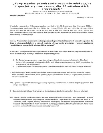 „Nowy wymiar przedszkola-wsparcie edukacyjne i specjalistyczne szansą dla 12 mikołowskich przedszkoli” Zarząd Szkół i Przedszkoli Mikołowskich 43-190 Mikołów, ul. K. Miarki 9. Tel.: +48 32 226-01-69 PN‐9/2013/UE/NWP Mikołów, 14.03.2013 W związku z zapytaniem Wykonawcy, zgodnie z artykułem Art. 38. 2. ustawy z dnia 29 stycznia 2004 r. – Prawo zamówień publicznych (Dz. U. z 2010 r. Nr 113, poz. 759, Nr 161, poz. 1078 i Nr 182, poz. 1228, z 2011 r. Nr 5, poz. 13, Nr 28, poz 143, Nr 87, poz. 484, Nr 234, poz. 1386, Nr 240, poz. 1429, z 2012 r. poz. 769) Zamawiający przekazuje treść zapytań wraz z wyjaśnieniami wykonawcom, oraz udostępnia na stronie internetowej Zamawiającego: Dotyczy: Przedmiotem zamówienia jest zorganizowanie przedstawień teatralnych wraz z transportem dla dzieci w wieku przedszkolnym w ramach projektu „Nowy wymiar przedszkola – wsparcie edukacyjne i specjalistyczne szansą dla 12 mikołowskich przedszkoli” W związku z postępowaniem na zorganizowanie przedstawień teatralnych wraz z transportem dla dzieci w wieku przedszkolnym prosimy o odpowiedź na poniższe pytanie: 1. Czy Zamawiający dopuszcza zorganizowanie przedstawień teatralnych dla dzieci w Ośrodkach Kultury, które posiadają sale teatralne, które spełniają wymagania zawarte w SIWZ, a znajdujące się promieniu 40 km od placówek? 2. O podanie tematyki lub wybranych przez Zamawiającego bajek, których należy dokonać adaptacji. 1. Czy Zamawiający dopuszcza zorganizowanie przedstawień teatralnych dla dzieci w Ośrodkach Kultury, które posiadają sale teatralne, które spełniają wymagania zawarte w SIWZ, a znajdujące się promieniu 40 km od placówek? Ad 1. Zgodnie z zapisami SIWZ Zamawiający wymaga organizacji przedstawienia w teatrze dysponującym min. 250 miejsc na widowni. 2. O podanie tematyki lub wybranych przez Zamawiającego bajek, których należy dokonać adaptacji. Ad 2. Zgodnie z zapisami SIWZ Przedstawienia teatralne powinny być adaptacjami bajek i baśni klasycznych, granymi w teatrze żywego aktora. (Bajki klasyczne – adaptacja baśni i bajek klasycznych dla dzieci min. baśni H. Ch. Andersena, Baśni i legend polskich). Wykonawca zobowiązany jest załączyć opis przedstawień teatralnych będących adaptacjami bajek i baśni klasycznych zawierający propozycję 3 tytułów przedstawień. Każdy wykaz powinien zawierać krótki opis aranżacji, realizacji przedstawień.