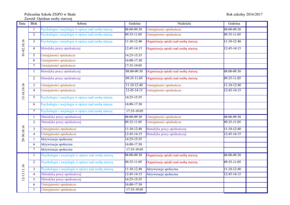 Policealna Szkoła ZSiPO w Skale Zawód: Opiekun osoby starszej 12-13.11.16 29-30.10.16 15-16.10.16 01-02.10.16 Data Blok Rok szkolny 2016/2017 Sobota Godzina Niedziela Godzina 1 2 Psychologia i socjologia w opiece nad osobą starszą Psychologia i socjologia w opiece nad osobą starszą 08:00-09:30 09:35-11:05 Umiejętności opiekuńcze Umiejętności opiekuńcze 08:00-09:30 09:35-11:05 3 Psychologia i socjologia w opiece nad osobą starszą 11:10-12:40 Organizacja opieki nad osobą starszą 11:10-12:40 4 Metodyka pracy opiekuńczej 12:45-14:15 Organizacja opieki nad osobą starszą 12:45-14:15 5 6 7 Umiejętności opiekuńcze Umiejętności opiekuńcze Umiejętności opiekuńcze 14:25-15:55 16:00-17:30 17:35-19:05 1 Metodyka pracy opiekuńczej 08:00-09:30 Organizacja opieki nad osobą starszą 08:00-09:30 2 Metodyka pracy opiekuńczej 09:35-11:05 Organizacja opieki nad osobą starszą 09:35-11:05 3 4 Umiejętności opiekuńcze Umiejętności opiekuńcze 11:10-12:40 12:45-14:15 Umiejętności opiekuńcze Umiejętności opiekuńcze 11:10-12:40 12:45-14:15 5 Psychologia i socjologia w opiece nad osobą starszą 14:25-15:55 6 Psychologia i socjologia w opiece nad osobą starszą 16:00-17:30 7 Psychologia i socjologia w opiece nad osobą starszą 1 2 Metodyka pracy opiekuńczej Metodyka pracy opiekuńczej 08:00-09:30 09:35-11:05 Umiejętności opiekuńcze Umiejętności opiekuńcze 08:00-09:30 09:35-11:05 3 4 5 6 7 Umiejętności opiekuńcze Umiejętności opiekuńcze Aktywizacja społeczna Aktywizacja społeczna Aktywizacja społeczna 11:10-12:40 Metodyka pracy opiekuńczej 12:45-14:15 Metodyka pracy opiekuńczej 14:25-15:55 16:00-17:30 17:35-19:05 11:10-12:40 12:45-14:15 1 Psychologia i socjologia w opiece nad osobą starszą 08:00-09:30 Organizacja opieki nad osobą starszą 08:00-09:30 2 Psychologia i socjologia w opiece nad osobą starszą 09:35-11:05 Organizacja opieki nad osobą starszą 09:35-11:05 3 4 5 6 7 Psychologia i socjologia w opiece nad osobą starszą Metodyka pracy opiekuńczej Metodyka pracy opiekuńczej Umiejętności opiekuńcze Umiejętności opiekuńcze 11:10-12:40 Aktywizacja społeczna 12:45-14:15 Aktywizacja społeczna 14:25-15:55 16:00-17:30 17:35-19:05 17:35-19:05 11:10-12:40 12:45-14:15 26-27.11.16. 03-04.12.16 10-11.12.16 07-08.01.17 21-22.01.17 1 Metodyka pracy opiekuńczej 08:00-09:30 Organizacja opieki nad osobą starszą 08:00-09:30 2 Metodyka pracy opiekuńczej 09:35-11:05 Organizacja opieki nad osobą starszą 09:35-11:05 3 Umiejętności opiekuńcze 11:10-12:40 Organizacja opieki nad osobą starszą 11:10-12:40 4 Umiejętności opiekuńcze 12:45-14:15 Organizacja opieki nad osobą starszą 12:45-14:15 5 6 7 Aktywizacja społeczna Aktywizacja społeczna Aktywizacja społeczna 14:25-15:55 16:00-17:30 17:35-19:05 1 2 3 4 5 Aktywizacja społeczna Aktywizacja społeczna Metodyka pracy opiekuńczej Metodyka pracy opiekuńczej Umiejętności opiekuńcze 08:00-09:30 09:35-11:05 11:10-12:40 12:45-14:15 14:25-15:55 1 Metodyka pracy opiekuńczej 08:00-09:30 Organizacja opieki nad osobą starszą 08:00-09:30 2 Metodyka pracy opiekuńczej 09:35-11:05 Organizacja opieki nad osobą starszą 09:35-11:05 3 4 5 Umiejętności opiekuńcze Umiejętności opiekuńcze Psychologia i socjologia w opiece nad osobą starszą 11:10-12:40 12:45-14:15 14:25-15:55 Umiejętności opiekuńcze Umiejętności opiekuńcze 11:10-12:40 12:45-14:15 6 Psychologia i socjologia w opiece nad osobą starszą 16:00-17:30 7 Psychologia i socjologia w opiece nad osobą starszą 17:35-19:05 1 2 Umiejętności opiekuńcze Metodyka pracy opiekuńczej 08:00-09:30 09:35-11:05 3 Metodyka pracy opiekuńczej 11:10-12:40 4 5 Metodyka pracy opiekuńczej Metodyka pracy opiekuńczej 12:45-14:15 14:25-15:55 1 2 3 4 Metodyka pracy opiekuńczej Metodyka pracy opiekuńczej Umiejętności opiekuńcze Aktywizacja społeczna 08:00-09:30 09:35-11:05 11:10-12:40 12:45-14:15 Organizacja opieki nad osobą starszą Organizacja opieki nad osobą starszą Organizacja opieki nad osobą starszą Psychologia i socjologia w opiece nad osobą starszą 08:00-09:30 09:35-11:05 11:10-12:40 12:45-14:15 5 Aktywizacja społeczna 14:25-15:55 08:00-09:30 09:35-11:05 11:10-12:40 12:45-14:15