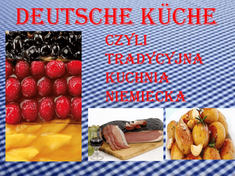 Deutsche Küche czyli tradycyjna kuchnia niemiecka Tak jak i w przeszłości, Niemcy kiełbasą stoją. W całym kraju wytwarza się ponad 1500 jej gatunków, a kajzerka z wystającej z niej parówką lub kiełbasą to najbardziej popularny fast food. Każdy region ma swoją specjalność . Berliński Currywurst Turyński Bratwurst Statystyczny Niemiec zjada rocznie ponad 60 kg mięsa. Najpopularniejsza jest wieprzowina, a pieczeń z sosem (Schweinebraten) to potrawa narodowa. W knajpie w ciemno można zamówić sznycel, zmierzyć się z Schweinehaxe (pieczoną) lub Eisbein (gotowaną) - golonką. Golonka (Eisbein) Ważnym elementem kuchni niemieckiej są ziemniaki. Zwykle się je piecze, smaży lub dodaje do zimnych sałatek, np. Kartoffeln mit Leinöl und Quark (ziemniaki z serkiem i olejem), Specksalat (sałatka ziemniaczana z boczkiem); rzadziej robi się purée. Ziemniaki podawane są także w postaci knedli i klusek (Spatzle, Maultaschen). Zupa kartoflana (Kartoffelsuppe) Smażone ziemniaczkiBratkartoffeln Sałatka ziemniaczaka Kartoffelsalat Süßigkeiten sŁodycze Dziękujemy i zapraszamy na degustację Kartoffelsalat mit Bratwurst oraz żelek Haribo i czekolady Milka. Guten Appetit! Tekst i materiały pochodzą głównie ze strony: http://www.logo24.pl/Logo24/1,125390,7731937,Kuchnia_ niemiecka___Kielbasiany_raj.html