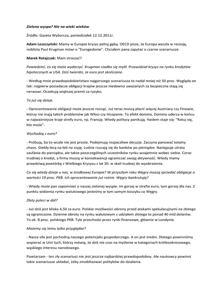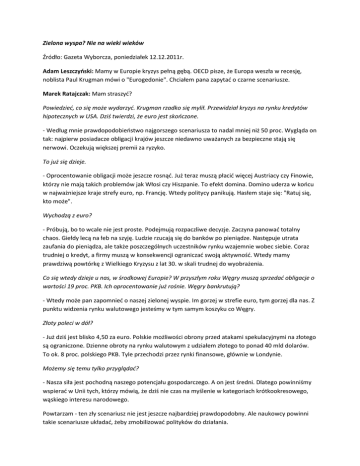 Zielona wyspa? Nie na wieki wieków Źródło: Gazeta Wyborcza, poniedziałek 12.12.2011r. Adam Leszczyński: Mamy w Europie kryzys pełną gębą. OECD pisze, że Europa weszła w recesję, noblista Paul Krugman mówi o "Eurogedonie". Chciałem pana zapytad o czarne scenariusze. Marek Ratajczak: Mam straszyd? Powiedzied, co się może wydarzyd. Krugman rzadko się mylił. Przewidział kryzys na rynku kredytów hipotecznych w USA. Dziś twierdzi, że euro jest skooczone. - Według mnie prawdopodobieostwo najgorszego scenariusza to nadal mniej niż 50 proc. Wygląda on tak: najpierw posiadacze obligacji krajów jeszcze niedawno uważanych za bezpieczne stają się nerwowi. Oczekują większej premii za ryzyko. To już się dzieje. - Oprocentowanie obligacji może jeszcze rosnąd. Już teraz muszą płacid więcej Austriacy czy Finowie, którzy nie mają takich problemów jak Włosi czy Hiszpanie. To efekt domina. Domino uderza w koocu w najważniejsze kraje strefy euro, np. Francję. Wtedy politycy panikują. Hasłem staje się: "Ratuj się, kto może". Wychodzą z euro? - Próbują, bo to wcale nie jest proste. Podejmują rozpaczliwe decyzje. Zaczyna panowad totalny chaos. Giełdy lecą na łeb na szyję. Ludzie rzucają się do banków po pieniądze. Następuje utrata zaufania do pieniądza, ale także poszczególnych uczestników rynku wzajemnie wobec siebie. Coraz trudniej o kredyt, a firmy muszą w konsekwencji ograniczad swoją aktywnośd. Wtedy mamy prawdziwą powtórkę z Wielkiego Kryzysu z lat 30. w skali trudnej do wyobrażenia. Co się wtedy dzieje u nas, w środkowej Europie? W przyszłym roku Węgry muszą sprzedad obligacje o wartości 19 proc. PKB. Ich oprocentowanie już rośnie. Węgry bankrutują? - Wtedy może pan zapomnied o naszej zielonej wyspie. Im gorzej w strefie euro, tym gorzej dla nas. Z punktu widzenia rynku walutowego jesteśmy w tym samym koszyku co Węgry. Złoty poleci w dół? - Już dziś jest blisko 4,50 za euro. Polskie możliwości obrony przed atakami spekulacyjnymi na złotego są ograniczone. Dzienne obroty na rynku walutowym z udziałem złotego to ponad 40 mld dolarów. To ok. 8 proc. polskiego PKB. Tyle przechodzi przez rynki finansowe, głównie w Londynie. Możemy się temu tylko przyglądad? - Nasza siła jest pochodną naszego potencjału gospodarczego. A on jest średni. Dlatego powinniśmy wspierad w Unii tych, którzy mówią, że dziś nie czas na myślenie w kategoriach krótkookresowego, wąskiego interesu narodowego. Powtarzam - ten zły scenariusz nie jest jeszcze najbardziej prawdopodobny. Ale naukowcy powinni takie scenariusze układad, żeby zmobilizowad polityków do działania. Słabo to ich mobilizuje. Było paru takich, którzy przewidzieli kryzys. Np. w 2005 r. znany ekonomista Raghuram Rajan został wytupany na konferencji w Jackson Hole, kiedy przed śmietanką finansistów przedstawił scenariusz kryzysu. Nikt go nie potraktował poważnie, a miał rację. - Bo wszystko się znakomicie kręciło. Pamięta pan jeszcze sprzed dziesięciu lat pojęcie "nowej ekonomii"? Ameryka miała byd pierwszym przykładem. Miały zniknąd cykle koniunkturalne i kryzysy. Noblista Robert Lucas oświadczył w 2003 r., że "problem zapobiegania kryzysom został rozwiązany". - Ciekawe, prawda? A można znaleźd sporo takich cytatów. Wtedy wielu ekonomistów myślało, że nie warto już uczyd studentów o cyklu koniunkturalnym, o Wielkim Kryzysie, o Keynesie - bo to człowiek, który po Wielkim Kryzysie chciał zepsud kapitalizm socjalistycznymi pomysłami. Euro miało pomóc Europie, a dziś jest kulą u nogi. - Pomysłodawcom chodziło o to, żeby stworzyd jeden organizm: większy, silniejszy, odporniejszy na wstrząsy. Tworząc strefę euro, częściowo jednak złożono ekonomię na ołtarzu polityki. Robert Mundell, noblista, uważany jest za ojca euro. Gdyby jednak przeczytano, co pisał, okazałoby się, że obejmowanie jedną walutą tak różnych gospodarek to zły pomysł. Gospodarek o różnym poziomie rozwoju, ale też różnych instytucjach. W Grecji można spędzid miesiąc i zwłaszcza w sektorze usług nie dostad paragonu fiskalnego. W Niemczech to raczej nie do pomyślenia. Może więc wyrzudmy Greków z euro? Niech zbankrutują i wprowadzą drachmę. Wakacje będą taosze. - Gdyby chodziło tylko o Grecję, nie byłoby dużego kłopotu. Nowa drachma poleciałaby w dół. Grecy obudziliby się dużo biedniejsi. Towary greckie stałyby się bardziej konkurencyjne, a wakacje taosze. Częśd długów by im darowano, a częśd rozłożono na raty. Czyste bankructwo małego kraju. W czym więc problem? - W traktacie z Maastricht nie przewidziano wyjścia z euro. Poza tym tego się nie da zrobid szybko. Nowe banknoty trzeba wydrukowad. I po jakim kursie przeliczyd euro na drachmę? A co z kredytami w zagranicznych bankach? Gdybym był Grekiem, powiedziałbym: "Niech się martwią zagraniczne banki". - Ale instytucje zagraniczne mogą bardziej dokuczyd Grekom niż odwrotnie. Poza tym nie ma wyjścia z euro - jest wyjście z Unii. To byłaby katastrofa. Choroba nie dotyczy już kilku krajów albo banków włoskich czy niemieckich. Samo euro jest postrzegane jako pieniądz niebezpieczny. I nawet Niemcy - silna gospodarka - mają problem ze sprzedażą obligacji. A bankructwo Grecji? Bankructwo kraju to fatalna wiadomośd dla jego obywateli. Dług Kowalskiego to dług Kowalskiego. Mogę mu współczud, ale nie muszę jego długu spłacad. Tymczasem niewypłacalne paostwo musi pozbawid obywateli części ich majątku - przez inflację, niewykupywanie na zakładanych warunkach obligacji albo podwyżkę podatków. Protestujący na ulicach Grecy nie chcą zaakceptowad tego, że dług Grecji to nie problem premiera i ministrów, ale przeciętnego Greka, który przez wiele lat nie martwił się, że paostwo się zadłuża, bo częściowo finansowało z tego różne przywileje. Minister Sikorski apelował do Niemiec, żeby uratowały Europę