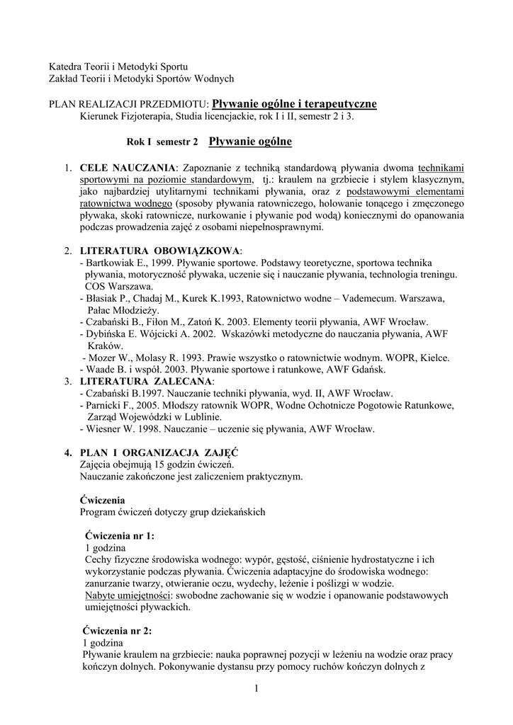 Katedra Teorii i Metodyki Sportu Zakład Teorii i Metodyki Sportów Wodnych PLAN REALIZACJI PRZEDMIOTU: Pływanie ogólne i terapeutyczne Kierunek Fizjoterapia, Studia licencjackie, rok I i II, semestr 2 i 3. Rok I semestr 2 Pływanie ogólne 1. CELE NAUCZANIA: Zapoznanie z techniką standardową pływania dwoma technikami sportowymi na poziomie standardowym, tj.: kraulem na grzbiecie i stylem klasycznym, jako najbardziej utylitarnymi technikami pływania, oraz z podstawowymi elementami ratownictwa wodnego (sposoby pływania ratowniczego, holowanie tonącego i zmęczonego pływaka, skoki ratownicze, nurkowanie i pływanie pod wodą) koniecznymi do opanowania podczas prowadzenia zajęć z osobami niepełnosprawnymi. 2. LITERATURA OBOWIĄZKOWA: - Bartkowiak E., 1999. Pływanie sportowe. Podstawy teoretyczne, sportowa technika pływania, motoryczność pływaka, uczenie się i nauczanie pływania, technologia treningu. COS Warszawa. - Błasiak P., Chadaj M., Kurek K.1993, Ratownictwo wodne – Vademecum. Warszawa, Pałac Młodzieży. - Czabański B., Fiłon M., Zatoń K. 2003. Elementy teorii pływania, AWF Wrocław. - Dybińska E. Wójcicki A. 2002. Wskazówki metodyczne do nauczania pływania, AWF Kraków. - Mozer W., Molasy R. 1993. Prawie wszystko o ratownictwie wodnym. WOPR, Kielce. - Waade B. i współ. 2003. Pływanie sportowe i ratunkowe, AWF Gdańsk. 3. LITERATURA ZALECANA: - Czabański B.1997. Nauczanie techniki pływania, wyd. II, AWF Wrocław. - Parnicki F., 2005. Młodszy ratownik WOPR, Wodne Ochotnicze Pogotowie Ratunkowe, Zarząd Wojewódzki w Lublinie. - Wiesner W. 1998. Nauczanie – uczenie się pływania, AWF Wrocław. 4. PLAN I ORGANIZACJA ZAJĘĆ Zajęcia obejmują 15 godzin ćwiczeń. Nauczanie zakończone jest zaliczeniem praktycznym. Ćwiczenia Program ćwiczeń dotyczy grup dziekańskich Ćwiczenia nr 1: 1 godzina Cechy fizyczne środowiska wodnego: wypór, gęstość, ciśnienie hydrostatyczne i ich wykorzystanie podczas pływania. Ćwiczenia adaptacyjne do środowiska wodnego: zanurzanie twarzy, otwieranie oczu, wydechy, leżenie i poślizgi w wodzie. Nabyte umiejętności: swobodne zachowanie się w wodzie i opanowanie podstawowych umiejętności pływackich. Ćwiczenia nr 2: 1 godzina Pływanie kraulem na grzbiecie: nauka poprawnej pozycji w leżeniu na wodzie oraz pracy kończyn dolnych. Pokonywanie dystansu przy pomocy ruchów kończyn dolnych z 1 przyborem pomocniczym i bez pomocy sprzętu. Nabyte umiejętności: opanowanie ruchów lokomocyjnych w pływaniu na grzbiecie. Ćwiczenia nr 3: 1 godzina Pływanie stylem grzbietowym: nauka pracy ramion do stylu grzbietowego. Nabyte umiejętności: opanowanie ruchów lokomocyjnych w pływaniu na grzbiecie. Ćwiczenia nr 4: 1 godzina Pływanie stylem grzbietowym: nauka koordynacji pracy ramion z oddychaniem oraz koordynacji pracy ramion i nóg do stylu grzbietowego. Pływanie stylem grzbietowym 2, 4, 6 – cio uderzeniowym. Nabyte umiejętności: opanowanie pływania kraulem na grzbiecie na poziomie standardowym. Ćwiczenia nr 5: 1 godzina Doskonalenie pływania stylem grzbietowym. Nauka startu i nawrotu. Pływanie krótkich i długich odcinków z różną szybkością. Nabyte umiejętności: doskonalenie pływania kraulem na grzbiecie na poziomie standardowym. Ćwiczenia nr 6: 1 godzina Pływanie stylem klasycznym: nauka pracy nóg do stylu klasycznego z przyborem pomocniczym i bez pomocy sprzętu, wykonując wydech na powierzchni i do wody. Nabyte umiejętności: opanowanie ruchów lokomocyjnych w pływaniu stylem klasycznym. Ćwiczenia nr 7: 1 godzina Pływanie stylem klasycznym: nauka pracy ramion do stylu klasycznego, koordynacja prac ramion z oddychaniem. Nabyte umiejętności: opanowanie ruchów lokomocyjnych i koordynacji ruchowej w pływaniu stylem klasycznym. Ćwiczenia nr 8: 1 godzina Pływanie stylem klasycznym: nauka koordynacji pracy ramion i nóg do stylu klasycznego. Nabyte umiejętności: opanowanie pływania stylem klasycznym na poziomie standardowym. Ćwiczenia nr 9: 1 godzina Doskonalenie pływanie stylem klasycznym. Nauka startu i nawrotu do stylu klasycznego. Pływanie dystansu w różnym tempie, przepływanie odcinków największą i najmniejszą liczbą cykli ruchowych. Nabyte umiejętności: doskonalenie pływania stylem klasycznym na poziomie standardowym. 2 Ćwiczenia nr 10: 1 godzina Doskonalenie poznanych umiejętności, tj. pływania stylem grzbietowym i stylem klasycznym. Doskonalenie skoku startowego oraz startu do stylu grzbietowego i klasycznego. Nabyte umiejętności: Doskonalenie pływania kraulem na grzbiecie i stylem klasycznym na poziomie standardowym. Ćwiczenia nr 11. 1 godzina Ratownictwo wodne. Nauka pływania sposobami ratowniczymi. Nabyte umiejętności: Opanowanie podstawowych umiejętności ratowniczych. Ćwiczenia nr 12. 1 godzina Ratownictwo wodne. Nauka sposobów holowania zmęczonego i tonącego pływaka. Nabyte umiejętności: Opanowanie podstawowych umiejętności ratowniczych. Ćwiczenia nr 13. 1 godzina Ratownictwo wodne. Nauka skoków ratowniczych: rozkrocznego, wykrocznego, bomby. Nabyte umiejętności: Opanowanie podstawowych umiejętności ratowniczych. Ćwiczenia nr 14. 1 godzina Ratownictwo wodne. Nauka nurkowania – zejście scyzorykiem oraz pływania pod wodą. Nabyte umiejętności: Opanowanie podstawowych umiejętności ratowniczych. Ćwiczenia nr 15. 1 godzina Zaliczenie semestru : przepłynięcie 50 m stylem grzbietowym ze startem i nawrotem 50 m stylem klasycznym ze startem i nawrotem Oceniana jest poprawna technika pływania dwoma stylami. Obecności na zajęciach 100% - 1. 3 Rok II, semestr 3, Pływanie terapeutyczne 1. CELE NAUCZANIA: Zaznajomienie z możliwościami wykorzystania środowiska wodnego dla celów korekcji wad postawy, terapii różnego rodzaju schorzeń oraz uczestnictwa w sporcie pływackim osób niepełnosprawnych. Modyfikacje stylów pływackich w zależności od dysfunkcji ruchowej. Prowadzenie zajęć terapeutycznych indywidualn