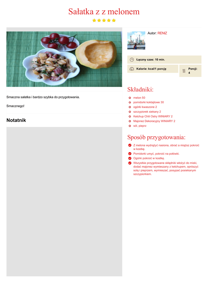 Sałatka z z melonem Autor: RENIZ Łączny czas: 10 min. Kalorie: kcal/1 porcję Porcji: 4 Składniki: Smaczna sałatka i bardzo szybka do przygotowania. melon 50 pomidorki koktajlowe 30 Smacznego! ogórki kwaszone 2 szczypiorek siekany 2 Ketchup Chili Ostry WINIARY 2 Notatnik Majonez Dekoracyjny WINIARY 2 sól, pieprz Sposób przygotowania: Z melona wydrążyć nasiona, obrać a miąższ pokroić w kostkę. Pomidorki umyć, pokroić na połówki. Ogórki pokroić w kostkę. Wszystkie przygotowane skłądniki włożyć do miski, dodać majonez wymieszany z ketchupem, oprószyć solą i pieprzem, wymieszać, posypać posiekanym szczypiorkiem.