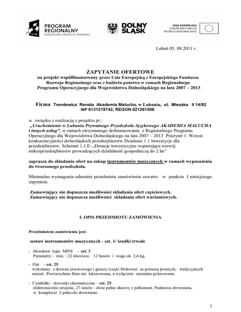 §1 §1 Lubań 05. 08.2011 r. ZAPYTANIE OFERTOWE na projekt współfinansowany przez Unie Europejską z Europejskiego Funduszu Rozwoju Regionalnego oraz z budżetu państwa w ramach Regionalnego Programu Operacyjnego dla Województwa Dolnośląskiego na lata 2007 – 2013 Firma Trendewicz Renata Akademia Malucha, w Lubaniu, ul. Mieszka II 14/92 NIP 6131219742, REGON 021261508 w związku z realizacją z projektu pt.: „Uruchomienie w Lubaniu Prywatnego Przedszkola Językowego AKADEMIA MALUCHA i innych usług”, w ramach otrzymanego dofinansowania z Regionalnego Programu Operacyjnego dla Województwa Dolnośląskiego na lata 2007 – 2013 Priorytet 1. Wzrost konkurencyjności dolnośląskich przedsiębiorstw Działanie 1.1 Inwestycje dla przedsiębiorstw. Schemat 1.1.E: „Dotacje inwestycyjne wspierające rozwój mikroprzedsiębiorstw prowadzących działalność gospodarczą do 2 lat ” zaprasza do składania ofert na zakup instrumentów muzycznych w ramach wyposażenia do tworzonego przedszkola. Minimalne wymagania odnośnie przedmiotu zamówienia zawarto w punkcie I niniejszego zapytania. Zamawiający nie dopuszcza możliwości składania ofert częściowych. Zamawiający nie dopuszcza możliwości składania ofert wariantowych. I. OPIS PRZEDMIOTU ZAMÓWIENIA Przedmiotem zamówienia jest: zestaw instrumentów muzycznych - szt. 1/ środki trwałe - Akordeon typu MINI - szt. 3 Parametry - min. : 22 klawisze, 12 basów i waga ok. 2,6 kg, - Flet - szt. 25 wykonany z drewna jaworowego i gruszy (część blokowa) za pomocą prostych, tradycyjnych metod. Powierzchnia fletu nie lakierowana, a wyłącznie starannie polerowana. - Cymbałki - dzwonki chromatyczne – szt. 25 elektronicznie strojone, 27 tonów - dwie pełne oktawy z półtonami. Podstawa drewniana, w komplecie 2 pałeczki drewniane. 1 §1 §1 - Organy elektryczne - szt. 1 Ok. 60 dynamicznych klawiszy, powyżej 400 brzmień, ok. 100 akompaniamentów. Dodatkowe wyposażenie : zasilacz, pulpit na nuty i instrukcja w języku polskim. - Organy elektryczne - szt. 1 Ok. 60 dynamicznych klawiszy, powyżej 700 brzmień, powyżej 150 akompaniamentów. Dodatkowe wyposażenie: zasilacz, pulpit na nuty i instrukcja w języku polskim. - Gitara klasyczna ½ na specjalnej podpórce dla dzieci - skala ½. - szt. 1 Zamawiający prosi o przedstawienie oferty odnośnie w/w instrumentów z uwzględnieniem parametrów technicznych wskazanych powyżej – lub równoważnych, ale nie gorszych niż zostały wskazane. II. TERMIN I MIEJSCE WYKONANIA ZAMÓWIENIA Zamawiający jest zainteresowany terminem realizacji przedmiotu zamówienia nie później niż do 25 sierpnia 2011 roku, z transportem na adres: Przedszkole AKADEMIA MALUCHA 59-800 Lubań, ul. Armii Krajowej 9, woj. Dolnośląskie III . ZAWARTOŚĆ OFERTY 1.Sposób przygotowania oferty: Uprzejmie prosimy o złożenie kompletnej oferty w języku polskim zawierającej: - pełną nazwę oferenta z danymi umożliwiającymi kontakt przy pomocy telefonu, faksu i maila, - opis techniczny, uwzględniający oczekiwane, lub równoważne parametry techniczne. W przypadku parametrów równoważnych prosimy o szczegółowe wyjaśnienie ich jakości i funkcjonalności, w odniesieniu do parametrów oczekiwanych. - termin i warunki dostawy, - warunki płatności, - warunki gwarancyjne i serwisowe. 2. Oferta musi zawierać: cenę podaną w formie netto i brutto z wyróżnieniem wysokości podatku VAT (zgodnej z obowiązującymi przepisami). IV. KRYTERIA OCENY OFERT Wybór najkorzystniejszej oferty nastąpi w oparciu o następujące kryteria: Kryterium; cena netto – 100 % 2 §1 §1 Sposób oceny ofert: Zamawiający dokona oceny ofert na podstawie wyniku osiągniętej liczby punktów wyliczonych w oparciu o wyżej wskazane kryterium i ustaloną punktację do 100 punktów ( 100 %=100 pkt.) 1. punkty za kryterium „cena netto” : Cena oferty najtańszej -------------------------------- x 100 = ilość punktów Cena oferty badanej Ilość punktów za kryterium stanowić będzie końcową ocenę oferty. Zamawiający wybierze najkorzystniejszą ofertę , w oparciu o podane kryterium i podpisze umowę z wybranym Wykonawcą. Zamawiający przy dokonywaniu wyboru Wykonawcy będzie się kierował elementarnymi zasadami obowiązującymi na wspólnotowym jednolitym rynku europejskim, min: - zasadą przejrzystości i jawności prowadzonego postępowania, - zasada ochrony uczciwej konkurencji, - zasadą swobody przepływu kapitału, towarów, dóbr i usług, - zasadą niedyskryminacji i równego traktowania wykonawców na rynku Wybór zostanie dokonany w oparciu o ofertę najbardziej korzystną ekonomicznie i jakościowo. V. MIEJSCE, SPOSÓB I TERMIN SKŁADANIA OFERT 1. Ofertę należy złożyć w terminie do dnia 11 sierpnia 2011 roku, do godziny 15:00 pocztą tradycyjną, kurierską na adres: Trendewicz Renata Akademia Malucha, 59-800 Lubań, ul. Mieszka II 14/92, lub osobiście w siedzibie firmy. 2. Oferty złożone po terminie nie będą rozpatrywane. Decyduje data i godzina wpływu oferty. VI . ROZSTRZYGNIĘCIE / WYBÓR OFERTY Rozpatrzenie ofert nastąpi 12 sierpnia 2011 roku. o godz.12.00. w siedzibie firmy. Wyniki zostaną opublikowane na stronie internetowej Zamawiającego: www.przedszkoleluban.pl Jeżeli Firma, której oferta została wybrana, uchyla się od zawarcia umowy, Zamawiający może wybrać ofertę najkorzystniejszą spośród pozostałych ofert. 3 §1 §1 VII. SPOSÓB UDZIELANIA INFORMACJI I WYJAŚNIEŃ Szczegółowych informacji na temat przedmiotu zamówienia udziela Renta Trendewicz , tel.: 509 516 468 VIII. DODATKOWE WARUNKI UDZIAŁU W POSTĘPOWANIU W przypadku, gdy w określonym w niniejszym zapytaniu ofertowym terminie nie wpłynie żadna oferta, lub wpłynie/wpłyną mniej niż 2 ważne oferty, Zamawiający unieważnia to postępowanie i dokonuje wyboru dowolnego Wykonawcy, który spełnia wszystkie kryteria i warunki określone w niniejszym zapytaniu ofertowym. Zmawiający zastrzega sobie prawo do 