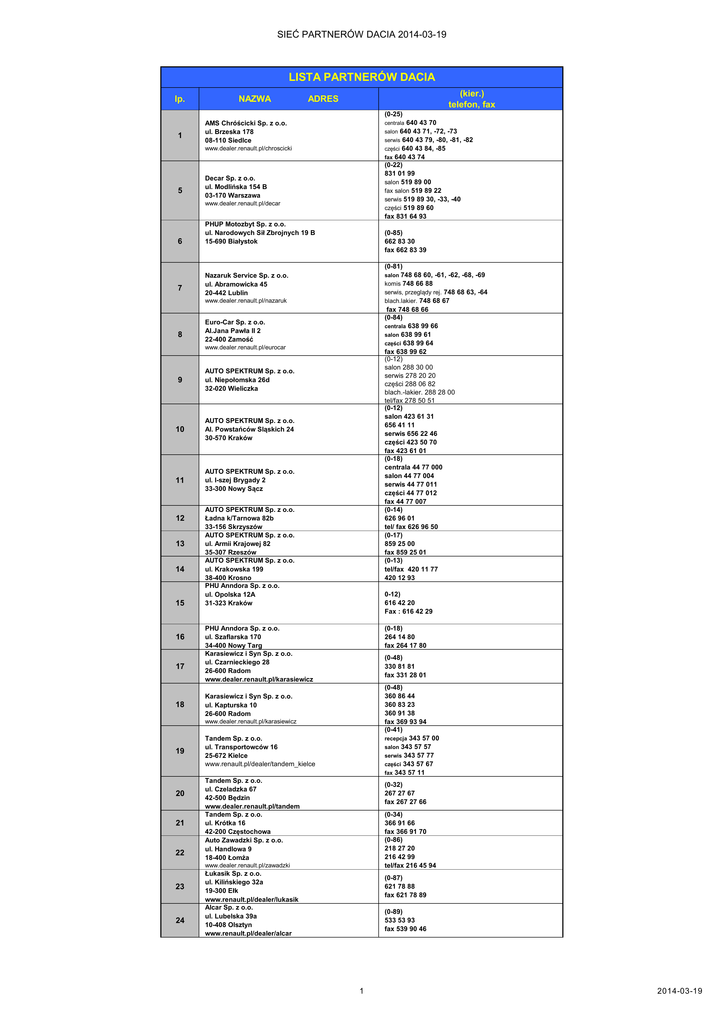 SIEĆ PARTNERÓW DACIA 2014-03-19 LISTA PARTNERÓW DACIA lp. NAZWA (kier.) telefon, fax ADRES (0-25) 1 AMS Chróścicki Sp. z o.o. ul. Brzeska 178 08-110 Siedlce centrala 640 43 70 salon 640 43 71, -72, -73 serwis 640 43 79, -80, -81, -82 części 640 43 84, -85 fax 640 43 74 (0-22) 831 01 99 salon 519 89 00 fax salon 519 89 22 serwis 519 89 30, -33, -40 części 519 89 60 fax 831 64 93 www.dealer.renault.pl/chroscicki 5 Decar Sp. z o.o. ul. Modlińska 154 B 03-170 Warszawa www.dealer.renault.pl/decar 6 7 PHUP Motozbyt Sp. z o.o. ul. Narodowych Sił Zbrojnych 19 B 15-690 Białystok (0-85) 662 83 30 fax 662 83 39 (0-81) salon 748 68 60, -61, -62, -68, -69 komis 748 66 88 serwis, przeglądy rej. 748 68 63, -64 blach.lakier. 748 68 67 fax 748 68 66 (0-84) centrala 638 99 66 salon 638 99 61 części 638 99 64 fax 638 99 62 (0-12) salon 288 30 00 serwis 278 20 20 części 288 06 82 blach.-lakier. 288 28 00 tel/fax 278 50 51 (0-12) salon 423 61 31 656 41 11 serwis 656 22 46 części 423 50 70 fax 423 61 01 (0-18) centrala 44 77 000 salon 44 77 004 serwis 44 77 011 części 44 77 012 fax 44 77 007 (0-14) 626 96 01 tel/ fax 626 96 50 (0-17) 859 25 00 fax 859 25 01 (0-13) tel/fax 420 11 77 420 12 93 Nazaruk Service Sp. z o.o. ul. Abramowicka 45 20-442 Lublin www.dealer.renault.pl/nazaruk 8 Euro-Car Sp. z o.o. Al.Jana Pawła II 2 22-400 Zamość www.dealer.renault.pl/eurocar 9 AUTO SPEKTRUM Sp. z o.o. ul. Niepołomska 26d 32-020 Wieliczka 10 AUTO SPEKTRUM Sp. z o.o. Al. Powstańców Sląskich 24 30-570 Kraków 11 AUTO SPEKTRUM Sp. z o.o. ul. I-szej Brygady 2 33-300 Nowy Sącz 12 13 14 15 16 17 18 AUTO SPEKTRUM Sp. z o.o. Ładna k/Tarnowa 82b 33-156 Skrzyszów AUTO SPEKTRUM Sp. z o.o. ul. Armii Krajowej 82 35-307 Rzeszów AUTO SPEKTRUM Sp. z o.o. ul. Krakowska 199 38-400 Krosno PHU Anndora Sp. z o.o. ul. Opolska 12A 31-323 Kraków 0-12) 616 42 20 Fax : 616 42 29 PHU Anndora Sp. z o.o. ul. Szaflarska 170 34-400 Nowy Targ Karasiewicz i Syn Sp. z o.o. ul. Czarnieckiego 28 26-600 Radom www.dealer.renault.pl/karasiewicz (0-18) 264 14 80 fax 264 17 80 (0-48) 330 81 81 fax 331 28 01 (0-48) 360 86 44 360 83 23 360 91 38 fax 369 93 94 (0-41) recepcja 343 57 00 salon 343 57 57 serwis 343 57 77 części 343 57 67 fax 343 57 11 Karasiewicz i Syn Sp. z o.o. ul. Kapturska 10 26-600 Radom www.dealer.renault.pl/karasiewicz 19 20 21 22 Tandem Sp. z o.o. ul. Transportowców 16 25-672 Kielce www.renault.pl/dealer/tandem_kielce Tandem Sp. z o.o. ul. Czeladzka 67 42-500 Będzin www.dealer.renault.pl/tandem Tandem Sp. z o.o. ul. Krótka 16 42-200 Częstochowa Auto Zawadzki Sp. z o.o. ul. Handlowa 9 18-400 Łomża (0-32) 267 27 67 fax 267 27 66 (0-34) 366 91 66 fax 366 91 70 (0-86) 218 27 20 216 42 99 tel/fax 216 45 94 www.dealer.renault.pl/zawadzki 23 24 Łukasik Sp. z o.o. ul. Kilińskiego 32a 19-300 Ełk www.renault.pl/dealer/lukasik Alcar Sp. z o.o. ul. Lubelska 39a 10-408 Olsztyn www.renault.pl/dealer/alcar (0-87) 621 78 88 fax 621 78 89 (0-89) 533 53 93 fax 539 90 46 1 2014-03-19 SIEĆ PARTNERÓW DACIA 2014-03-19 LISTA PARTNERÓW DACIA lp. 25 NAZWA (kier.) telefon, fax ADRES PUH Zdunek Sp. z o.o. ul. Miałki Szlak 43/45 80-717 Gdańsk (0-58) 326 52 52 fax 300 02 13 www.dealer.renault.pl/zdunek 26 27 28 PUH Zdunek Sp. z o.o. ul. Morska 517a 81-002 Gdynia (0-58) 664 09 00 fax 623 62 67 PHU Ossowscy Sp. z o.o. Kazimierzowo 7a 82-300 Elbląg www.renault.pl/dealer/ossowscy Adamowscy Sp. z o.o. ul. Szosa Toruńska 29A 86-300 Grudziądz (0-55) 232 70 75 232 62 37 fax 232 61 76 (0-56) 463 57 05 463 57 70 fax 463 58 10 (0-58) 563 33 33 serwis wew. 23 części wew. 31 fax 562 77 60 (0-52) recepcja 360 25 60 salon 360 25 51, -52, -53, -54 części 360 25 55, -56 serwis 360 25 40, -41 fax 320 93 95 www.renault.pl/dealer/adamowscy_grudziadz 29 Adamowscy Sp. z o.o. ul. Zblewska 33 83-200 Starogard Gd. www.renault.pl/dealer/adamowscy_starogard 30 P.W.Uni-Car S.A. ul. Modrzewiowa 7 85-631 Bydgoszcz www.dealer.renault.pl/unicar (0-56) recepcja 31 61 10 500 61 10 510 salon 61 10 520 serwis 61 10 530 części 61 10 540 naprawy karoserii 61 10 570 stacja kontroli pojazdów 61 10 555 fax 61 10 511 (0-54) 411 09 00 411 09 01 fax 411 09 02 sekretariat "Uni-Car Dwa" Sp. z o.o. ul. C.Skłodowskiej 67a 87-100 Toruń www.dealer.renault.pl/uni_car_dwa 32 Auto - Serwis Pasikowski Sp. z o.o. ul. Polna 100 87-800 Włocławek www.dealer.renault.pl/pasikowski 33 Auto - Serwis Pasikowski Sp. z o.o. ul. Bielska 70 09-402 Płock (0-24) 267 94 80 fax 267 94 80 www.dealer.renault.pl/pasikowski 34 Opaliński Sp. z o.o. ul. Słupska 5 76-251 Bolesławice k/Słupska (0-59) 841 53 32 tel/fax 841 53 47 www.dealer.renault.pl/opalinski 35 Franciszek Dubnicki Sp. z o.o. ul. Gnieźnieńska 81 75-736 Koszalin www.renault.pl/dealer/dubnicki 36 Auto-Compol S.A. ul. Rivoliego 2b 62-030 Luboń k/Poznania 37 (0-94) centrala 347 14 20 salon 347 14 21 - 25 fax salon 347 14 30 części 347 14 28 serwis 347 14 27, 347 14 31 (0-61) 810 21 30 salon 813 08 17 serwis fax 810 22 95 (0-61) 858 11 50 sekretariat 858 11 60 salon 858 11 70 serwis 858 11 80 części zam. 858 11 85 serwis karoseria 858 11 71 stacja kontroli poj. fax 852 47 25 (0-95) 759 00 39 755 00 40 fax 758 10 58 (0-95) centrala 720 20 90 salon 728 43 11 serwis 728 43 14 części 728 43 18 fax 728 43 16 (0-61) salon 847 44 32 serwis 848 49 34 fax 847 76 74 (0-61) 811 60 61 fax 811 61 17 Auto-Compol S.A. ul. Kazimierza Wlk. 1 61-863 Poznań www.dealer.renault.pl/auto_compol 38 39 DA-KO Kozubal Sp. z o.o. ul. Wojska Polskiego 71 69-100 Słubice www.dealer.renault.pl/dako DA-KO Kozubal Sp. z o.o. Al. 11-go Listopada 5 66-400 Gorzów Wlkp. www.dealer.renault.pl/dako 40 Pieluszyńska Sp. z o.o. ul. Kościelna 58 60-539 Poznań www.dealer.renault.pl/pieluszyńska 41 42 Pieluszyńska Sp. z o.o. ul. Obornicka 137 62-002 Suchy Las k/Poznania "Rosiak i Syn" Sp. z o.o. ul. Poznańska 168/170 62-052 Komorniki k/Poznania (0-61) 89 36 950 fax 89 36 951 www.dealer.renault.pl/rosiak 43 44 "Rosiak i Syn" Sp. z o.o. ul. Bulwar Gd