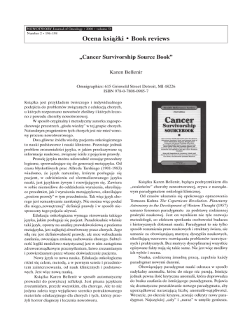 NOWOTWORY Journal of Oncology • 2008 • volume 58 Number 2 • 196–198 Ocena książki • Book reviews „Cancer Survivorship Source Book” Karen Bellenir Omnigraphics: 615 Griswold Street Detroit, MI 48226 ISBN 978-0-7808-0985-7 Książka jest przykładem twórczego i indywidualnego podejścia do problemów związanych z edukacją chorych, u których rozpoznano nowotwór złośliwy i których leczono z powodu choroby nowotworowej. W sposób oryginalny i metodyczny autorka zagospodarowuje przestrzeń „głodu wiedzy” w tej grupie chorych. Naturalnym pragnieniem tych chorych jest nie mieć wznowy procesu nowotworowego. Dwa główne źródła wiedzy pacjenta onkologicznego to nauki podstawowe i nauki kliniczne. Pozostaje jednak problem zrozumiałości języka, w jakim przekazywane są informacje naukowe, związany ściśle z pojęciem prawdy. Prawdę języka można udowodnić stosując procedury logiczne, sprowadzające się do generacji metajęzyka. Od czasu błyskotliwych prac Alfreda Tarskiego (1901-1983) wiadomo, że język naturalny, którym posługuje się pacjent, w odróżnieniu od sformalizowanego języka nauki, jest językiem żywym i rozwijającym się. Zawiera w sobie niemożliwe do oddzielenia wyrażenia, określające przedmiot, jak i wyrażenia metajęzykowe, określające „poziom prawdy” w tym przedmiocie. Tak więc język chorego jest semantycznie zamknięty. Nie można więc podać dla niego„zewnętrznej” definicji prawdy i w sposób niesprzeczny tego pojęcia używać. Edukacja onkologiczna wymaga stosowania takiego języka, jakim posługuje się pacjent. Paradoksalnie właśnie taki język, oporny na analizę prawdziwościową z poziomu metajęzyka, jest najlepiej absorbowany przez chorych. Jego siłą nie jest definiowalność prawdy, ale moc wzbudzania zaufania, owocująca zmianą zachowania chorego. Subtelność logiki modelowo statystycznej jest w nim zastąpiona zdroworozsądkowym przemyśleniem, łatwo zrozumianym i potwierdzanym przez własne doświadczenie pacjenta. Nowy język to nowa nauka. Edukacja onkologiczna różni się celem, metodą, a w pewnym sensie i przedmiotem zainteresowania, od nauk klinicznych i podstawowych. Jest więc nową nauką. Książka Karen Bellenir w sposób automatyczny prowadzi do powyższej refleksji. Jest pisana językiem zrozumiałym, przede wszystkim, dla chorego. Ale to nie jedyna zaleta tego wyjątkowo szeroko potraktowanego materiału edukacyjnego dla chorych i tych, którzy przeżyli horror diagnozy i leczenia nowotworu. Książka Karen Bellenir, będąca podręcznikiem dla „ocaleńców” choroby nowotworowej, zrywa z narządowym paradygmatem onkologii klinicznej. Od czasów ukazania się epokowego opracowania Tomasza Kuhna The Copernican Revolution. Planetarny Astronomy in the Development of Western Thought (1957) uznano fenomen paradygmatu za podstawę codziennej praktyki naukowej. Jest on wynikiem nie tyle rozwoju metodologii, co efektem spotkania osobowości badacza i historycznych dokonań nauki. Paradygmat to nie tylko sposób rozumienia praw naukowych i struktury świata, ale uznanie za obowiązującą matrycę dyscyplin naukowych, określającą wzorcowe rozwiązania problemów teoretycznych i praktycznych. Bez matrycy dyscyplinarnej wszystkie opisywane fakty stają się takie same. Nie jest więc możliwy ich wybór i ocena. Nauka, codzienną żmudną pracą, zapełnia każdy paradygmat nowymi danymi. Obowiązujący paradygmat nauki odrzuca w sposób radykalny anomalie, które do niego nie pasują. Istnieje jednak pewna ilość krytyczna anomalii, która doprowadza do braku zaufania do istniejącego paradygmatu. Pojawia się dramatyczne poszukiwanie nowego paradygmatu, aby uporządkować narastającą liczbę anomalii-wątpliwości. Wreszcie, po okresie kryzysu, zostaje odkryty nowy paradygmat. Najczęściej „cały” i „naraz” w umyśle geniusza. 197 Znane fakty zostają wówczas rozpoznane w nowym świetle i w nowych relacjach. Taki przełom Tomasz Samuel Kuhn nazywa „Gestalt-switch” i porównuje go z …objawieniem religijnym. W historii nauki szczególnie bliski sercom Polaków był przełom kopernikański, który stworzył nowy paradygmat kosmologiczny i światopoglądowy. Książka Karen Bellenir odkrywa nową matrycę myślenia onkologicznego, które wychodzi od strony chorego i leczonego na nowotwór. W tym paradygmacie onkologia nie jest nauką o narządzie zmienionym nowotworowo, ale o chorym na nowotwór. Taki paradygmat nie tylko konweniuje z filozoficznymi założeniami humani- zmu, ale wydaje się być bardziej racjonalny wobec wyzwań nanotechnologii. Dokładnie taki sam paradygmat sformułował 40 lat przed wydaniem książki Karren Bellenir prof. Tadeusz Koszarowski (1915-2002). Książka ta jest więc praktycznym przykładem realizacji humanistycznego paradygmatu, zaproponowanego przez nestora polskiej onkologii. Tym bardziej warto zatem pokusić się o jej sprawne przetłumaczenie na język polski. Dr med. Wiktor Chmielarczyk Kierownik Samodzielnej Pracowni Edukacji Onkologicznej Centrum Onkologii – Instytutu im. M. Skłodowskiej-Curie w Warszawie „Przedstawiciele nauk medycznych członkowie Towarzystwa Naukowego Warszawskiego w latach 1907-1952” Andrzej Śródka, Edward Towpik NOWOTWORY Journal of Oncology 2007, 57: supl. 6 PL ISSN 0029-540-X Publikacja ma na celu uczczenie stulecia Towarzystwa Naukowego Warszawskiego (TNW) i stanowi suplement czasopisma Nowotwory, pod redakcją Edwarda Towpika. Towarzystwo powstało 25 listopada 1907 roku, działało do roku 1952, zostało reaktywowane w roku 1981. Przypomina o tym przedmowa E. Towpika, która podkreśla rolę lekarzy w powstaniu i działaniach Towarzystwa. Wśród założycieli byli dwaj lekarze: Henryk Fryderyk Hoyer i Ignacy Baranowski, w którego mieszkaniu odbyło się pierwsze walne posiedzenie i znalazła się siedziba Towarzystwa. Sekretarzami generalnymi byli interniści: Stefan Marian Jakowski i Wła