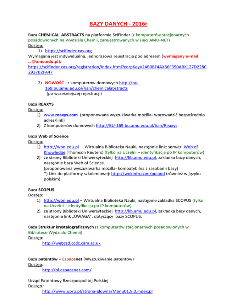 BAZY DANYCH - 2016r Baza CHEMICAL ABSTRACTS na platformie SciFinder (z komputerów stacjonarnych posadowionych na Wydziale Chemii, zarejestrowanych w sieci AMU-NET) Dostęp: 1) https://scifinder.cas.org Wymagana jest indywidualna, jednorazowa rejestracja pod adresem (wymagany e-mail …@amu.edu.pl): https://scifinder.cas.org/registration/index.html?corpKey=24B0BF4AX86F350ABX127D228C 2937B2FA47 2) NOWOŚĆ - z komputerów domowych http://bu169.bu.amu.edu.pl/han/chemicalabstracts (po wcześniejszej rejestracji) Baza REAXYS Dostęp: 1) www.reaxys.com (proponowana wyszukiwarka mozilla- wprowadzić bezpośrednio adres/link) 2) Z komputerów domowych http://BU-169.bu.amu.edu.pl/han/Reaxys Baza Web of Science Dostęp: 1) http://wbn.edu.pl – Wirtualna Biblioteka Nauki, następnie link: serwer Web of Knowledge (Thomson Reuters) (tylko na Uczelni – identyfikacja po IP komputerów) 2) ze strony Biblioteki Uniwersyteckiej http://lib.amu.edu.pl, zakładka bazy danych, następnie baza Web of Science. (proponowana wyszukiwarka mozilla- kompatybilna z zasobami bazy) *) Link do platformy szkoleniowej: http://wokinfo.com/poland (również w języku polskim) Baza SCOPUS Dostęp: 1) http://wbn.edu.pl – Wirtualna Biblioteka Nauki, następnie zakładka SCOPUS (tylko na Uczelni – identyfikacja po IP komputerów) 2) ze strony Biblioteki Uniwersyteckiej http://lib.amu.edu.pl, zakładka bazy danych, następnie link „UWAGA”, dotyczący bazy SCOPUS. Baza Struktur krystalograficznych (z komputerów stacjonarnych posadowionych w Bibliotece Wydziału Chemii) Dostęp: http://webcsd.ccdc.cam.ac.uk Baza patentów – Espacenet (Wyszukiwanie patentów) Dostęp: http://pl.espacenet.com/ Urząd Patentowy Rzeczpospolitej Polskiej Dostęp : http://www.uprp.pl/strona-glowna/Menu01,9,0,index,pl