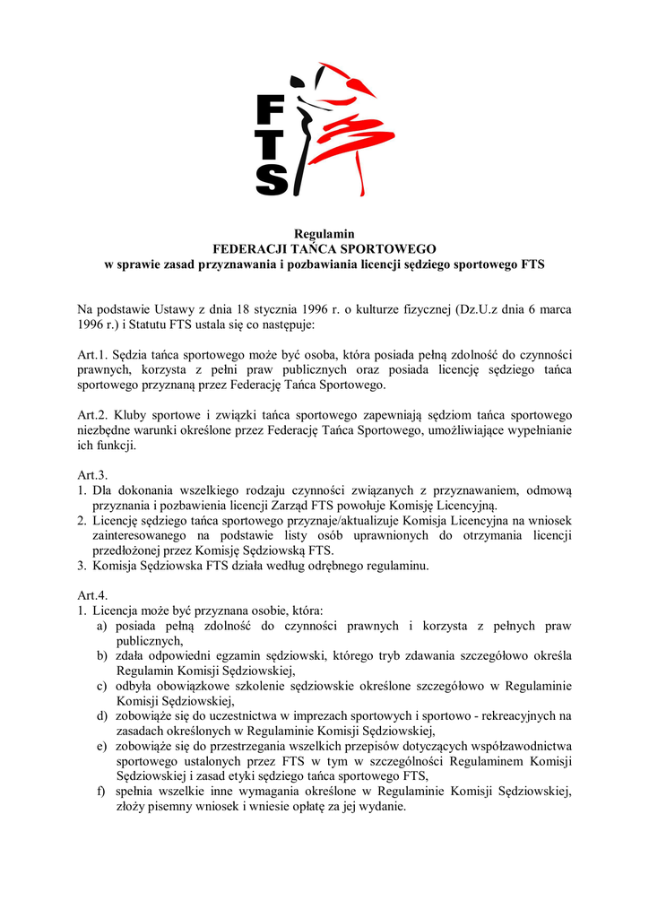 Regulamin FEDERACJI TAŃCA SPORTOWEGO w sprawie zasad przyznawania i pozbawiania licencji sędziego sportowego FTS Na podstawie Ustawy z dnia 18 stycznia 1996 r. o kulturze fizycznej (Dz.U.z dnia 6 marca 1996 r.) i Statutu FTS ustala się co następuje: Art.1. Sędzia tańca sportowego może być osoba, która posiada pełną zdolność do czynności prawnych, korzysta z pełni praw publicznych oraz posiada licencję sędziego tańca sportowego przyznaną przez Federację Tańca Sportowego. Art.2. Kluby sportowe i związki tańca sportowego zapewniają sędziom tańca sportowego niezbędne warunki określone przez Federację Tańca Sportowego, umożliwiające wypełnianie ich funkcji. Art.3. 1. Dla dokonania wszelkiego rodzaju czynności związanych z przyznawaniem, odmową przyznania i pozbawienia licencji Zarząd FTS powołuje Komisję Licencyjną. 2. Licencję sędziego tańca sportowego przyznaje/aktualizuje Komisja Licencyjna na wniosek zainteresowanego na podstawie listy osób uprawnionych do otrzymania licencji przedłożonej przez Komisję Sędziowską FTS. 3. Komisja Sędziowska FTS działa według odrębnego regulaminu. Art.4. 1. Licencja może być przyznana osobie, która: a) posiada pełną zdolność do czynności prawnych i korzysta z pełnych praw publicznych, b) zdała odpowiedni egzamin sędziowski, którego tryb zdawania szczegółowo określa Regulamin Komisji Sędziowskiej, c) odbyła obowiązkowe szkolenie sędziowskie określone szczegółowo w Regulaminie Komisji Sędziowskiej, d) zobowiąże się do uczestnictwa w imprezach sportowych i sportowo - rekreacyjnych na zasadach określonych w Regulaminie Komisji Sędziowskiej, e) zobowiąże się do przestrzegania wszelkich przepisów dotyczących współzawodnictwa sportowego ustalonych przez FTS w tym w szczególności Regulaminem Komisji Sędziowskiej i zasad etyki sędziego tańca sportowego FTS, f) spełnia wszelkie inne wymagania określone w Regulaminie Komisji Sędziowskiej, złoży pisemny wniosek i wniesie opłatę za jej wydanie. 2. Licencja przyznawana jest na czas nieokreślony. Aktualizacja licencji na dany rok dokonywana jest pod warunkiem spełnienia wymagań Art 4 i 5. 3. Licencja jest ważna po podpisaniu jej przez posiadacza, który swym podpisem potwierdza, że zna i rozumie wszelkie przepisy sportowe FTS oraz system współzawodnictwa sportowego ustalonego przez FTS w tańcu sportowym i zobowiązuje się do ich przestrzegania. Art.5. 1. Osoba ubiegająca się o przyznanie /aktualizację licencji przesyła wniosek wraz z dowodem opłaty za jej wydanie na adres biura Zarządu FTS ( ...tu podać adres) 2. Zgodnie z wymogami Art.4.1 wniosek musi zawierać: a) imię i nazwisko, datę urodzenia, pesel, adres zamieszkania, telefon, b) numer licencji (książeczki sędziowskiej), o ile ją posiadała, c) zobowiązanie do uczestnictwa w imprezach sportowych i sportowo - - rekreacyjnych na zasadach określanych w Regulaminie Komisji Sędziowskiej oraz do przestrzegania wszelkich przepisów dot. współzawodnictwa sportowego ustalonego przez FTS w tym w szczególności Regulaminu Komisji Sędziowskiej i zasad etyki sędziego tańca sportowego FTS. 3. Opłata za wydanie licencji musi być przekazana na konto (....tu podać konto). 4. Wzór wniosku określa załącznik nr 1 do niniejszego regulaminu. 5. Wysokość opłat za wydanie licencji na dany rok ustala Zarząd FTS na wniosek Komisji Licencyjnej FTS. Wysokość opłat ogłaszana jest w ostatnim kwartale roku poprzedzającego rok wydania licencji na stronie internetowej FTS. 6. Licencje przyznaje FTS w drodze decyzji administracyjnej i przesyła je na adres wnioskodawcy. Art.6. Osoba posiadająca licencję sędziego FTS ma prawo do: a) udziału w pracach komisji sędziowskich wszystkich krajowych i międzynarodowych turniejów tańca sportowego stosownie do posiadanej kategorii sędziowskiej na zasadach określonych w Regulaminie Komisji Sędziowskiej, b) podwyższania posiadanej kategorii sędziowskiej na zasadach określonych w Regulaminie Komisji Sędziowskiej, c) udziału w szkoleniach sędziowskich organizowanych przez FTS na zasadach określonych w Regulaminie Komisji Sędziowskiej. Art.7. 1. FTS może odmówić przyznania licencji sędziowskiej jeśli wnioskodawca nie spełni warunków określonych w Art.4 i 5, a braki nie zostaną uzupełnione mimo wezwania w oznaczonym terminie. 2. Licencja nie może być przyznana lub aktualizowana osobie, która: a) nie została umieszczona na dany rok przez Komisje Sędziowską FTS na liście osób uprawnionych do otrzymania licencji lub na liście uzupełniającej, b) została przez właściwy organ FTS ukarana karą dożywotniego pozbawienia licencji sędziego FTS, c) została przez właściwy organ FTS ukarana karą czasowego pozbawienia licencji sędziego FTS - w czasie odbywania kary. Art.8. 1. FTS pozbawia sędziego licencji w razie: a) rażącego nieprzestrzegania regulaminów sportowych, zasad rywalizacji sportowej, a zwłaszcza regulaminu Komisji Sędziowskiej, b) rażącego naruszania obowiązków sędziego FTS, c) nieprzestrzegania zasad etyki sędziego FTS. 2. Jeżeli przyczyny pozbawienia licencji wymienione w pkt.1 stanowią również przyczyny wszczęcia postępowania dyscyplinarnego decyzja o pozbawieniu licencji może być wydana po zakończeniu tego postępowania orzeczeniem ostatecznym. 3. Decyzja o pozbawieniu licencji wymaga uzasadnienia. Art.9. Organem odwoławczym od decyzji wymienionej w Art. 3 jest Zarząd FTS, którego decyzja jest ostateczna. Art.10.Biuro FTS prowadzi ewidencję przyznanych /aktualizowanych licencji, która powinna obejmować dane i dokumenty, o których mowa w Art. 5 , zestawienie wniesionych opłat za wydanie licencji oraz oddzielną ewidencję prawomocnych decyzji o odmowie przyznania/aktualizacji i pozbawienia licencji. Art.11. Prawo interpretacji niniejszego regulaminu przysługuje Zarządowi FTS. Art.12.Regulamin wchodzi w życie z dniem 03.08.2003 r.