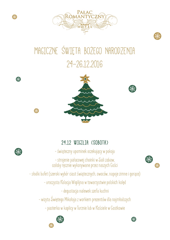 MAGICZNE SWIETA BOZEGO NARODZENIA 24-26.12.2016 24.12 WIGILIA (SOBOTA) - świąteczny upominek oczekujący w pokoju - strojenie pałacowej choinki w Sali zabaw, ozdoby ręcznie wykonywane przez naszych Gości - słodki bufet (szeroki wybór ciast świątecznych, owoców, napoje zimne i gorące) - uroczysta Kolacja Wigilijna w towarzystwie polskich kolęd - degustacja nalewek szefa kuchni - wizyta Świętego Mikołaja z workiem prezentów dla najmłodszych - pasterka w kaplicy w Turznie lub w Kościele w Gostkowie 25.12 (NIEDZIELA) - uroczyste, świąteczne śniadanie pełne naturalnych i ekologicznych produktów, live cooking - słodki bufet (szeroki wybór ciast świątecznych, mini desery, owoce, napoje zimne i gorące) - liczne atrakcje w plenerze: ognisko z kiełbaskami i grzanym winem, kulig z pochodniami lub przejażdżka bryczką (w zależności od pogody) - świąteczna obiadokolacja w formie bufetu z degustacją nalewek szefa kuchni 26.12 (PONIEDZIALEK) - uroczyste, świąteczne śniadanie pełne naturalnych i ekologicznych produktów - doba hotelowa wydłużona do godz. 16:00 DODATKOWE ATRAKCJE DLA NASZYCH GOSCI DOSTEPNE PRZEZ CALY POBYT: • • • • • • • Możliwość korzystania ze strefy mokrej SPA- sauna parowa, sucha, jacuzzi, tepidarium, sprzęt fitness- gratis 10% rabatu na wszystkie zabiegi spa Możliwość wypożyczenia filmów, gier planszowych, kart do brydża - gratis Bilard, ruletka – konieczność wcześniejszego zapisu w Recepcji - gratis W plenerze: kijki do nordic walking – gratis Monitorowany parking Bezpłatny dostęp do Internetu Cena pakietu za 2 noce Pokój 1-osobowy – 1010 zł Pokój 2-osobowy – 1630 zł Pokój 3-osobowy – 2320 zł Dzieci do lat 3 – pobyt gratis Dzieci od 4-8 lat – 420 złł Zachęcamy do wydłużenia świątecznego pobytu do wtorku 27.12 w promocyjnej cenie 270 zł ze śniadaniem (pokój dwuosobowy) W celu rezerwacji terminu pakietu prosimy o kontakt z Recepcją Hotelu**** Pałac Romantyczny w Turznie tel.: 56 642 31 00 e-mail: [email protected]