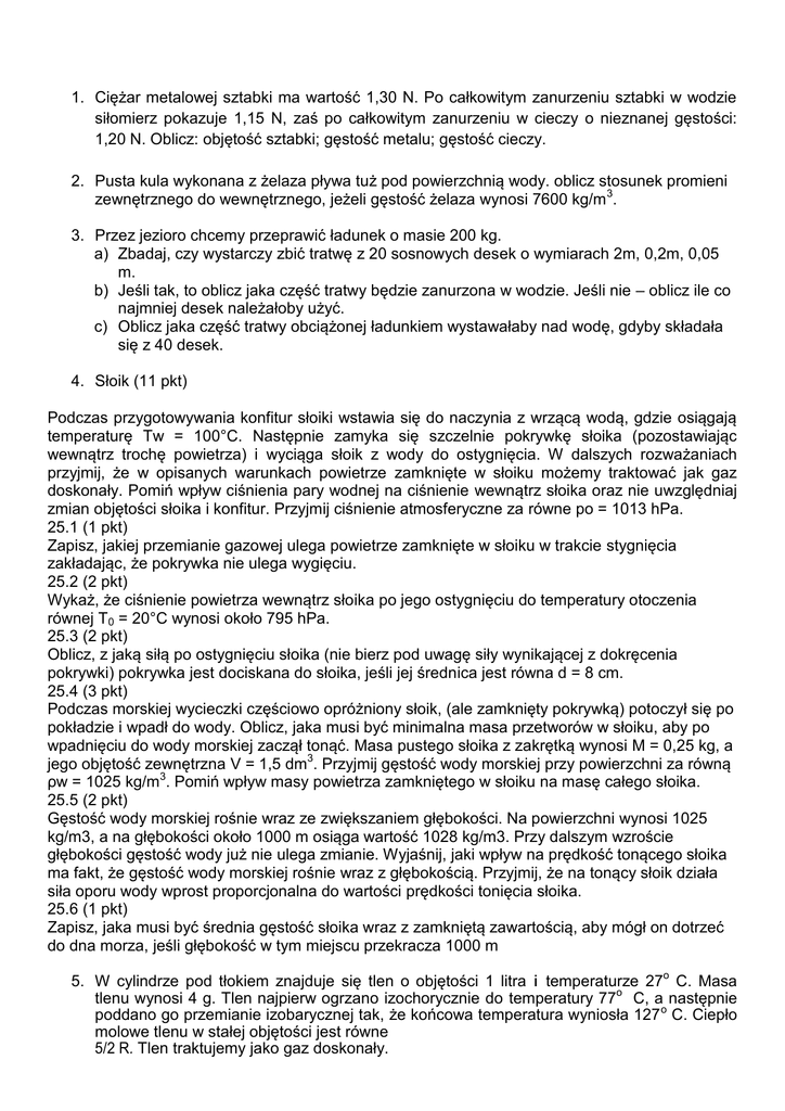 1. Ciężar metalowej sztabki ma wartość 1,30 N. Po całkowitym zanurzeniu sztabki w wodzie siłomierz pokazuje 1,15 N, zaś po całkowitym zanurzeniu w cieczy o nieznanej gęstości: 1,20 N. Oblicz: objętość sztabki; gęstość metalu; gęstość cieczy. 2. Pusta kula wykonana z żelaza pływa tuż pod powierzchnią wody. oblicz stosunek promieni zewnętrznego do wewnętrznego, jeżeli gęstość żelaza wynosi 7600 kg/m 3. 3. Przez jezioro chcemy przeprawić ładunek o masie 200 kg. a) Zbadaj, czy wystarczy zbić tratwę z 20 sosnowych desek o wymiarach 2m, 0,2m, 0,05 m. b) Jeśli tak, to oblicz jaka część tratwy będzie zanurzona w wodzie. Jeśli nie – oblicz ile co najmniej desek należałoby użyć. c) Oblicz jaka część tratwy obciążonej ładunkiem wystawałaby nad wodę, gdyby składała się z 40 desek. 4. Słoik (11 pkt) Podczas przygotowywania konfitur słoiki wstawia się do naczynia z wrzącą wodą, gdzie osiągają temperaturę Tw = 100°C. Następnie zamyka się szczelnie pokrywkę słoika (pozostawiając wewnątrz trochę powietrza) i wyciąga słoik z wody do ostygnięcia. W dalszych rozważaniach przyjmij, że w opisanych warunkach powietrze zamknięte w słoiku możemy traktować jak gaz doskonały. Pomiń wpływ ciśnienia pary wodnej na ciśnienie wewnątrz słoika oraz nie uwzględniaj zmian objętości słoika i konfitur. Przyjmij ciśnienie atmosferyczne za równe po = 1013 hPa. 25.1 (1 pkt) Zapisz, jakiej przemianie gazowej ulega powietrze zamknięte w słoiku w trakcie stygnięcia zakładając, że pokrywka nie ulega wygięciu. 25.2 (2 pkt) Wykaż, że ciśnienie powietrza wewnątrz słoika po jego ostygnięciu do temperatury otoczenia równej T0 = 20°C wynosi około 795 hPa. 25.3 (2 pkt) Oblicz, z jaką siłą po ostygnięciu słoika (nie bierz pod uwagę siły wynikającej z dokręcenia pokrywki) pokrywka jest dociskana do słoika, jeśli jej średnica jest równa d = 8 cm. 25.4 (3 pkt) Podczas morskiej wycieczki częściowo opróżniony słoik, (ale zamknięty pokrywką) potoczył się po pokładzie i wpadł do wody. Oblicz, jaka musi być minimalna masa przetworów w słoiku, aby po wpadnięciu do wody morskiej zaczął tonąć. Masa pustego słoika z zakrętką wynosi M = 0,25 kg, a jego objętość zewnętrzna V = 1,5 dm3. Przyjmij gęstość wody morskiej przy powierzchni za równą ρw = 1025 kg/m3. Pomiń wpływ masy powietrza zamkniętego w słoiku na masę całego słoika. 25.5 (2 pkt) Gęstość wody morskiej rośnie wraz ze zwiększaniem głębokości. Na powierzchni wynosi 1025 kg/m3, a na głębokości około 1000 m osiąga wartość 1028 kg/m3. Przy dalszym wzroście głębokości gęstość wody już nie ulega zmianie. Wyjaśnij, jaki wpływ na prędkość tonącego słoika ma fakt, że gęstość wody morskiej rośnie wraz z głębokością. Przyjmij, że na tonący słoik działa siła oporu wody wprost proporcjonalna do wartości prędkości tonięcia słoika. 25.6 (1 pkt) Zapisz, jaka musi być średnia gęstość słoika wraz z zamkniętą zawartością, aby mógł on dotrzeć do dna morza, jeśli głębokość w tym miejscu przekracza 1000 m 5. W cylindrze pod tłokiem znajduje się tlen o objętości 1 litra i temperaturze 27o C. Masa tlenu wynosi 4 g. Tlen najpierw ogrzano izochorycznie do temperatury 77o C, a następnie poddano go przemianie izobarycznej tak, że końcowa temperatura wyniosła 127 o C. Ciepło molowe tlenu w stałej objętości jest równe 5/2 R. Tlen traktujemy jako gaz doskonały. Oblicz: b) pracę wykonaną przez siłę zewnętrzną podczas całego procesu, c) ciepło pobrane z otoczenia w całym procesie, d) przyrost energii wewnętrznej tlenu, jaki nastąpił w wyniku tych przemian. 6. Cykl termodynamiczny Na wykresie V(T) przedstawiono pewien cykl termodynamiczny. Temu cyklowi poddano 2 mole gazu jednoatomowego o cieple molowym przy stałej objętości równym CV =3/2R. Parametry początkowe gazu w punkcie 1 wynoszą V1 = 0,25 m3, T1 = 600 K, (patrz rysunek). Do obliczeń przyjmij przybliżoną wartość stałej gazowej R ≈ 8,3 J/molK. A. Nazwij poszczególne przemiany B. Oblicz ciśnienie gazu w punktach 1 i 2. C. Sporządź wykres p(T) dla tego cyklu zaznaczając na wykresie punkty 1, 2 i 3. D. Podaj, w której przemianie gaz oddaje ciepło i oblicz wartość tego ciepła. E. Czy zmieniła się energia wewnętrzna tego gazu w przemianie 3-1? Odpowiedź uzasadnij. F. Oblicz sprawność tego cyklu, jeśli praca uzyskana w cyklu wynosi 1923,75 J. 7. Na wykresie p = f(V) przedstawiono dwie przemiany termodynamiczne zachodzące dla dwóch moli gazu doskonałego którego ciepło molowe przy stałej objętości ma wartość 3/2 R. Podaj nazwy przemian przedstawionych na wykresie. b) Oblicz wartości temperatur dla gazu w stanach oznaczonych punktami B i C, jeżeli wiadomo, że temperatura gazu w punkcie A ma wartość 963 K. c) Oblicz wartości pracy wykonywanej w każdym procesie i wartość ciepła pobieranego lub oddawanego przez gaz w każdej z tych przemian. d) Oblicz zmianę energii wewnętrznej w przemianie AB i podaj, czy energia wewnętrzna zmalała, czy wzrosła. 1. W zbiorniku znajduje się mieszanina 6g wodoru i 32 g tlenu w temperaturze 17 oC. Ciśnienie mieszaniny wynosi 105Pa. Masy molowe wynoszą odpowiednio 2g/mol – H, 32 g/mol – O. Oblicz gęstość mieszaniny i ciśnienia cząstkowe wodoru i tlenu. 2. Rysunek przedstawia cykl pracy silnika cieplnego. Cykl składa się z trzech przemian. Ciepło molowe gazu w stałej objętości wynosi cv= 5/2 R. p 1 3p1 adiabata p1 2 3 V1 a) b) c) d) e) f) 2,2V1 V nazwij poszczególne przemiany napisz dla każdej przemiany I zasadę termodynamiki w którym stanie temperatura gazu była najwyższa, a w którym najniższa? w której przemianie gaz pobiera, a której oddaje ciepło? wyraź te ciepła przez stałą gazową R, liczbę moli gazu n i jego temperaturę T 1 w stanie 1 oblicz sprawność cyklu 3.Do doświadczeń mających na celu wyznaczan