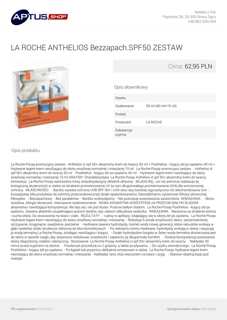 Apteka z Gór Papieska 39, 33-300 Nowy Sącz +48 882 004 443 LA ROCHE ANTHELIOS Bezzapach.SPF50 ZESTAW Cena: 62,95 PLN Opis słownikowy Dawka - Opakowanie 50 ml (40 ml+15 ml) Postać - Producent LA ROCHE Substancja czynna - Opis produktu La Roche-Posay promocyjny zestaw - Anthelios xl spf 50+ aksamitny krem do twarzy 50 ml + Posthelios - kojący żel po opalaniu 40 ml + Hydreane legere krem nawilżający do skóry wrażliwej normalnej i mieszanej 15 ml La Roche-Posay promocyjny zestaw: - Anthelios xl spf 50+ aksamitny krem do twarzy 50 ml - Posthelios - kojący żel po opalaniu 40 ml - Hydreane legere krem nawilżający do skóry wrażliwej normalnej i mieszanej 15 ml GRATIS!!! Charakterystyka La Roche-Posay Anthelios xl spf 50+ aksamitny krem do twarzy Innowacja: La-Roche Posay wprowadza nowy antyoksydacyjny składnik aktywny - BAJKALINĘ, i po raz pierwszy wykazuje jej biologiczną skuteczność w walce ze skutkami promieniowania UV (w tym długotrwałego promieniowania UVA) dla wzmocnionej ochrony. WŁAŚCIWOŚCI: - Bardzo wysoka ochrona UVB SPF 50+ i UVA dwa razy bardziej rygorystyczna niż rekomendowana Unii Europejskiej (dla produktów do ochrony przeciwsłonecznej) dzięki opatentowanemu, fotostabilnemu systemowi filtracji słonecznej Mexoplex. - Bezzapachowy - Bez parabenów - Bardzo wodoodporny - Nie powoduje powstawania zaskórników WSKAZANIA: - Skóra wrażliwa. Alergie słoneczne. Intensywne nasłonecznienie. NOWA AKSAMITNA KONSYSTENCJA PRZECIW BIAŁYM ŚLADOM aksamitna i nawilżająca konsystencja. Nie lepi się i nie jest tłusta. Przeciw białym śladom. La Roche-Posay Posthelios - kojący żel po opalaniu Zawiera składniki uzupełniające poziom lipidów, aby ułatwić odbudowę naskórka. WSKAZANIA: Narażona na działanie słońca i sucha skóra. Do stosowania na twarz i ciało. REZULTATY: - Łatwy w aplikacji, wtapiający się w skórę żel po opalaniu. La Roche-Posay Hydreane legere krem nawilżający do skóry wrażliwej normalnej i mieszanej - Redukuje 5 oznak wrażliwości skóry: zaczerwienienie, szczypanie, ściągnięcie, swędzenie, pieczenie. - Hydreane zawiera hydrolipidy, nośniki wody nowej generacji, które naturalnie wnikaja w głąb naskórka dzięki strukturze zblizonej do błon komórkowych. - Po nałożeniu kremu Hydreane, hydrolipidy wnikają w skórę i nasycają ja wodą termalną La Roche-Posay, działając nawilżająco i kojąco. - Dzięki hydrolipidom bogata w Selen woda termalna dostarczana jest do skóry w sposób ciagły, aby stopniowo redukowac wrazliwość i zapewnic jej długotrwały komfort. - Świeża konsystencja pozostawia skórę złagodzoną, miękka i elastyczną. Stosowanie La Roche-Posay Anthelios xl spf 50+ aksamitny krem do twarzy - Nakładać 30 minut przed wyjściem na słońce. - Powtarzać procedurę co 2 godziny, a także po pływaniu. - Do użytku zewnętrznego. La Roche-Posay Posthelios - kojący żel po opalaniu - Po kąpieli lub prysznicu delikatnie wmasować w skórę. La Roche-Posay Hydreane legere krem nawilżający do skóry wrażliwej normalnej i mieszanej - Nakładać rano i/lub wieczorem na twarz i szyję. - Stanowi idealną bazę pod makijaż Plik wygenerowano: 04-03-2017 Powered by TCPDF (www.tcpdf.org) Oprogramowanie sklepu: AptusShop