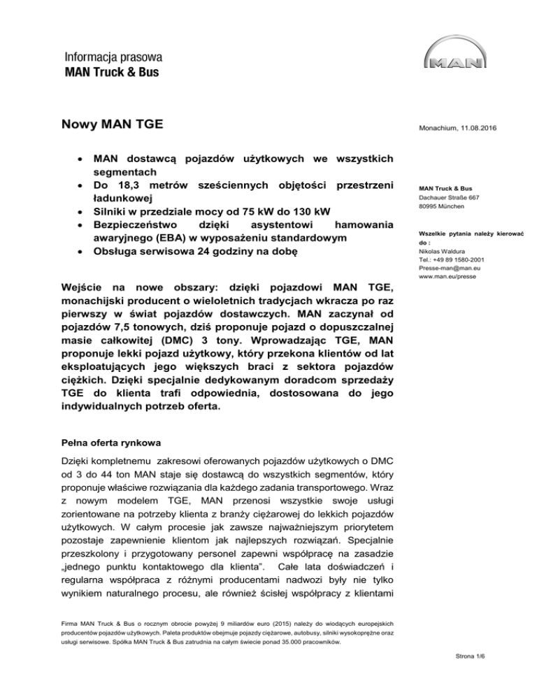 Nowy MAN TGE • • • • • MAN dostawcą pojazdów użytkowych we wszystkich segmentach Do 18,3 metrów sześciennych objętości przestrzeni ładunkowej Silniki w przedziale mocy od 75 kW do 130 kW Bezpieczeństwo dzięki asystentowi hamowania awaryjnego (EBA) w wyposażeniu standardowym Obsługa serwisowa 24 godziny na dobę Monachium, 11.08.2016 MAN Truck & Bus Dachauer Straße 667 80995 München Wszelkie pytania należy kierować do : Nikolas Waldura Tel.: +49 89 1580-2001 [email protected] www.man.eu/presse Wejście na nowe obszary: dzięki pojazdowi MAN TGE, monachijski producent o wieloletnich tradycjach wkracza po raz pierwszy w świat pojazdów dostawczych. MAN zaczynał od pojazdów 7,5 tonowych, dziś proponuje pojazd o dopuszczalnej masie całkowitej (DMC) 3 tony. Wprowadzając TGE, MAN proponuje lekki pojazd użytkowy, który przekona klientów od lat eksploatujących jego większych braci z sektora pojazdów ciężkich. Dzięki specjalnie dedykowanym doradcom sprzedaży TGE do klienta trafi odpowiednia, dostosowana do jego indywidualnych potrzeb oferta. Pełna oferta rynkowa Dzięki kompletnemu zakresowi oferowanych pojazdów użytkowych o DMC od 3 do 44 ton MAN staje się dostawcą do wszystkich segmentów, który proponuje właściwe rozwiązania dla każdego zadania transportowego. Wraz z nowym modelem TGE, MAN przenosi wszystkie swoje usługi zorientowane na potrzeby klienta z branży ciężarowej do lekkich pojazdów użytkowych. W całym procesie jak zawsze najważniejszym priorytetem pozostaje zapewnienie klientom jak najlepszych rozwiązań. Specjalnie przeszkolony i przygotowany personel zapewni współpracę na zasadzie „jednego punktu kontaktowego dla klienta”. Całe lata doświadczeń i regularna współpraca z różnymi producentami nadwozi były nie tylko wynikiem naturalnego procesu, ale również ścisłej współpracy z klientami Firma MAN Truck & Bus o rocznym obrocie powyżej 9 miliardów euro (2015) należy do wiodących europejskich producentów pojazdów użytkowych. Paleta produktów obejmuje pojazdy ciężarowe, autobusy, silniki wysokoprężne oraz usługi serwisowe. Spółka MAN Truck & Bus zatrudnia na całym świecie ponad 35.000 pracowników. Strona 1/6 flotowymi. Ta wspólna praca zespołowa z klientami, producentami nadwozi oraz działami sprzedaży i serwisu doprowadziła do stworzenia pojazdu gwarantującego najwyższą wartość użytkową w całym okresie eksploatacji. MAN kieruje swój nowy produkt głównie do klientów z sektora logistyki i branży budowlanej, lecz ten lekki „pojazd ciężarowy” może być również przeznaczony do zastosowań specjalistycznych od szeroko rozumianego rzemiosła do przewozów pasażerskich. Wszyscy użytkownicy docenią najniższą wartość współczynnika oporu powietrza cW (0,33), najniższe w tej klasie zużycie paliwa oraz niskie koszty napraw i serwisu. Nowy MAN TGE imponuje również najlepszym współczynnikiem TCO (z ang. całkowitych kosztów użytkowania/podsiadania pojazdu). Mnóstwo miejsca i wysoka ładowność Wśród proponowanych typów nadwozi, oprócz klasycznych nadwozi zamkniętych i przeszklonych furgonów, proponuje się również podwozia w wersji z pojedynczą i podwójną kabiną. Te ostatnie można oczywiście zamówić z zabudowami fabrycznymi w najróżniejszych odmianach. Nowy MAN TGE występuje w wariantach z dwoma rozstawami osi, trzema wysokościami dachu i trzema długościami nadwozia. W przypadku nadwozi typu van/furgon zakres długości zaczyna się od 5.983 mm przez 6.833 mm, a nawet do 7.388 mm, dla MAN TGE z długim zwisem. Warianty wysokości pojazdu to: 2.340 mm, 2.575 mm oraz 2.800 mm. Odpowiednia kombinacja długości i wysokości daje maksymalną objętość przestrzeni ładunkowej na poziomie 18,3 metrów sześciennych. W standardowym wyposażeniu znajduje się jasne oświetlenie LED wnętrza przestrzeni ładunkowej. Wariant MAN TGE o najmniejszej dopuszczalnej masie całkowitej to 3 tony, a maksymalna DMC to 5,5 tony. Dodatkowe aż 3,5t można uzyskać po dołączeniu przyczepy. Pojazd o DMC do 3,5t ma niespotykaną maksymalną ładowność - w idealnym układzie może przewozić do 1,5 tony ładunku. Wszechstronność i wydajność układów napędowych Równie kompleksowy jest zakres dostępnych układów napędowych. W zależności od dopuszczalnej masy całkowitej klienci mogą zdecydować się na napęd przedni, napęd tylny lub napęd na wszystkie koła. Każdy wariant występuje albo z 6-biegową skrzynią manualną albo z 8-biegową skrzynią automatyczną. Wraz z MAN TGE narodziła się nowa generacja silników Diesla. Silniki zadebiutowały rok temu w znanym już na całym świecie i cieszącym się powodzeniem modelu Volkswagen Transporter. Teraz zostały użyte po raz kolejny jako symbol długiej eksploatacji i niezawodności. Oprócz tego, silnik czterocylindrowy opracowano ze szczególnym uwzględnieniem Strona 2/6 „ciężkich” wymagań eksploatacyjnych pojazdu użytkowego. Najbardziej liczą się ekonomiczność i wytrzymałość - dwie cechy, które w MAN TGE sprzęgają się w prawdziwą zaletę oraz obietnicę nowych ekonomicznie i ekologicznie najlepszych wskaźników. Gama silników o pojemności 1.968 cm3 obejmuje warianty o mocy 75 kW/102 KM, 90 kW/122 KM, 103 kW/140 KM oraz 130 kW/177 KM. Wygoda i codzienna użyteczność wewnątrz Typową w pojeździe użytkowym przestrzeń roboczą za kierownicą przekształcono w TGE w prawdziwą przestrzeń życiową. Wiele dobrze przemyślanych schowków i półek wspomaga kierowcę w realizacji codziennych zadań. Siedzenia kierowcy, dostępne w czterech różnych wersjach, są idealnie wyprofilowane gwarantując optymalny poziom komfortu przy długich trasach i spełniając oczekiwania wszystkich użytkowników. Odporna na ścieranie tapicerka, która sprawdziła się już w pojazdach ciężarowych, to dodatkowa gwarancja długiej eksploatacji. Najwyższe bezpieczeństwo dzięk
