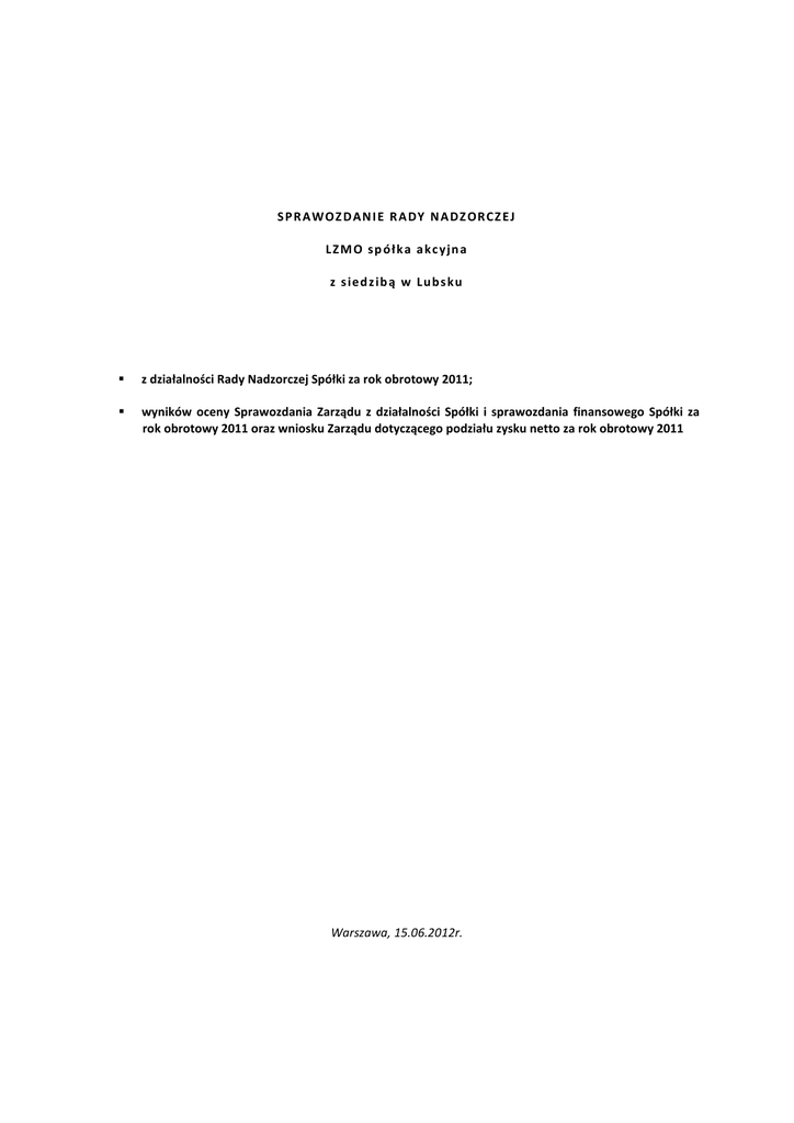 SP R AW OZ D AN I E R A DY N A DZ OR CZ E J LZ M O sp ó łk a a kc yjn a z s ied z ib ą w Lu b s ku z działalności Rady Nadzorczej Spółki za rok obrotowy 2011; wyników oceny Sprawozdania Zarządu z działalności Spółki i sprawozdania finansowego Spółki za rok obrotowy 2011 oraz wniosku Zarządu dotyczącego podziału zysku netto za rok obrotowy 2011 Warszawa, 15.06.2012r. I. SPRAWOZDANIE RADY NADZORCZEJ Z DZIAŁALNOŚCI W 2011 ROKU Rada Nadzorcza działa na podstawie przepisów Kodeksu spółek handlowych oraz Statutu Spółki, jak również Regulaminu Rady Nadzorczej, określającego tryb jej działania. 1. SKŁAD RADY NADZORCZEJ Rada Nadzorcza została powołana w akcie przekształcenia spółki z ograniczoną odpowiedzialnością Lubuskie Zakłady Materiałów Ogniotrwałych w spółkę akcyjną LZMO S.A., aktem notarialnym z dnia 18 października 2010 r. (Repertorium A nr 18281/2010). Członkowie Rady Nadzorczej zostali powołani indywidualną kadencję, która trwa trzy lata. W trakcie roku Rada Nadzorcza działała w pięcioosobowym składzie , a zatem spełnione było statutowe minimum liczebności tego organu, umożliwiające Radzie Nadzorczej wykonywanie jej funkcji. W trakcie roku objętego sprawozdaniem nastąpiły zmiany w składzie Rady Nadzorczej. W dniu 23 maja 2011 roku Zwyczajne Walne Zgromadzenie odwołało ze składu Rady Nadzorczej Pana Władysława Sędzielskiego i powołało Pana Piotra Woźniaka. Na koniec okresu sprawozdawczego skład Rady Nadzorczej przedstawiał się następująco: 1. Dariusz Janus 2. Piotr Woźniak 3. Małgorzata Sławińska 4. Jerzy Bartosiewicz 5. Andrzej Krakówka Funkcję Przewodniczącego Rady Nadzorczej pełnił w całym okresie Pan Dariusz Janus. 17 stycznia 2012 roku Nadzwyczajne Walne Zgromadzenie odwołało ze składu Rady Nadzorczej Pana Andrzeja Krakówkę i powołało Pana Marcina Kłopocińskiego. 2. FORMA I TRYB WYKONYWANIA NADZORU Rada Nadzorcza, zgodnie z postanowieniami Kodeksu spółek handlowych, Statutu Spółki i Regulaminu Rady, w 2011 r. sprawowała stały nadzór nad działalnością Spółki we wszystkich obszarach jej funkcjonowania oraz wykonywała kontrolę finansową działalności Spółki pod kątem celowości i racjonalności. Główną formą wykonywania przez Radę Nadzorczą swoich funkcji były posiedzenia Rady. Oprócz Członków Rady w posiedzeniach, na zaproszenie, uczestniczyli Członkowie Zarządu. Członkowie Rady Nadzorczej pozostawali w stałym kontakcie z Zarządem Spółki i aktywnie uczestniczyli we wszystkich, istotnych dla działalności Spółki, sprawach. Pozwoliło to Radzie Nadzorczej systematycznie obserwować i kontrolować działania Zarządu i przedsiębiorstwa Spółki. Wszystkie posiedzenia odbywały się w składzie i trybie umożliwiającym podejmowanie uchwał. Na każdym posiedzeniu Rady Nadzorczej Zarząd przedstawiał wyczerpujące informacje o wszystkich istotnych sprawach dotyczących działalności Spółki, objętych porządkiem obrad. 3. ZAKRES PRAC RADY NADZORCZEJ W OKRESIE SPRAWOZDAWCZYM Od chwili powołania Rada Nadzorcza odbyła siedem posiedzeń, na których podjęła uchwały dotyczące spraw korporacyjnych Spółki, m.in. wyboru biegłego rewidenta, wyrażenia zgody na zbycie nieruchomości Spółki, wyrażenia zgody na objęcie akcji w spółce SOL VENTRUES S.A. i wniesienia aportem nieruchomości Spółki, stanowiące złoża iłów. Rada Nadzorcza stwierdza, że współpraca z Zarządem układała sie prawidłowo. Zarząd w sposób terminowy i wyczerpujący udzielał Radzie wszelkich informacji i wyjaśnień, o jakie się ona zwracała. Dodatkowo Zarząd zapewnił środki techniczne i organizacyjne zapewniające Radzie Nadzorczej prawidłowe wykonywanie jej zadań, terminowo wywiązywał sie z obowiązków sprawozdawczych, a przedkładane informacje były sporządzane w sposób rzetelny i kompletny. II. 1. SPRAWOZDANIE RADY NADZORCZEJ Z WYNIKÓW OCENY SPRAWOZDANIA ZARZĄDU Z DZIAŁALNOŚCI SPÓŁKI I SPRAWOZDANIA FINANSOWEGO SPÓŁKI ZA ROK OBROTOWY 2011 ORAZ WNIOSKU ZARZĄDU DOTYCZĄCEGO PODZIAŁU ZYSKU NETTO ZA ROK OBROTOWY 2011 WSTĘP Rada Nadzorcza dokonała oceny Sprawozdania Zarządu z działalności Spółki i sprawozdania finansowego Spółki za rok obrotowy 2011 w zakresie ich zgodności z księgami i dokumentami jak i ze stanem faktycznym oraz wniosku Zarządu dotyczącego podziału zysku netto za rok obrotowy 2011 i przedkłada Zwyczajnemu Walnemu Zgromadzeniu pisemne sprawozdanie z wyników oceny ww. sprawozdań i wniosku Zarządu. Podstawę opracowania stanowią: 1. Sprawozdanie Zarządu z działalności Spółki za rok obrotowy 2011; 2. Sprawozdanie finansowe Spółki za rok obrotowy 2011, 3. Opinia bez zastrzeżeń biegłego rewidenta – Danuta Szczepańska Biuro Rachunkowe Agencja Ekonomiczna „KONTO” wraz z raportem uzupełniającym opinię; 4. Wniosek Zarządu dotyczący podziału zysku netto za rok obrotowy 2011; 2. SPRAWOZDANIE RADY NADZORCZEJ Z OCENY SPRAWOZDANIA ZARZĄDU Z DZIAŁALNOŚCI SPÓŁKI W 2011 ROKU Rada Nadzorcza, zapoznała się z treścią sprawozdania Zarządu z działalności Spółki za rok 2011 i dokonała jego oceny. Rada Nadzorcza stwierdza, że informacje zawarte w tym sprawozdaniu są kompletne i zgodne z informacjami zawartymi w sprawozdaniu finansowym, jak i ze stanem faktycznym. Sprawozdanie w pełni i rzetelnie przedstawia sytuację Spółki, prezentuje wszystkie ważne zdarzenia dla działalności Spółki. Ponadto, Rada Nadzorcza pozytywnie ocenia pracę Zarządu Spółki w 2011 r. 3. SPRAWOZDANIE RADY NADZORCZEJ Z OCENY SPRAWOZDANIA FINANSOWEGO SPÓŁKI OBROTOWY 2011 ZA ROK Rada Nadzorcza zapoznała się i dokonała oceny sprawozdania finansowego za rok obrotowy 2011. Wybrany przez Radę Nadzorczą audytor - Danuta Szczepańska Biuro Rachunkowe Agencja Ekonomiczna „KONTO” w Warszawie - zbadał sporządzone sprawozdanie finansowe Spółki. Zdaniem audytora zbadane sprawozdanie finansowe Spółki: -
