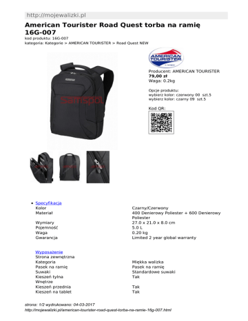 http://mojewalizki.pl American Tourister Road Quest torba na ramię 16G-007 kod produktu: 16G-007 kategoria: Kategorie > AMERICAN TOURISTER > Road Quest NEW Producent: AMERICAN TOURISTER 79,00 zł Waga: 0.2kg Opcje produktu: wybierz kolor: czerwony 00 szt.5 wybierz kolor: czarny 09 szt.5 Kod QR: Specyfikacja Kolor Materiał Wymiary Pojemność Waga Gwarancja Wyposażenie Strona zewnętrzna Kategoria Pasek na ramię Suwaki Kieszeń tylna Wnętrze Kieszeń przednia Kieszeń na tablet Czarny/Czerwony 400 Denierowy Poliester + 600 Denierowy Poliester 27.0 x 21.0 x 8.0 cm 5.0 L 0.20 kg Limited 2 year global warranty Miękka walizka Pasek na ramię Standardowe suwaki Tak Tak Tak strona: 1/2 wydrukowano: 04-03-2017 http://mojewalizki.pl/american-tourister-road-quest-torba-na-ramie-16g-007.html strona: 2/2 wydrukowano: 04-03-2017 http://mojewalizki.pl/american-tourister-road-quest-torba-na-ramie-16g-007.html