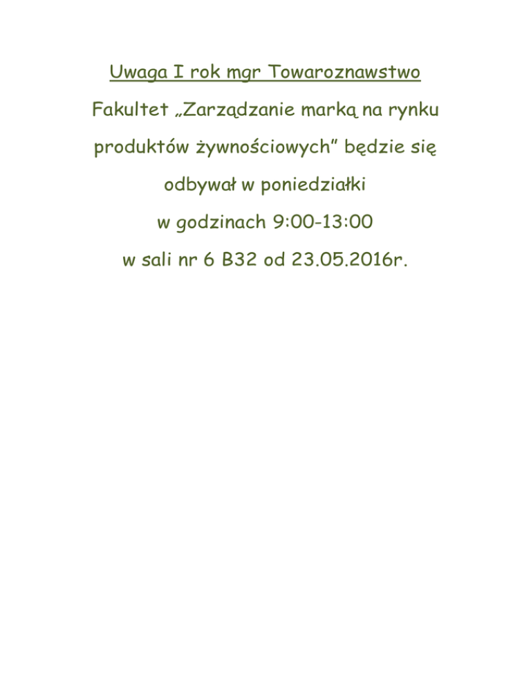 Uwaga I rok mgr Towaroznawstwo Fakultet „Zarządzanie marką na rynku produktów żywnościowych” będzie się odbywał w poniedziałki w godzinach 9:00-13:00 w sali nr 6 B32 od 23.05.2016r.