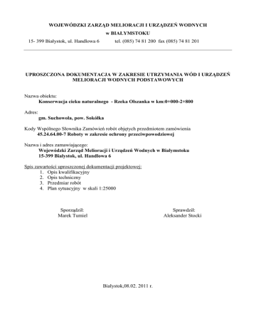 WOJEWÓDZKI ZARZĄD MELIORACJI I URZĄDZEŃ WODNYCH w BIAŁYMSTOKU 15- 399 Białystok, ul. Handlowa 6 tel. (085) 74 81 200 fax (085) 74 81 201 UPROSZCZONA DOKUMENTACJA W ZAKRESIE UTRZYMANIA WÓD I URZĄDZEŃ MELIORACJI WODNYCH PODSTAWOWYCH Nazwa obiektu: Konserwacja cieku naturalnego - Rzeka Olszanka w km:0+000-2+800 Adres: gm. Suchowola, pow. Sokółka Kody Wspólnego Słownika Zamówień robót objętych przedmiotem zamówienia 45.24.64.00-7 Roboty w zakresie ochrony przeciwpowodziowej Nazwa i adres zamawiającego: Wojewódzki Zarząd Melioracji i Urządzeń Wodnych w Białymstoku 15-399 Białystok, ul. Handlowa 6 Spis zawartości uproszczonej dokumentacji projektowej: 1. Opis kwalifikacyjny 2. Opis techniczny 3. Przedmiar robót 4. Plan sytuacyjny w skali 1:25000 Sporządził: Marek Tumiel Sprawdził: Aleksander Stocki Białystok,08.02. 2011 r. OPIS KWALIFIKACYJNY Konserwacja cieku naturalnego – Rzeka Olszanka w km:0+000-2+800 Gmina: Suchowola Powiat: Sokółka Długość całkowita – 2800m Do konserwacji – 2800 m w tym konserwacja: na odcinku uregulowanym bieżąca gruntowna na odcinku nieuregulowanym bieżąca gruntowna km 2,8, w tym od: do: 0+000 2+800 .......-........ .......-.......... km ....-....., w tym od: do: ........-........ .........-........ ........-........ .........-........ km ....-...., w tym od: .......-........ .......-........ km .....-...., w tym od: .......-......... .......-......... do: ........-........ ........-......... do: .........-........ .........-........ Zakres robót: Lp. 1 2 3 4 5 6 7 8 9 10 11 12 13 14 Wyszczególnienie Ręczne usunięcie namułu Mechaniczne usunięcie namułu (koparko-odmularka) Mechaniczne usunięcie namułu Uzupełnienie ubezpieczenia Naprawa budowli Wykoszenie porostu z dna cieku Wykoszenie porostów ze skarp i poboczy Usuwanie kożucha roślin pływających Hakowanie roślin pływających Wycinanie krzaków Wycinanie drzew Oczyszczenie przepustów z namułu Eksploatacja budowli piętrzących Zagospodarowanie plantunku metodą podsiewu Jedn. miary mb mb m3 mb szt. 100m2 100m2 100m2 100m2 ar. szt. szt. szt. ha Termin wykonania robót: 31.10.2011r. Opracował: Marek Tumiel Zatwierdził Kierownik OT: Ryszard Kruszewski Ilość jedn. 70 68 1 - OPIS TECHNICZNY do uproszczonej dokumentacji na wykonanie robót związanych z utrzymaniem wód i urządzeń melioracji wodnych podstawowych na obiekcie „Konserwacja cieku naturalnego – Rzeka Olszanka ” w km:0+000-2+800 I. WIADOMOŚCI WSTĘPNE Niniejsza dokumentacja została opracowana przez pracowników WZMiUW w Białymstoku w oparciu o: 1. Podkłady mapowe w skali 1:25000 2. Jesienne przeglądy śródlądowych wód powierzchniowych oraz cieków pozostałych na terenie Gminy Suchowola II. POŁOŻENIE OBIEKTU Obiekt przewidziany do konserwacji położony jest na terenie Gminy Suchowola. Ujście cieku do rzeki Brzozówka znajduje się w m. Suchowola. Trasa cieku przebiega przez miejscowości: Suchowola. Dojazd do cieku (miejsca robót) drogami ogólnodostępnymi. Ciek naturalny przepływa przez użytki zielone i łąki kośne rolników ze wsi Suchowola. Większość użytków jest utrzymana w dobrej kulturze rolnej. III. STAN ISTNIEJĄCY Ciek naturalny rzeka Olszanka wpada do rzeki Brzozówka. Ciek na długości 2,8km przepływa przez użytki zielone m. Suchowola. Do cieku ma wpływ wiele rowów melioracyjnych odwadniających zdrenowane grunty orne, i użytki zielone. Największy z nich o dł. 0,92 km znajduje się w m. Suchowola i odwadnia użytki zielone m. Suchowola. W 2010 roku na odcinku w km 0+000-2+800 wykonano konserwację bieżącą. Obecnie ciek na całej długości jest mocno zarośnięty, występuje znaczne zamulenie i zanieczyszczenie. Taki stan znacznie utrudnia przepływ wody , co może prowadzić do podtopień gruntów rolnych. IV. ROZWIĄZANIE PROJEKTU Zakres przewidywanych robót oznaczono na mapie sytuacyjnej. W pierwszej kolejności wykonać eksploatację budowli piętrzącej szt.1, następnie należy wykonać wykoszenie roślinności ze skarp i poboczy w km: 0+000-1+300 i 2+400-2+800 oraz wykoszenie roślinności z dna cieku w km:0+0002+800 km . Wszystkie roboty należy wykonać zgodnie z dokumentacją techniczną oraz wg obowiązujących norm. V. KONTROLA JAKOŚCI ROBÓT Kontrola jakości robót będzie prowadzona na bieżąco przez kierownika budowy oraz wyznaczonego pracownika inwestora i powinna być potwierdzona odpowiednim wpisem do dziennika budowy, przekazanego przez inwestora w formie uproszczonej (dla robót nie wymagających pozwolenia na budowę). VI. TERMIN REALIZACJI Lp. 1 VII. Rodzaj robót i ich szczegółowa lokalizacja KONSERWACJA CIEKU NATURALNEGO – Rzeka Olszanka Konserwacja bieżąca - (ureg.) w km :0+000-2+800, w tym: - wykoszenie porostów ze skarp i poboczy - wykoszenie porostów z dna cieku - eksploatacja budowli piętrzących ODBIÓR ROBÓT Rozmiar rzeczowy 68,0/100 m2 70,0/100 m2 1 szt. Termin Rozpoczęcie Zakończenie 15.06.2011 15.06.2011 01.05.2011 31.10.2011 31.10.2011 30.09.2011 Odbiór robót przeprowadza Inwestor na wniosek Wykonawcy w obecności zainteresowanych stron i sporządza protokół odbioru końcowego. Sporządził: Marek Tumiel PRZEDMIAR ROBÓT Na wykonanie konserwacji bieżącej, gruntowej i eksploatacji na obiekcie jak niżej: DANE OGÓLNE 1. Obiekt / rzeka, ciek, budowle itp. /Rzeka Olszanka 2. Gmina Suchowola Powiat sokólski 3. Km:0+000-2+800 4. Budowle piętrzące w km j.n. Lp. Podstawa wyceny 1 2 1. KNNR 10 2508 Kalkulacja indywidual na II. Rodzaj robót Lokalizacja Jednostka miary Ilość jednostek Uwagi 3 4 5 6 7 Konserwacja bieżąca 1.Ręczne wykoszenie skarp z roślinności pasem śr.2x2,0 m,pgm.50%,pgt.50% 0+000-1+300 2+400-2+800 100 m2 68,00 0+000-2+800 100 m2 70,00 0+000-2+800 r-g 35,00 2+200 r-g m-g 50,00 4,00 2.Ręczne wykoszenie dna z roślinności pg szer.dna 2,50m bez wygrabienia 3.Usunięcie powstałych przetamowań z wykoszonej roślinności Eksploatacja budowli piętrzących Oczyszczenie bu
