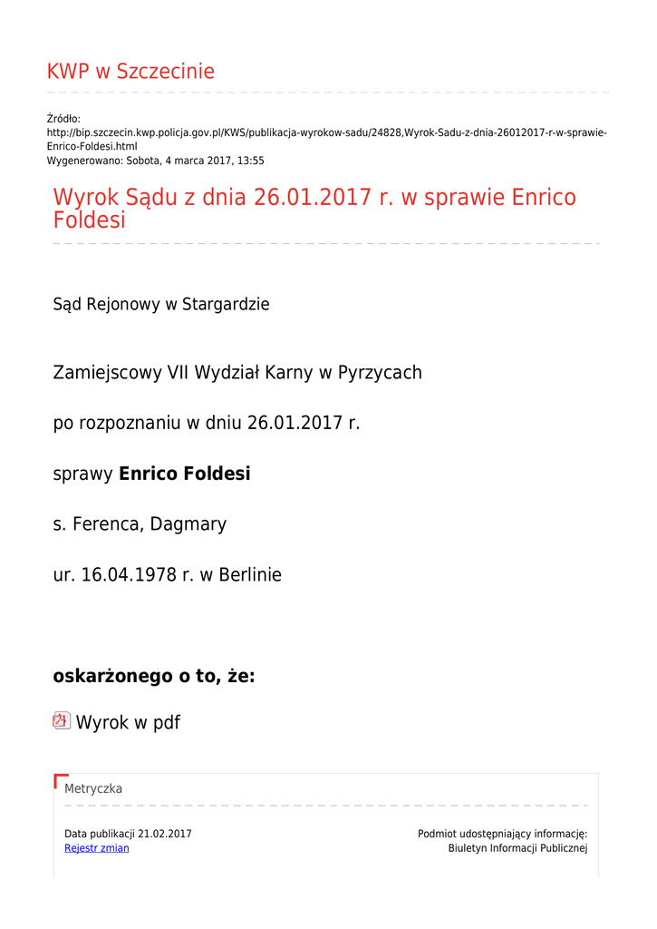 KWP w Szczecinie Źródło: http://bip.szczecin.kwp.policja.gov.pl/KWS/publikacja-wyrokow-sadu/24828,Wyrok-Sadu-z-dnia-26012017-r-w-sprawieEnrico-Foldesi.html Wygenerowano: Sobota, 4 marca 2017, 13:55 Wyrok Sądu z dnia 26.01.2017 r. w sprawie Enrico Foldesi Sąd Rejonowy w Stargardzie Zamiejscowy VII Wydział Karny w Pyrzycach po rozpoznaniu w dniu 26.01.2017 r. sprawy Enrico Foldesi s. Ferenca, Dagmary ur. 16.04.1978 r. w Berlinie oskarżonego o to, że: Wyrok w pdf Metryczka Data publikacji 21.02.2017 Rejestr zmian Podmiot udostępniający informację: Biuletyn Informacji Publicznej Osoba wytwarzająca/odpowiadająca za informację: Sąd Rejonowy w Stargardzie Osoba udostępniająca informację: nadkom. Krzysztof Chełstowski Osoba modyfikująca informację: