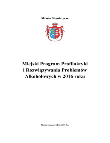 Miasto Siemiatycze Miejski Program Profilaktyki i Rozwiązywania Problemów Alkoholowych w 2016 roku Siemiatycze, grudzień 2015 r. Wstęp I Diagnoza sytuacji. II Cele programu. III Zadania i podmioty realizujące program. IV Adresaci programu. V Zasady finansowania. VI Monitoring i realizacja programu. WSTĘP Spośród licznych problemów społecznych, jakie występują w naszym kraju, problemy związane z alkoholem mają szczególne znaczenie. Wynika to przede wszystkim z rozmiarów szkód alkoholowych oraz kosztów społecznych i ekonomicznych. Szkody powodowane przez alkoholizm, ryzykowne lub szkodliwe spożywanie alkoholu występują w trzech wymiarach: - jednostkowym (oddziałują bezpośrednio na zdrowie psychiczne i fizyczne osoby pijącej) - społecznym (negatywne oddziaływanie na zdrowie psychiczne oraz fizyczne członków rodzin, przemoc w rodzinie, przestępczość, wypadki samochodowe, zakłócenia bezpieczeństwa publicznego, bezrobocie, ubóstwo itp.) - ekonomicznym (koszty: leczenia, wypadków drogowych, systemu pomocy społecznej i ubezpieczeń, lecznictwa odwykowego, zaangażowania wymiaru sprawiedliwości, spadek wydajności pracy, przedwczesnej umieralności itp.) Podstawę prawną do rozwiązywania problemów alkoholowych stanowi ustawa z dnia 26 października 1982 r. o wychowaniu w trzeźwości i przeciwdziałaniu alkoholizmowi (Dz. U. z 2015 r. poz. 1286 z późn. zm.). Zgodnie z art. 41. 1. prowadzenie działań związanych z profilaktyką i rozwiązywaniem problemów alkoholowych oraz integracji społecznej osób uzależnionych od alkoholu należy do zadań własnych gmin. W szczególności zadania te obejmują: - zwiększanie dostępności pomocy terapeutycznej i rehabilitacyjnej dla osób uzależnionych od alkoholu; - udzielanie rodzinom, w których występują problemy alkoholowe, pomocy psychospołecznej i prawnej, a w szczególności ochrony przed przemocą w rodzinie; - prowadzenie profilaktycznej działalności informacyjnej i edukacyjnej w zakresie rozwiązywania problemów alkoholowych i przeciwdziałania narkomanii, w szczególności dla dzieci i młodzieży, w tym prowadzenie pozalekcyjnych zajęć sportowych, a także działań na 1 rzecz dożywiania dzieci uczestniczących w pozalekcyjnych programach opiekuńczowychowawczych i socjoterapeutycznych; - wspomaganie działalności instytucji, stowarzyszeń i osób fizycznych, służącej rozwiązywaniu problemów alkoholowych; - podejmowanie interwencji w związku z naruszeniem przepisów określonych w art. 131 i 15 ustawy oraz występowanie przed sądem w charakterze oskarżyciela publicznego; - wspieranie zatrudnienia socjalnego poprzez organizowanie i finansowanie centrów integracji społecznej. Przy opracowywaniu powyższego Programu uwzględniono zasoby, jakimi dysponuje miasto do realizacji omówionych poniżej zadań jak i zwrócono szczególną uwagę na zaspokojenie istotnych w tym zakresie potrzeb. Zasoby instytucjonalne miasta Siemiatycze. Realizatorzy programu: 1) pełnomocnik ds. profilaktyki i przeciwdziałania uzależnieniom mający swoją siedzibę w Punkcie konsultacyjno – terapeutycznym ds. uzależnień w Siemiatyczach, powołany zgodnie z art. 41 ust. 2 ustawy z dnia 26 października 1982 r. o wychowaniu w trzeźwości i przeciwdziałaniu alkoholizmowi. W Polsce działa ponad 2000 punktów konsultacyjnych (źródło: Rekomendacje PARPA 2015) które udzielają pomocy osobom uzależnionym i członkom rodzin z problemem uzależnień. Podstawowe zadania punktu konsultacyjnego: - motywowanie zarówno osób uzależnionych, jak i członków ich rodzin do podjęcia psychoterapii w placówkach leczenia uzależnienia oraz kierowanie na leczenie specjalistyczne, - motywowanie osób pijących ryzykownie i szkodliwie, ale nieuzależnionych, do zmiany szkodliwego wzoru picia, - udzielanie wsparcia osobom po zakończonym leczeniu odwykowym (np. poprzez rozmowy podtrzymujące), - rozpoznanie zjawiska przemocy domowej, udzielenie stosownego wsparcia i informacji o możliwościach uzyskania pomocy i powstrzymania przemocy, - inicjowanie interwencji w przypadku diagnozy przemocy domowej, - gromadzenie aktualnych informacji na temat dostępnych miejsc pomocy i kompetencji poszczególnych służb i instytucji działających na terenie miasta. W roku 2015 z porad, konsultacji oraz informacji udzielanych w Punkcie konsultacyjno – terapeutycznym w Siemiatyczach skorzystało 130 osób. W powyższym punkcie zatrudniony jest również certyfikowany specjalista terapii uzależnień prowadzący terapię indywidualną dla osób uzależnionych lub eksperymentujących (niepełnoletni nadużywający alkoholu, narkomani, hazardziści, uzależnieni od komputera, telefonu komórkowego, internetu, sprawcy przemocy) oraz terapię rodzinną. W 2015 r. 193 2 osoby odbyły wizyty terapeutyczne. Ponadto terapeuta oraz pełnomocnik odbywają liczne spotkania z młodzieżą oraz rodzicami podczas wywiadówek w szkołach. 2) członkowie w Siemiatyczach Miejskiej Komisji Rozwiązywania Problemów Alkoholowych Miejska Komisja Rozwiązywania Problemów Alkoholowych w Siemiatyczach została powołana Zarządzeniem 97/11 Burmistrza Miasta Siemiatycze z dnia 2 sierpnia 2011 r. Powołanie Komisji wynika z art. 4¹ ust.3 ustawy z dnia 26 października 1982 r. o wychowaniu w trzeźwości i przeciwdziałaniu alkoholizmowi. Zgodnie z art. 4¹ ust. 4 wspomnianej ustawy w skład Miejskiej Komisji Rozwiązywania Problemów Alkoholowych wchodzą osoby przeszkolone w zakresie profilaktyki i rozwiązywania problemów alkoholowych. Komisja ma swoją siedzibę przy ul. Legionów Piłsudskiego 1 i zbiera się na swoich posiedzeniach dwa razy w miesiącu w zależności od potrzeb. Zadania Komisji: - inicjowanie przedsięwzięć w zakresie profilaktyki i rozwiązywania problemów alkoholowych, - pomoc rodzinom osób uzależnionych od alkoholu (informowanie o możliwościach pomocy prawnopsychospołecznej, chorobie alkoholowej i sposobach jej le