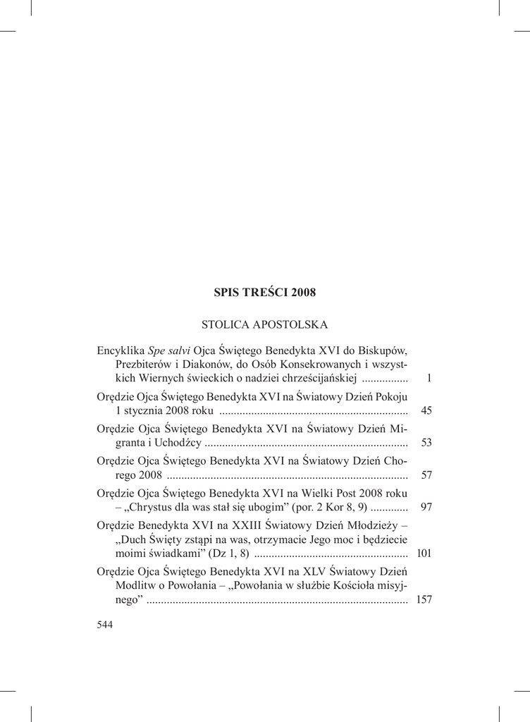 Spis treści 2008 STOLICA APOSTOLSKA Encyklika Spe salvi Ojca Świętego Benedykta XVI do Biskupów, Prezbiterów i Diakonów, do Osób Konsekrowanych i wszystkich Wiernych świeckich o nadziei chrześcijańskiej ................. 1 Orędzie Ojca Świętego Benedykta XVI na Światowy Dzień Pokoju 1 stycznia 2008 roku .................................................................. 45 Orędzie Ojca Świętego Benedykta XVI na Światowy Dzień Migranta i Uchodźcy ...................................................................... 53 Orędzie Ojca Świętego Benedykta XVI na Światowy Dzień Chorego 2008 .................................................................................... 57 Orędzie Ojca Świętego Benedykta XVI na Wielki Post 2008 roku – „Chrystus dla was stał się ubogim” (por. 2 Kor 8, 9) . ............ 97 Orędzie Benedykta XVI na XXIII Światowy Dzień Młodzieży – „Duch Święty zstąpi na was, otrzymacie Jego moc i będziecie moimi świadkami” (Dz 1, 8) ...................................................... 101 Orędzie Ojca Świętego Benedykta XVI na XLV Światowy Dzień Modlitw o Powołania – „Powołania w służbie Kościoła misyjnego” . ......................................................................................... 157 544 Orędzie Wielkanocne „Urbi et Orbi” Ojca Świętego Benedykta XVI (23 III 2008 r.) – „Otwórzmy się z ufnością na Chrystusa zmartwychwstałego” .......................................................................... 124 Orędzie Ojca Świętego Benedykta XVI na Światowy Dzień Środków Społecznego Przekazu – „Szukanie prawdy, by się nią dzielić” . .. 261 Orędzie Ojca Świętego Benedykta XVI na Światowy Dzień Misyjny 2008 roku – „Nowi ludzie dla nowego świata” . ................... 385 Orędzie końcowe Synodu Biskupów do Ludu Bożego – „Słowo Boże w historii” . ........................................................................ 390 Orędzie Bożonarodzeniowe „Urbi et Orbi” 2008 Ojca Świętego Benedykta XVI – „Jeśli każdy myśli tylko o sobie, świat popada w ruinę” ................................................................................. 461 Homilia Ojca Świętego Benedykta XVI wygłoszona podczas Mszy św. Krzyżma w Wielki Czwartek (20 III 2008 r.) – „Kapłan musi czuwać, żeby świat był wrażliwy na Boga” ...................... 110 Homilia Ojca Świętego Benedykta XVI wygłoszona podczas Mszy św. Wieczerzy Pańskiej (20 III 2008 r.) – „Chrześcijaństwo jest przede wszystkim darem” .......................................................... 114 Homilia Ojca Świętego Benedykta XVI wygłoszona podczas Wigilii Paschalnej (22 III 2008 r.) – „W miłości Chrystusa spotkały się serce Boga i serce człowieka” . ......................................... 119 Homilia Ojca Świętego Benedykta XVI wygłoszona z okazji trzeciej rocznicy śmierci Jana Pawła II (2 IV 2008 r.) – „Znak i świadectwo zmartwychwstałego Chrystusa” .......................... 162 Homilia Ojca Świętego Benedykta XVI wygłoszona w uroczystość Zesłania Ducha Świętego (11 V 2008 r.) – „Dzień, w którym Duch Święty ustanowił Kościół” ............................................... 165 Homilia Ojca Świętego Benedykta XVI wygłoszona w uroczystość Bożego Ciała (22 V 2008 r.) – „Pochylmy się przed Bogiem, który pochylił się nad nami” ...................................................... 169 Homilia Ojca Świętego Benedykta XVI podczas Nieszporów w bazylice św. Pawła za Murami (28 VI 2008 r.) – „Słuchajmy św. Pawła i uczmy się od niego” . ..................................................... 213 545 Homilia Ojca Świętego Benedykta XVI wygłoszona podczas Pasterki 25 XII 2008 r. – „Uczyńmy wszystko, aby światło z Betlejem dotknęło ludzkich serc” .................................................... 464 Nauczanie Ojca Świętego Benedykta XVI o św. Pawle Apostole Paweł: człowiek i apostoł – katecheza z 25 X 2006 r. . .............. 222 Paweł: centralność osoby Jezusa Chrystusa – katecheza z 8 XI 2006 r. .................................................................................. 225 Paweł: Duch Święty w ludzkich sercach – katecheza z 15 XI 2006 r. .................................................................................. 228 Paweł: życie w Kościele – katecheza z 22 XI 2006 r. ................ 232 Święty Paweł, wzór wiary i życia – katecheza z 2 VII 2008 r....... 265 Paweł wzorem głoszenia Ewangelii dzisiejszemu światu – katecheza z 27 VIII 2008 r. . .................................................... 269 Spotkanie Chrystusa otwiera na bogactwo prawdy – katecheza z 3 IX 2008 r. ....................................................................... 274 Apostoł współtwórcą prawdziwej radości – katecheza z 10 IX 2008 r. .................................................................................. 278 Przekazać otrzymane – katecheza z 10 IX 2008 r. .................... 282 Spór w dobrej sprawie – katecheza z 1 X 2008 r. ...................... 285 Znać Jezusa, to poznać Go w prawdzie – katecheza z 8 X 2008 r. . 289 Święty Paweł o Kościele – katecheza z 15 X 2008 r. ................. 293 Uniżony i wywyższony w centrum Pawłowej katechezy – katecheza z 22 X 2008 r. . ........................................................ 297 Krzyż centrum historii ludzkości – katecheza z 29 X 2008 r. ...... 301 List Kongregacji ds. Duchowieństwa na Światowy Dzień Modlitw o Uświęcenie Kapłanów ............................................................. 172 Kongregacja ds. Kultu Bożego i Dyscypliny Sakramentów, Dekret, którym udziela się specjalnego zezwolenia w związku z obchodami święta Nawrócenia św. Pawła Apostoła w roku jubileuszowym, w którym przypada dwutysięczna rocznica jego urodzin . ....