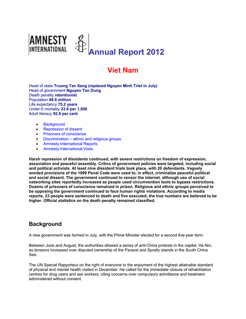 Annual Report 2012 Viet Nam Head of state Truong Tan Sang (replaced Nguyen Minh Triet in July) Head of government Nguyen Tan Dung Death penalty retentionist Population 88.8 million Life expectancy 75.2 years Under-5 mortality 23.6 per 1,000 Adult literacy 92.8 per cent • • • • • • Background Repression of dissent Prisoners of conscience Discrimination – ethnic and religious groups Amnesty International Reports Amnesty International Visits Harsh repression of dissidents continued, with severe restrictions on freedom of expression, association and peaceful assembly. Critics of government policies were targeted, including social and political activists. At least nine dissident trials took place, with 20 defendants. Vaguely worded provisions of the 1999 Penal Code were used to, in effect, criminalize peaceful political and social dissent. The government continued to censor the internet, although use of social networking sites reportedly increased as people used circumvention tools to bypass restrictions. Dozens of prisoners of conscience remained in prison. Religious and ethnic groups perceived to be opposing the government continued to face human rights violations. According to media reports, 23 people were sentenced to death and five executed; the true numbers are believed to be higher. Official statistics on the death penalty remained classified. Background A new government was formed in July, with the Prime Minister elected for a second five-year term. Between June and August, the authorities allowed a series of anti-China protests in the capital, Ha Noi, as tensions increased over disputed ownership of the Paracel and Spratly islands in the South China Sea. The UN Special Rapporteur on the right of everyone to the enjoyment of the highest attainable standard of physical and mental health visited in December. He called for the immediate closure of rehabilitation centres for drug users and sex workers, citing concerns over compulsory admittance and treatment administered without consent. In December, donor countries attending a consultative group meeting in Ha Noi called on the government to improve its human rights record, warning that the ongoing crackdown on dissidents was threatening Viet Nam’s international credibility. Repression of dissent Severe restrictions on freedom of expression and association continued, with dissidents critical of government policies harshly repressed. Individuals most at risk included pro-democracy activists, and those calling for reform or protesting about environmental issues, land and labour rights, and the rights of ethnic and religious minorities. The authorities used vaguely worded provisions of the national security section of the 1999 Penal Code, in particular Article 79 (aiming to “overthrow” the state) and Article 88 (“conducting propaganda” against the state), to punish peaceful dissent. At least nine dissident trials of 20 defendants took place. More than 18 individuals were arrested and in pre-trial detention at the end of the year, including at least 13 Catholic activists supporting dissident Cu Huy Ha Vu. • • Human rights defender, legal scholar and environmental activist Cu Huy Ha Vu was sentenced to seven years’ imprisonment in April under Article 88 of the Penal Code. He had twice submitted criminal complaints against the Prime Minister, once in an attempt to stop a controversial bauxite mining project, and the other challenging the legality of a ban on class-action complaints. Tran Thi Thuy, Pastor Duong Kim Khai and five other land activists were sentenced to between two and eight years’ imprisonment in May by a court in Ben Tre province. They were charged with aiming to “overthrow” the government. Thuy had campaigned for social justice for farmers in the province. Pastor Khai led the “Cattle Shed” Mennonite Church and had helped farmers whose land had been confiscated to petition the authorities. Prisoners of conscience Dozens of prisoners of conscience arrested in previous years remained held after receiving long sentences in unfair trials. Many of them were connected with the online pro-democracy movement Bloc 8406. A small number of prisoners of conscience were released. Dissident writer Tran Khai Thanh Thuy was released in July before the end of her prison term after agreeing to go into exile overseas. Truong Quoc Huy, a mobile phone technician, was released in December, eight months before the end of his six-year prison sentence. Human rights lawyer Nguyen Van Dai was released in March, after serving his four-year sentence. Both men were placed under house arrest for up to four years. • • Father Nguyen Van Ly, a Catholic priest and co-founder of Bloc 8406, was rearrested by police in July and returned to Ba Sao prison in northern Viet Nam. Father Ly’s eight-year prison term was temporarily suspended for 12 months in March 2010 after he had had a stroke in prison and was diagnosed with a brain tumour. The authorities claimed that he was returned to prison for distributing anti-government leaflets while on medical release. Blogger and journalist Nguyen Hoang Hai, co-founder of the independent Free Vietnamese Journalists’ Club and known as Dieu Cay, remained detained on reported charges of “conducting propaganda” against the state. The authorities denied repeated requests from his family and lawyer to visit him. Nor did they respond to appeals for information about his welfare after a security official stated that he had “lost his arm”. Discrimination – ethnic and religious groups Security officials continued to harass and closely monitor members of religious and ethnic groups perceived to be opponents of the government. Disputes continued over land ownership between local authorities and the Catholic Church, in some cases involving unnecessary or excessive use of force by security officials against peaceful protesters. The Supreme Patriarch of the banned Unified Buddhist Churc